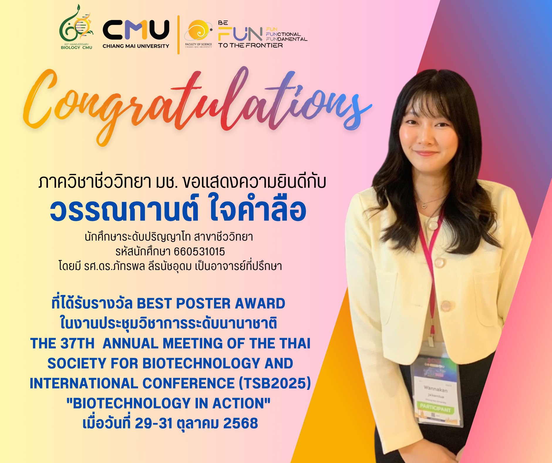 นางสาววรรณกานต์ ใจคำลือ นักศึกษาระดับปริญญาโท สาขาชีววิทยา คณะวิทยาศาสตร์ มหาวิทยาลัยเชียงใหม่ (รศ.ดร.ภัทรพล ลีธนัชอุดม เป็นอาจารย์ที่ปรึกษา) ได้รับรางวัล Best Poster Award ในงานประชุมวิชาการระดับนานาชาติ The 37th Annual Meeting of the Thai Society for Biotechnology and International Conference (TSB2025) "Biotechnology in Action" จัดโดย ภาควิชาจุลชีววิทยา คณะวิทยาศาสตร์ จุฬาลงกรณ์มหาวิทยาลัย สถาบันเทคโนโลยีชีวภาพและพันธุวิศวกรรม จุฬาลงกรณ์มหาวิทยาลัย และสมาคมเทคโนโลยีชีวภาพแห่งประเทศไทย เมื่อวันที่ 29-31 ตุลาคม 2568 ณ โรงแรมแมนดารินกรุงเทพ