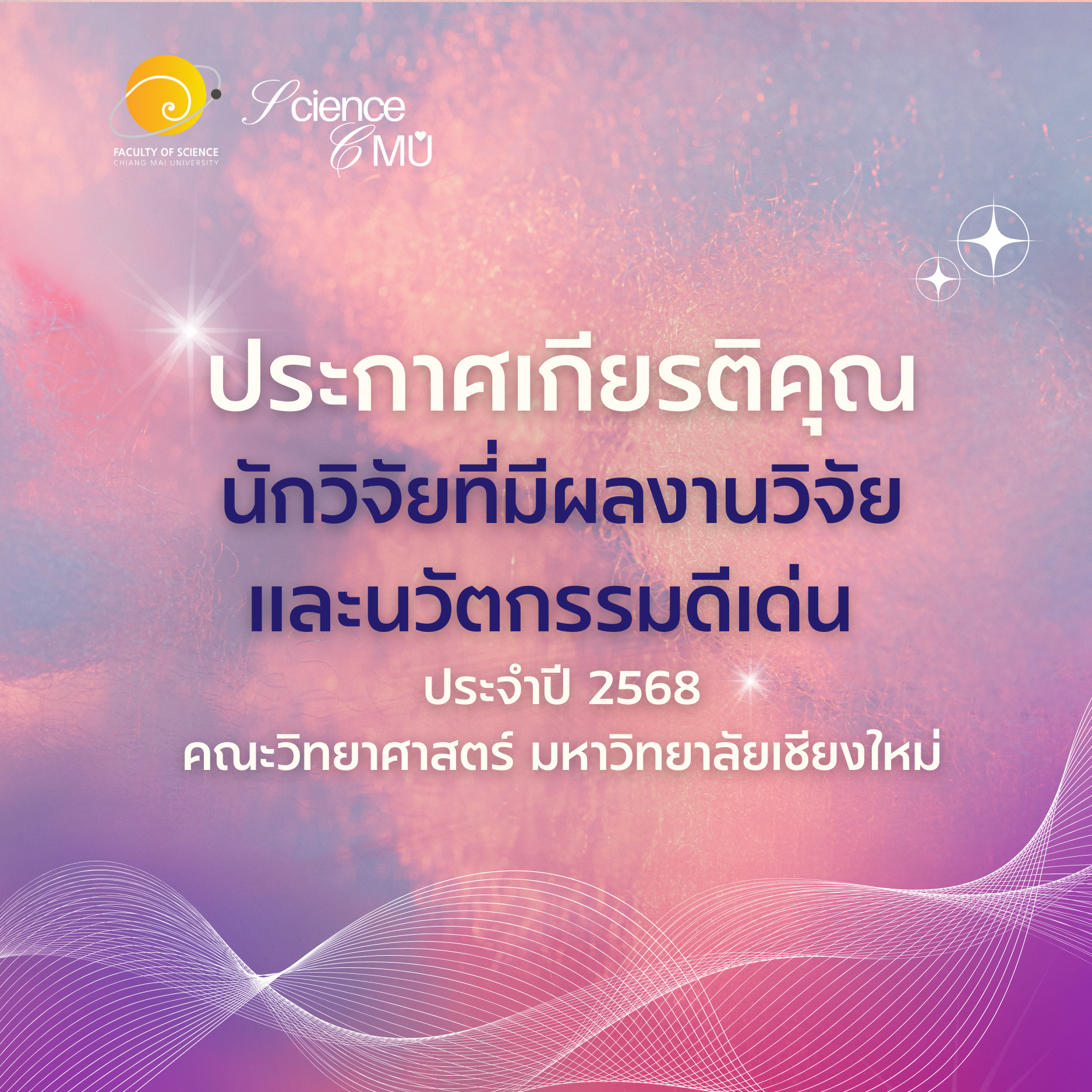 คณะวิทยาศาสตร์ได้ประกาศเกียรติคุณนักวิจัยที่มีผลงานวิจัยและนวัตกรรมดีเด่น เพื่อเป็นการเชิดชูเกียรตินักวิจัยที่มีผลงานวิจัยและนวัตกรรมดีเด่นในด้านต่าง ๆ และเพื่อเป็นขวัญกำลังใจให้แก่นักวิจัยของคณะวิทยาศาสตร์ที่มีส่วนสนับสนุนมหาวิทยาลัยเชียงใหม่ให้ก้าวสู่การเป็นมหาวิทยาลัยวิจัยชั้นนำ ณ วันที่ 18 ธันวาคม 2568 ดังนี้
