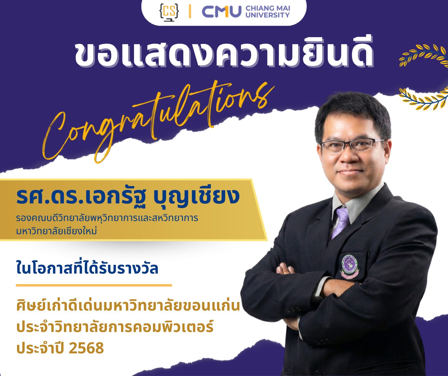 รองศาสตราจารย์ ดร.เอกรัฐ บุญเชียง อาจารย์ประจำภาควิชาวิทยาการคอมพิวเตอร์ คณะวิทยาศาสตร์ ได้รับรางวัล "ศิษย์เก่าดีเด่นมหาวิทยาลัยขอนแก่น ประจำวิทยาลัยการคอมพิวเตอร์ ปี 2568"