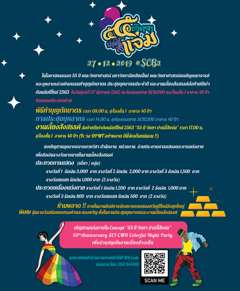 งานเลี้ยงสังสรรค์ ส่งท้ายปีเก่าต้อนรับปีใหม่ 2563 “55 ปี วิทยา ปาร์ตี้สีแจ่ม” 55th Anniversary SCI CMU Colorful Night Party เวลา 17.00 น. @โถงชั้น 1 อาคาร 40 ปีฯ