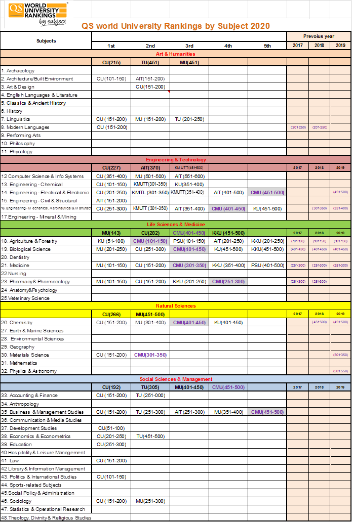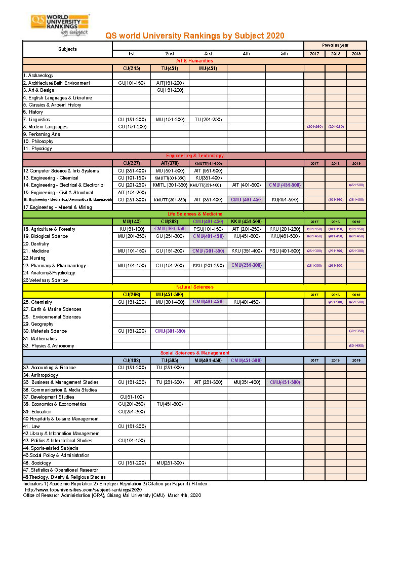 เมื่อวันที่ 4 มีนาคม 2563 ได้มีการประกาศผลการจัดอันดับมหาวิทยาลัยโลกรายสาขาวิชา ประจำปี 2020 โดย QS World University Rankings ซื่งผลปรากฎว่า มหาวิทยาลัยเชียงใหม่มีสาขาติดอันดับโลกในปี 2020 จำนวนทั้งสิ้น 9 สาขา ดีขึ้นกว่าปี 2019 ซึ่งติดอันดับจำนวน 8 สาขา โดยมีตัวชี้วัด 4 ด้าน ประกอบด้วย