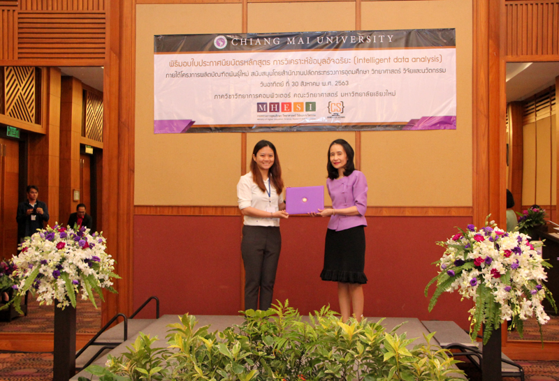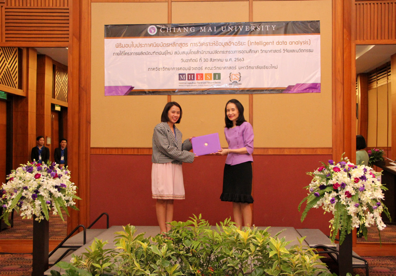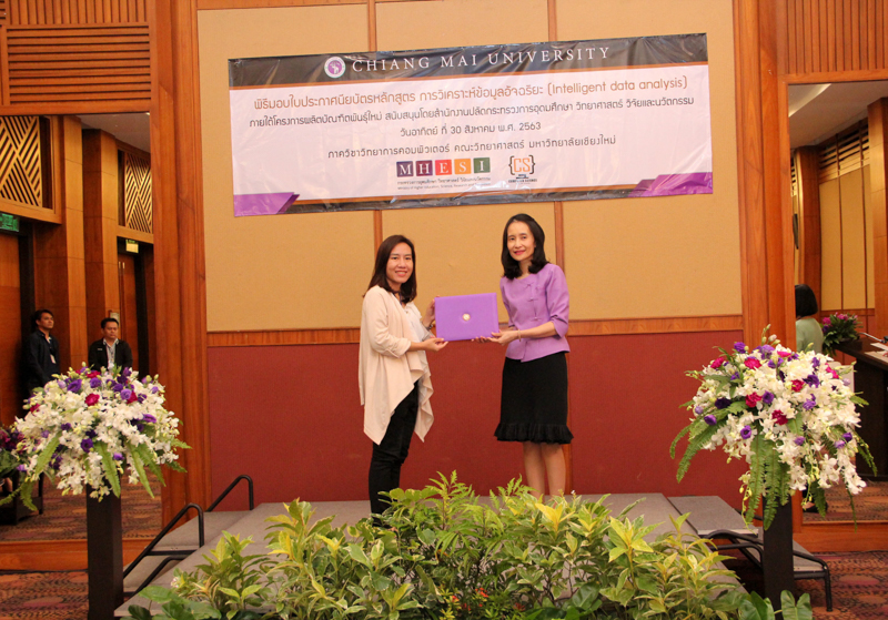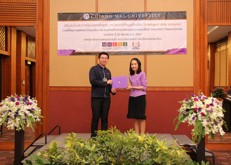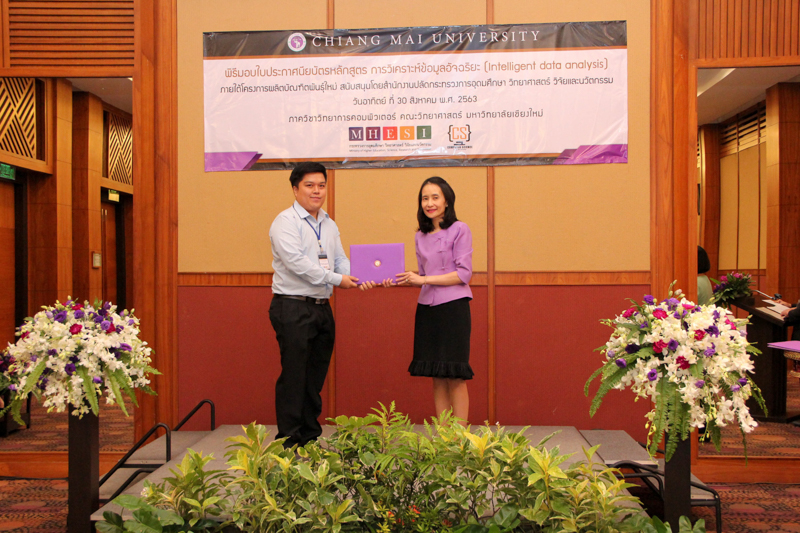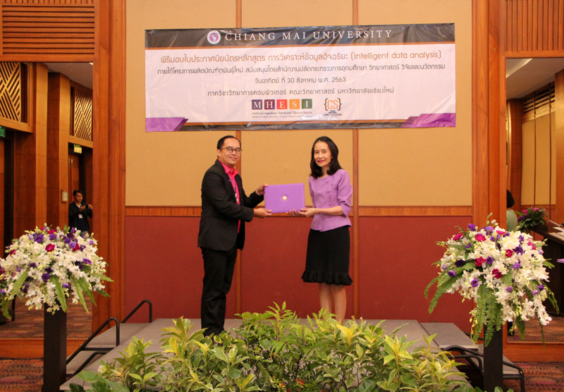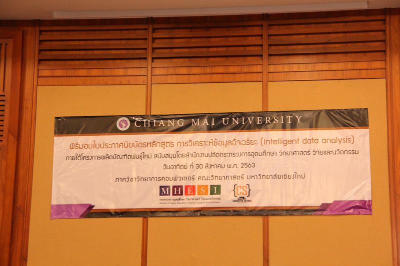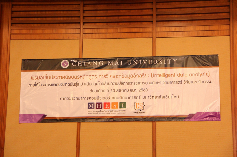 ภาควิชาวิทยาการคอมพิวเตอร์ คณะวิทยาศาสตร์ มหาวิทยาลัยเชียงใหม่ จัดพิธีมอบประกาศนียบัตร และสัมมนาเพื่อรายงานผลการวิจัย ในโครงการผลิตบัณฑิตพันธุ์ใหม่ เพื่อสร้างกำลังคนที่มีสมรรถนะสูง สำหรับอุตสาหกรรม New Growth Engine ตามนโยบาย Thailand 4.0 และการปฏิรูปการอุดมศึกษาไทย ประเภทประกาศนียบัตร (Non-degree) กลุ่มอุตสาหกรรมดิจิทัล หลักสูตรการวิเคราะห์ข้อมูลอัจฉริยะ (Intelligent data analysis) เมื่อวันอาทิตย์ที่ 30 สิงหาคม 2563 ณ Kantary Hills Hotel เชียงใหม่ โดยได้รับเกียรติจาก รองศาสตราจารย์อุษณีย์ คำประกอบ รองอธิการบดีฝ่ายวิชาการ พัฒนาคุณภาพองค์กร และยุทธศาสตร์ผลิตบัณฑิตที่มีคุณธรรม คุณภาพ และมีทักษะการเป็นพลเมืองโลก มหาวิทยาลัยเชียงใหม่ เป็นประธานในพิธี และผู้ช่วยศาสตราจารย์ ดร.ชุรี เตชะวุฒิ หัวหน้าภาควิชาวิทยการคอมพิวเตอร์ คณะวิทยาศาสตร์ กล่าวรายงานความเป็นมาในการจัดงาน