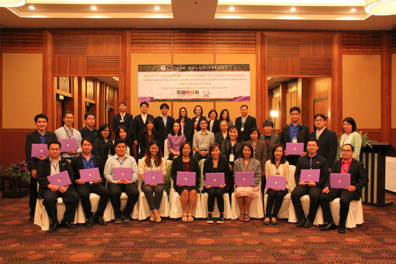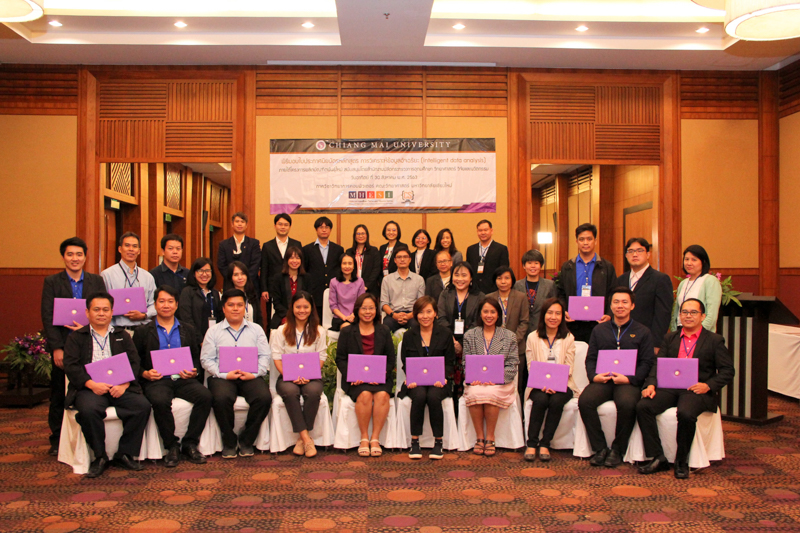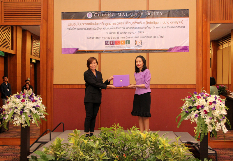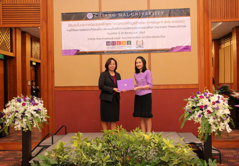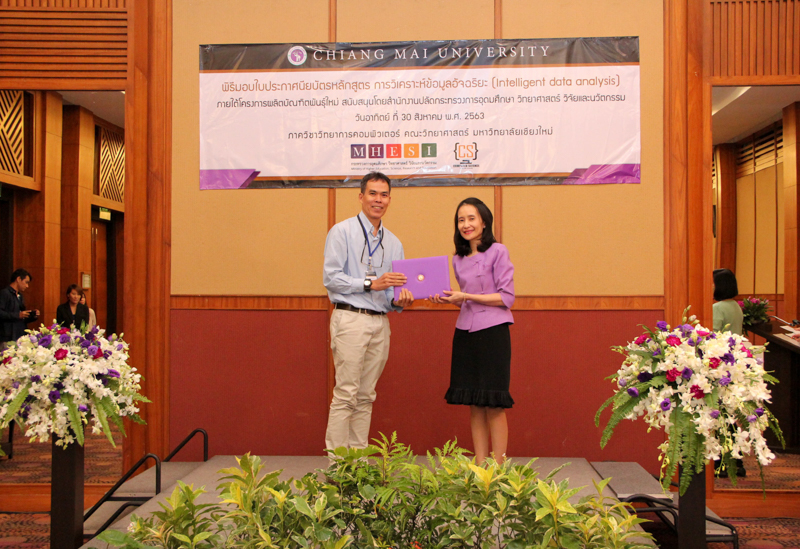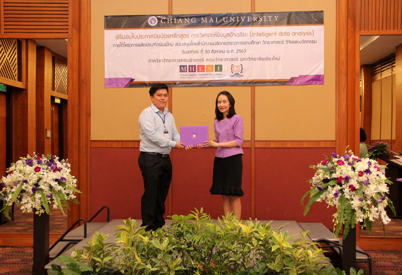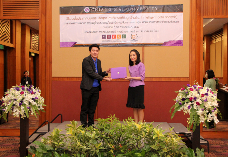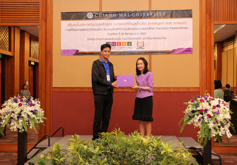 ภาควิชาวิทยาการคอมพิวเตอร์ คณะวิทยาศาสตร์ มหาวิทยาลัยเชียงใหม่ จัดพิธีมอบประกาศนียบัตร และสัมมนาเพื่อรายงานผลการวิจัย ในโครงการผลิตบัณฑิตพันธุ์ใหม่ เพื่อสร้างกำลังคนที่มีสมรรถนะสูง สำหรับอุตสาหกรรม New Growth Engine ตามนโยบาย Thailand 4.0 และการปฏิรูปการอุดมศึกษาไทย ประเภทประกาศนียบัตร (Non-degree) กลุ่มอุตสาหกรรมดิจิทัล หลักสูตรการวิเคราะห์ข้อมูลอัจฉริยะ (Intelligent data analysis) เมื่อวันอาทิตย์ที่ 30 สิงหาคม 2563 ณ Kantary Hills Hotel เชียงใหม่ โดยได้รับเกียรติจาก รองศาสตราจารย์อุษณีย์ คำประกอบ รองอธิการบดีฝ่ายวิชาการ พัฒนาคุณภาพองค์กร และยุทธศาสตร์ผลิตบัณฑิตที่มีคุณธรรม คุณภาพ และมีทักษะการเป็นพลเมืองโลก มหาวิทยาลัยเชียงใหม่ เป็นประธานในพิธี และผู้ช่วยศาสตราจารย์ ดร.ชุรี เตชะวุฒิ หัวหน้าภาควิชาวิทยการคอมพิวเตอร์ คณะวิทยาศาสตร์ กล่าวรายงานความเป็นมาในการจัดงาน