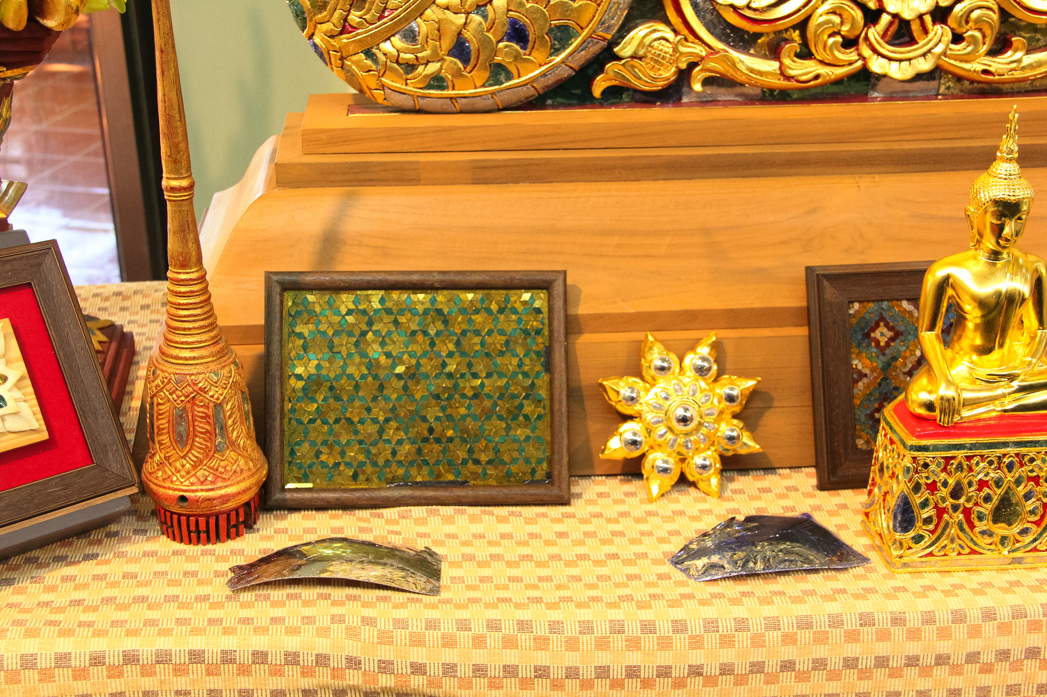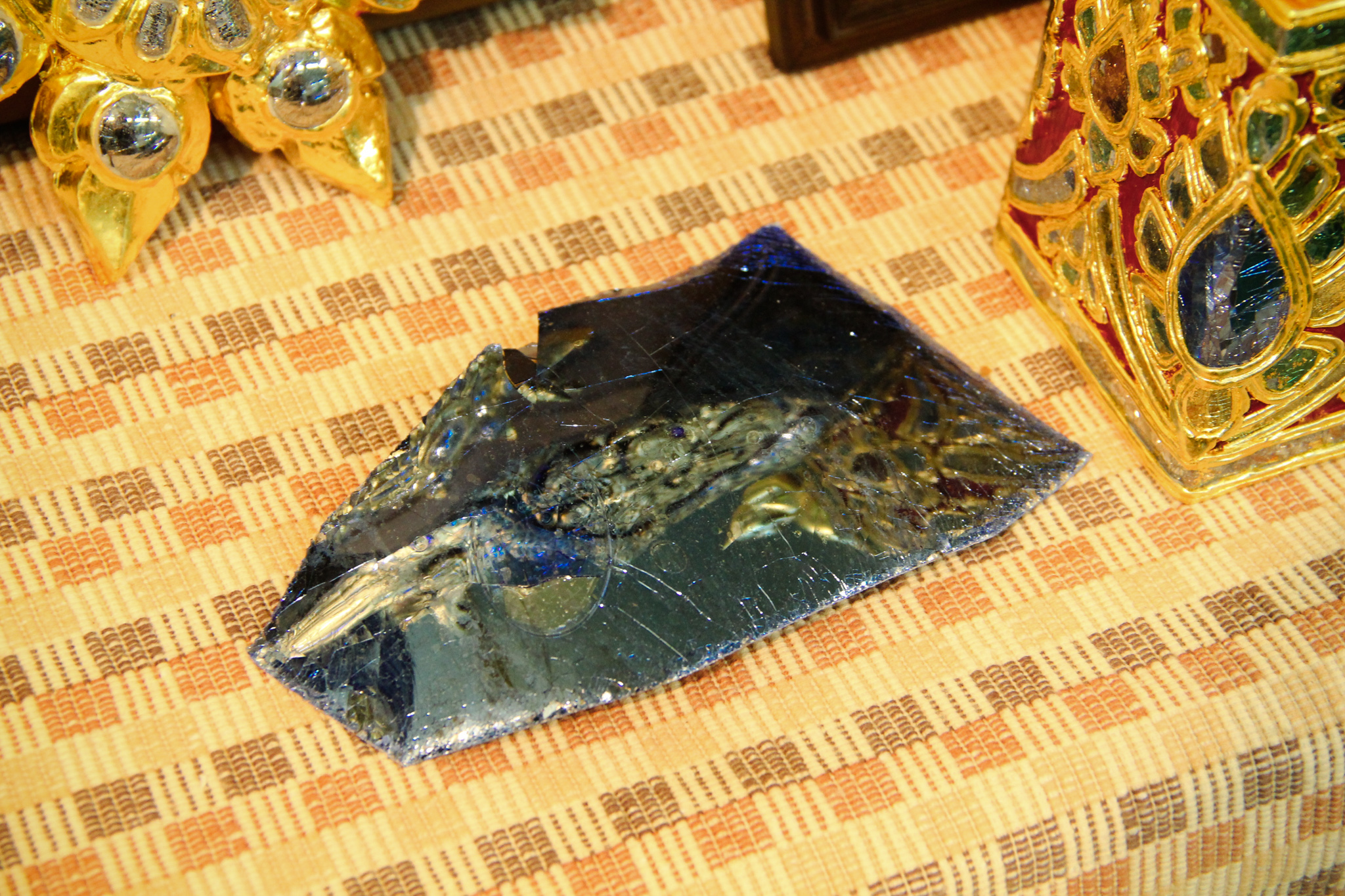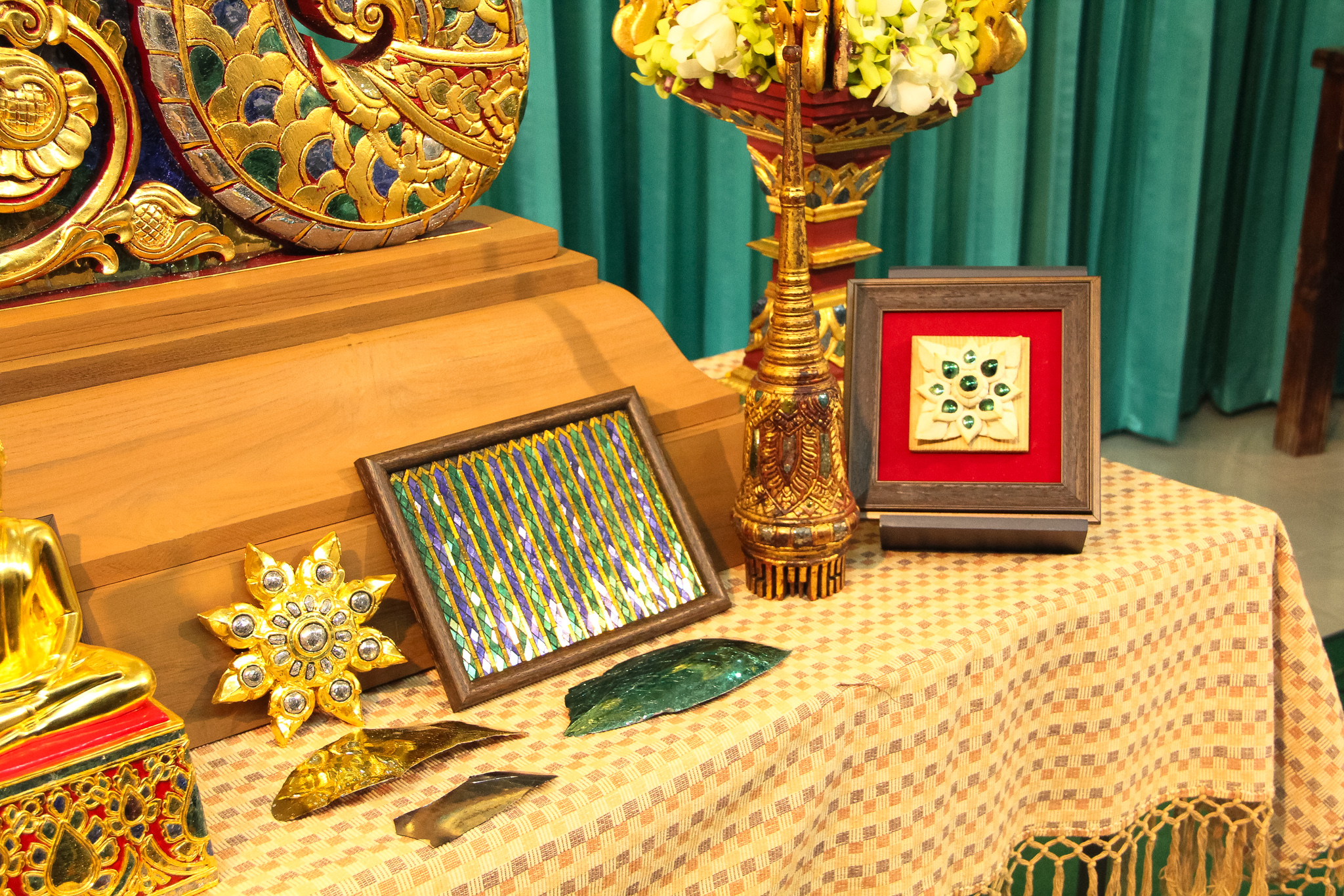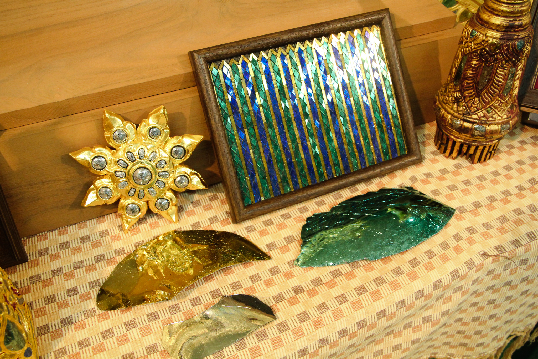 และเมื่อวันที่ 9 ธันวาคม 2563 วช. ได้ถวายสัตภัณฑ์ที่ประดับกระจกจืน ซึ่งเป็นกระจกที่ได้จากงานวิจัย ณ วัดช่างฆ้อง อำเภอเมือง จังหวัดเชียงใหม่ โดยได้รับความร่วมมือจาก ศิลปิน “ฝุ่น หอสูง” นายชาญยุทธ โตบัณฑิต ออกแบบและสร้างสัตภัณฑ์ เป็นความสำเร็จอย่างเป็นรูปธรรมของการนำผลงานวิจัยจากห้องปฏิบัติการ ที่สามารถต่อยอดทั้งเชิงพาณิชย์และสามารถนำไปทำนุบำรุงศิลปวัฒนธรรมของประเทศไทย เพื่อรักษามรดกอันทรงคุณค่าให้คงอยู่เคียงคู่คนไทยสืบไป