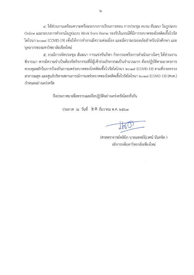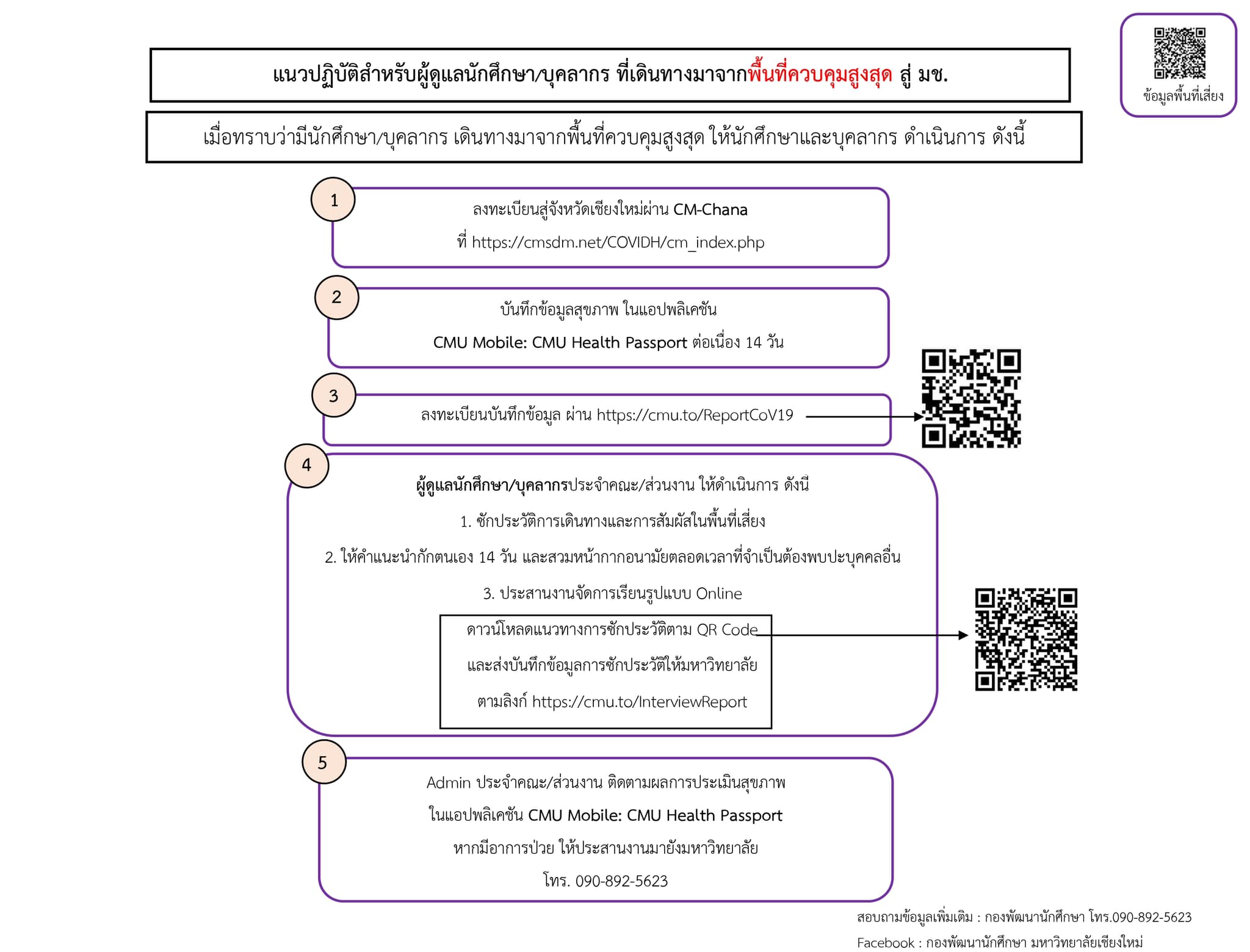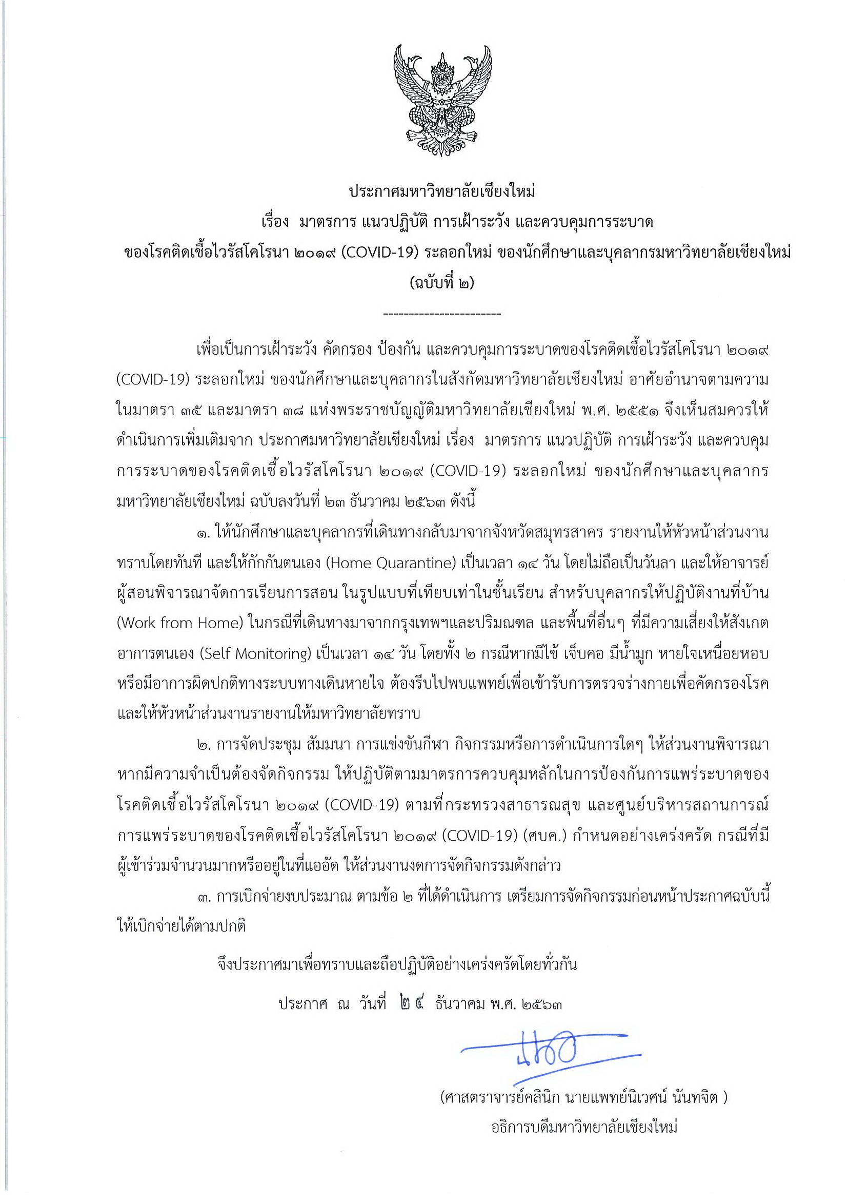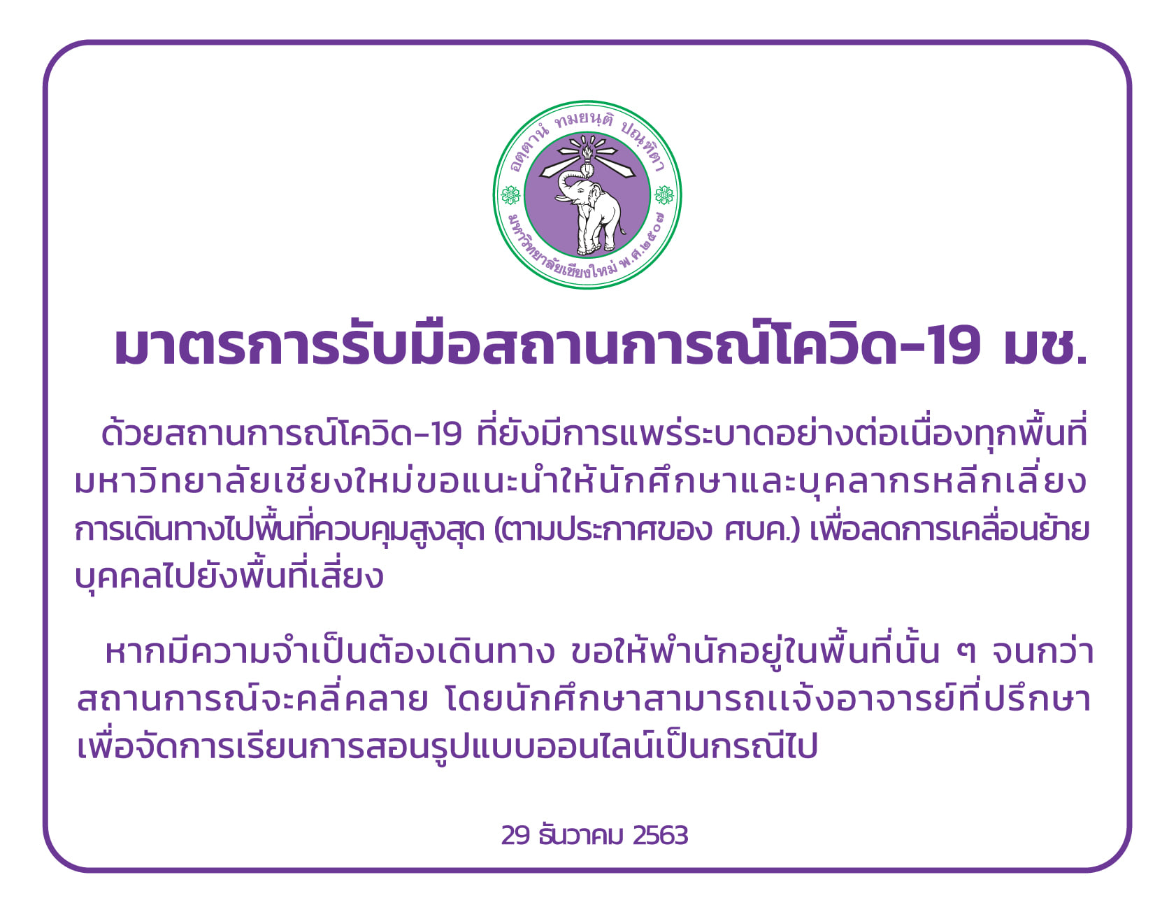 คณะวิทยาศาสตร์ ขอความร่วมมือบุคลากรคณะวิทยาศาสตร์ปฏิบัติตามประกาศ มช. เรื่อง มาตรการแนวปฏิบัติ การเฝ้าระวัง และควบคุมการระบาดของโรคติดเชื้อไวรัสโคโรนา 2019 (COVID-19) ระลอกใหม่ (ฉบับที่ 1 และฉบับที่ 2) ข้อ 1 โดยให้บุคลากรที่เดินทางกลับจากจังหวัดสมุทรสาคร และจังหวัดพื้นที่ควบคุมสูงสุด หรือพื้นที่เฝ้าระวังสูง ตามประกาศของกระทรวงสาธารณสุข หรือจังหวัดเชียงใหม่ รายงานหัวหน้าส่วนงานทราบโดยทันที