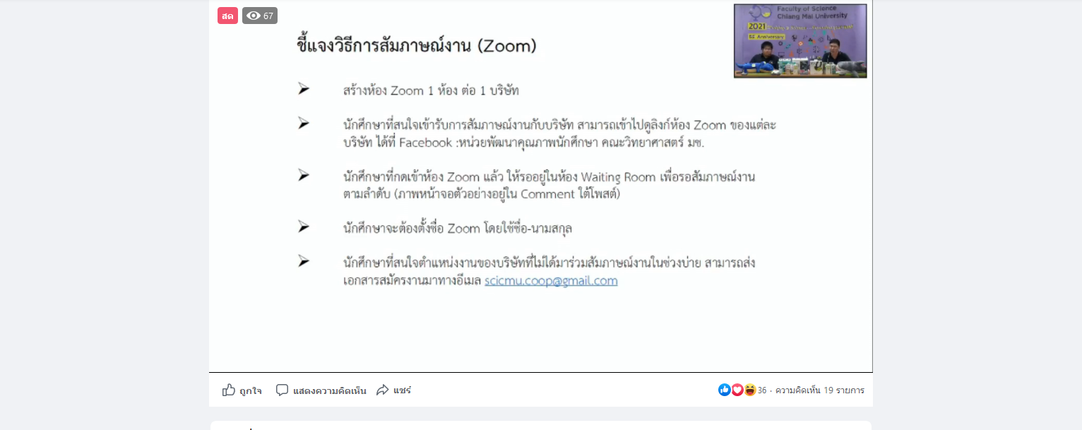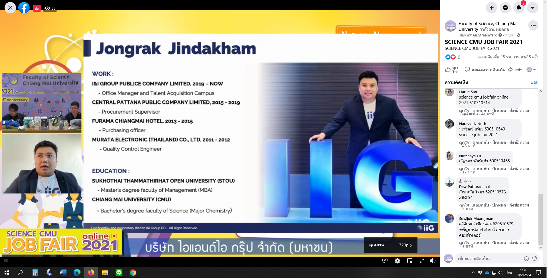 คณะวิทยาศาสตร์จัดงาน Science CMU Job Fair Online 2021 เมื่อวันที่ 10 กุมภาพันธ์ 2564 ผ่านช่องทาง Facebook Live : Faculty of Science, Chiang Mai University เพื่อเป็นช่องทางในการหางาน หรือหาแหล่งฝึกงานและสหกิจศึกษา สำหรับนักศึกษา ศิษย์เก่า และผู้สนใจทั่วไป ในยุค New Normal โดยได้รับเกียรติจาก ศาสตราจารย์ ดร.ธรณินทร์ ไชยเรืองศรี คณบดีคณะวิทยาศาสตร์ เป็นประธานเปิดงาน