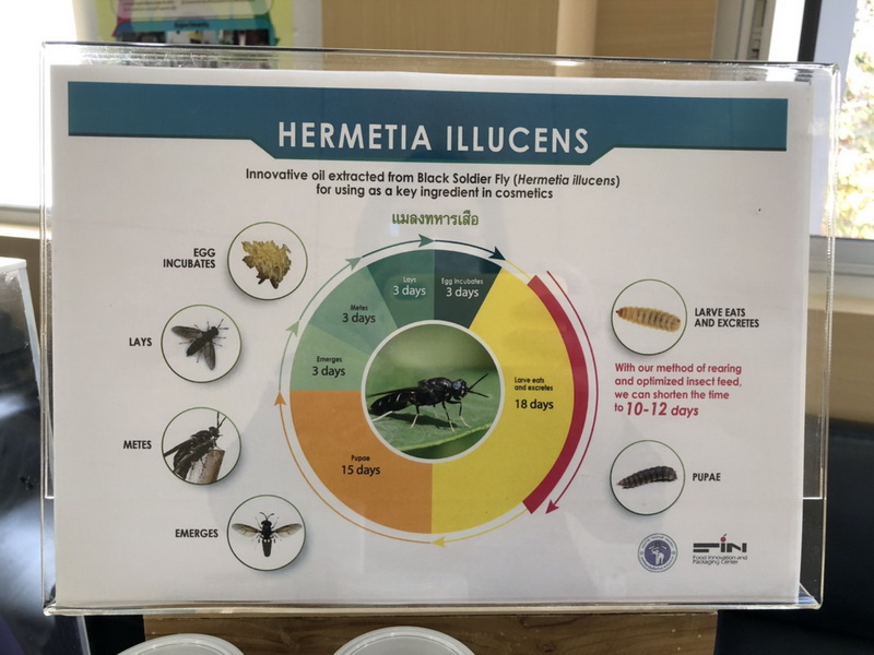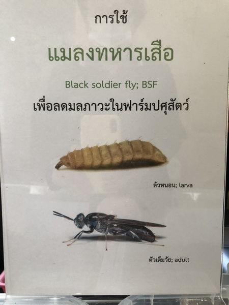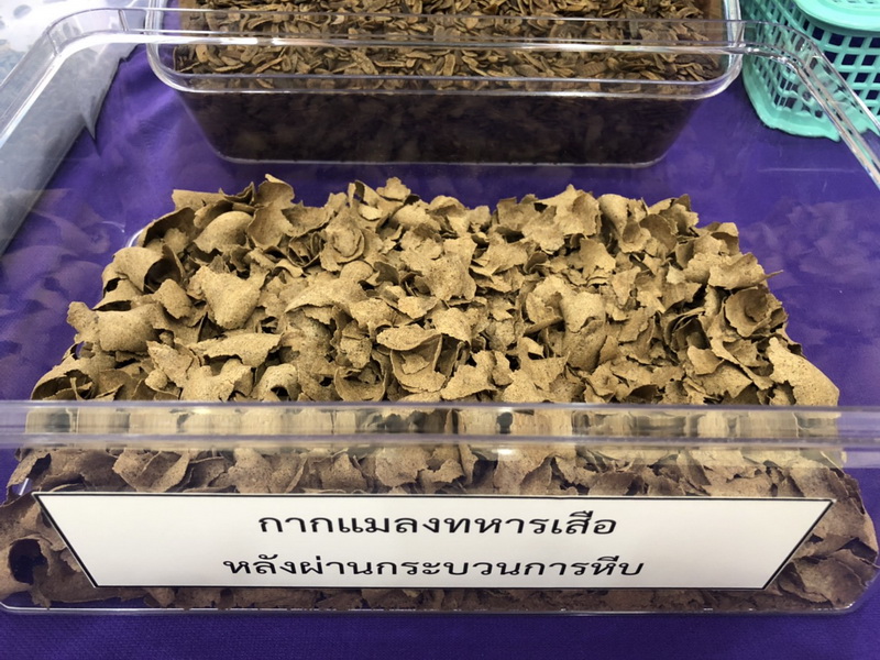 สำหรับ แมลงทหารเสือ Black soldier fly: Hermetia illucens (เฮอมิเทีย อิลลูเซ้นส์) เป็นแมลงที่มีศักยภาพและกำลังได้รับความสนใจจากทั่วโลก และตัวอ่อนแมลง (Larvae) สามารถเปลี่ยนอินทรียวัตถุ ให้เป็นโปรตีนและไขมันได้ และมีอัตราการผลิตโปรตีนต่อนำหนักต่ำ รวมถึงการใช้น้ำในการเลี้ยงน้อยมากเมื่อเปรียบเทียบกับแหล่งโปรตีนชนิดอื่นๆ ทั่วไป โดยสามารถคัดเลือกของเหลือใช้ทางการเกษตรและผลผลิตส่วนเกินที่เป็นแหล่งชีวภาพที่เหมาะสม มาพัฒนาการเลี้ยงให้ที่มาตรฐาน เพื่อสร้างรายได้ให้กับเกษตรกร จากการนำผลิตผลทางการเกษตรเหลือใช้มาสร้างมูลค่า