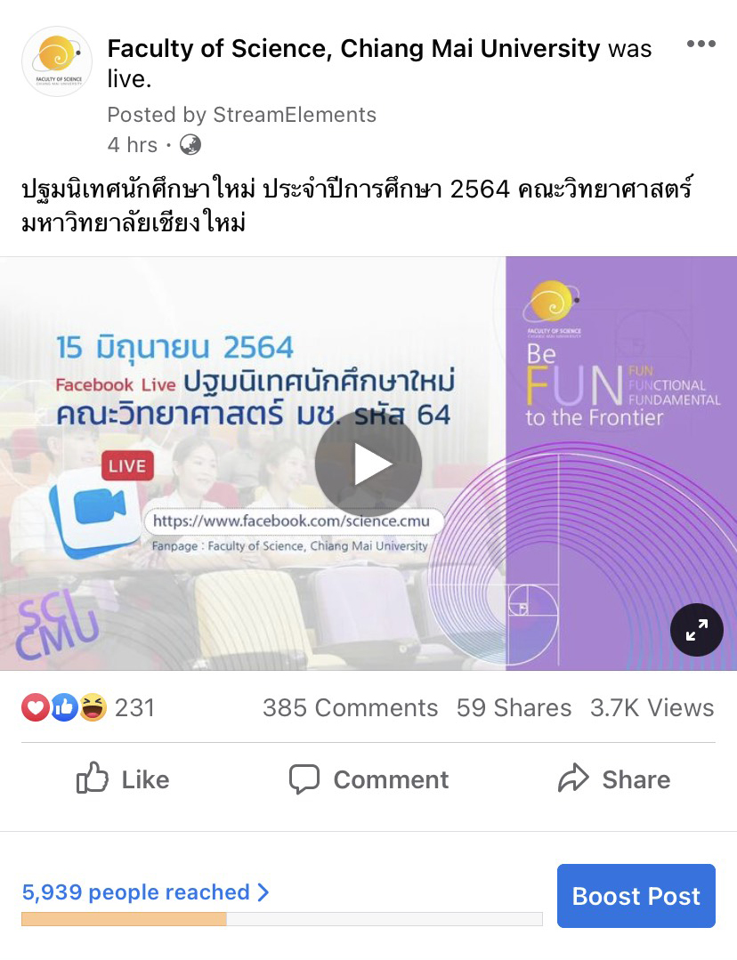 เมื่อวันที่ 15 มิถุนายน 2564 คณะวิทยาศาสตร์จัดกิจกรรมปฐมนิเทศนักศึกษาใหม่ รหัส 64 แบบออนไลน์ ผ่าน Facebook Live คณะวิทยาศาสตร์ เพื่อให้ข้อมูลเกี่ยวกับหลักสูตร การเรียนการสอน การใช้ชีวิตในรั้วมหาวิทยาลัย ตลอดจนการทำกิจกรรมต่างๆ รวมทั้งตอบข้อซักถามและข้อสงสัยของนักศึกษาใหม่ เพื่อเตรียมความพร้อมก่อนเปิดเทอม