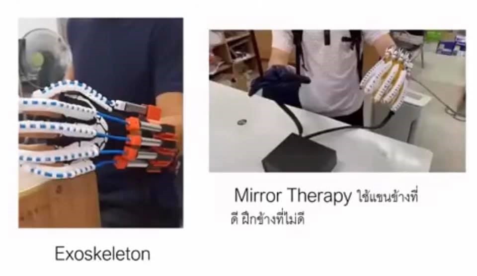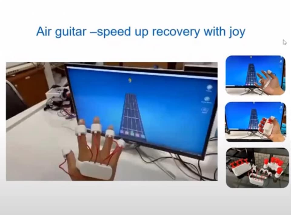 นวัตกรรม Air guitar เป็น Software Package game รวมกับอุปกรณ์ที่สามารถเพิ่มประสิทธิภาพของการฝึกนิ้วมือของผู้ป่วยที่มีอาการอ่อนแรงจากโรคทางระบบประสาทผ่านการใช้การจำลองการเล่นกีตาร์เสมือนโดยสามารถเพิ่มแรงต้านให้แก่นิ้วมือได้ตามระดับความพิการ นอกจากนี้ยังสามารถใช้วัดความคล่องตัวของมือ โดยวัดได้ทั้งพิสัย ความเร็ว และความแข็งแรงซึ่งข้อมูลเหล่านี้จะเก็บรวบรวมแล้วส่งให้แพทย์หรือนักกิจกรรมบำบัดที่ดูแลคนไข้อยู่ ซึ่งจะทำให้คนไข้สามารถฝึกได้ที่บ้านไม่ต้องเดินทางมาโรงพยาบาลและแพทย์สามารถติดตามผลได้ ทำให้สามารถดูแลคนไข้ได้มากขึ้น นอกจากนี้ยังทำให้คนไข้เห็นพัฒนาการของตัวเอง ทำให้การฟื้นฟูสมรรถภาพคนไข้มีเป้าหมายที่ชัดเจนและสร้างแรงจูงใจให้ผู้ป่วยฝึกได้ต่อเนื่อง