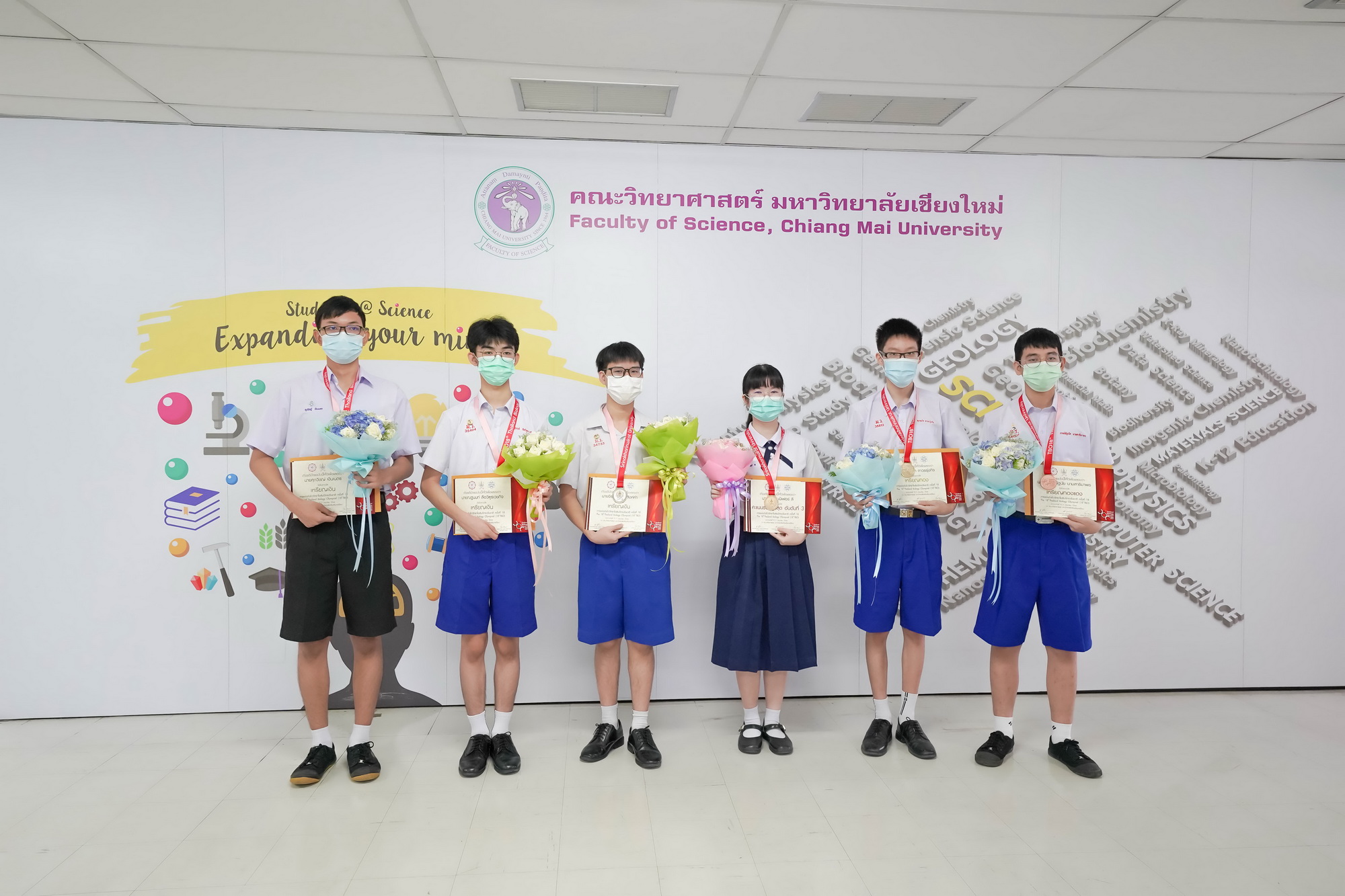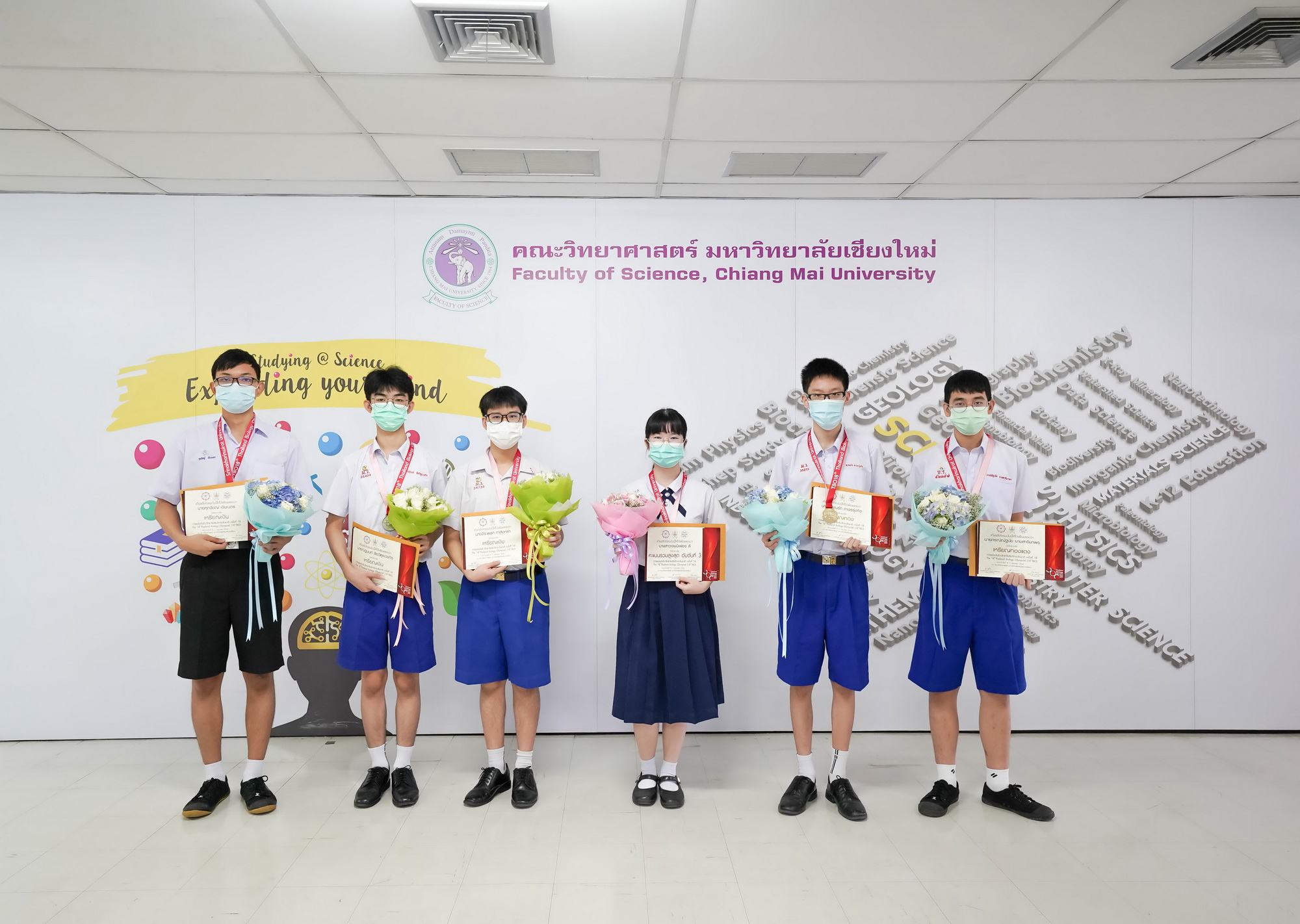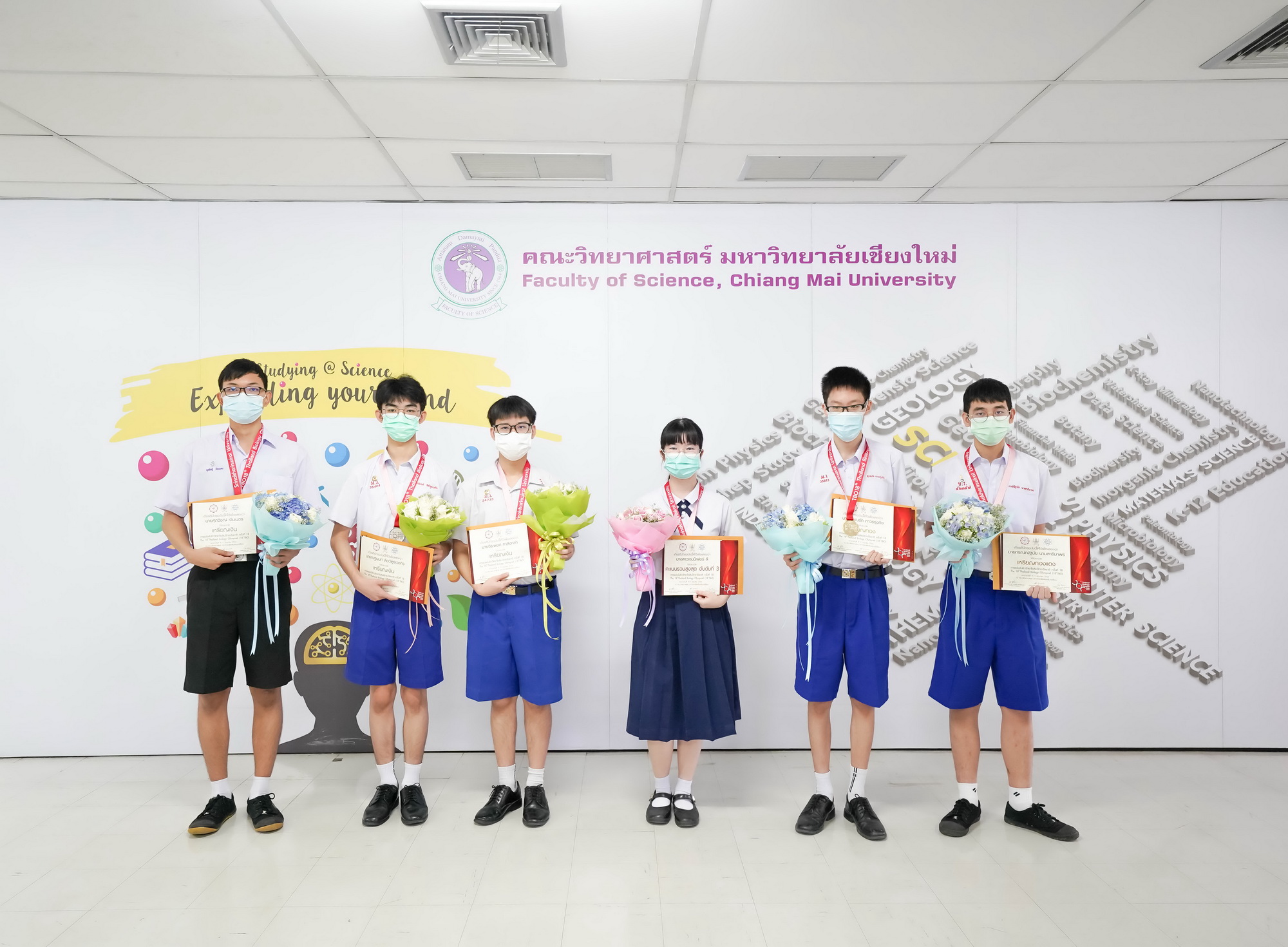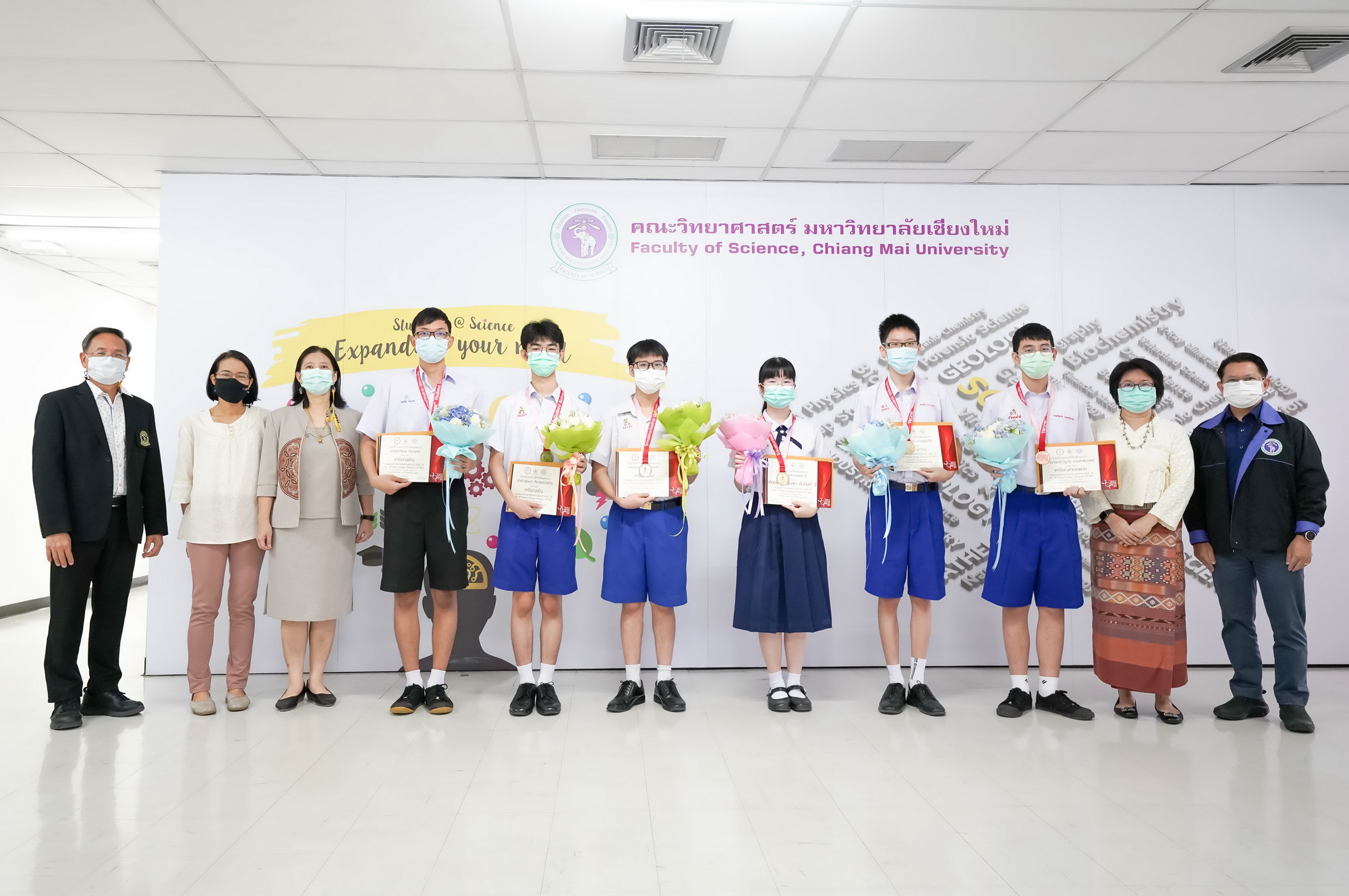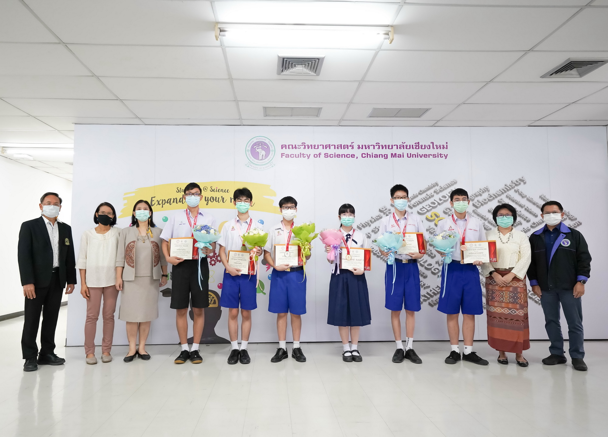 วันที่ 22 กรกฎาคม 2564 คณะวิทยาศาสตร์จัดพิธีมอบเกียรติบัตร เหรียญรางวัล และช่อดอกไม้ เพื่อแสดงความยินดีกับนักเรียนผู้แทนศูนย์ สอวน. มหาวิทยาลัยเชียงใหม่ ที่เข้าร่วมการแข่งขันชีววิทยาโอลิมปิกระดับชาติ ครั้งที่ 18 (18th Thailand Biology Olympiad: 18th TBO) ระหว่างวันที่ 8-11 มิถุนายน 2564 ซึ่งจัดโดยมหาวิทยาลัยศรีนครินทรวิโรฒ ในรูปแบบออนไลน์ โดยมีผู้ช่วยศาสตราจารย์ ดร.ภควรรณ พวงสมบัติ รองคณบดีฝ่ายวิชาการ คณะวิทยาศาสตร์ พร้อมด้วย รองศาสตราจารย์ ดร.หทัยชนก เนียมทรัพย์ รองคณบดีฝ่ายบริหาร ผู้ช่วยศาสตราจารย์ ดร.ชิตชล ผลารักษ์ หัวหน้าภาควิชาชีววิทยา ผู้ช่วยศาสตราจารย์ ดร.สิริพร โรจน์อารยานนท์ ประธานสาขาชีววิทยา ศูนย์ สอวน. มหาวิทยาลัยเชียงใหม่ และนายพร พรมมหาราช เลขานุการคณะวิทยาศาสตร์ ร่วมมอบเกียรติบัตร เหรียญรางวัล และช่อดอกไม้ ให้กับนักเรียนผู้แทนศูนย์ สอวน. มหาวิทยาลัยเชียงใหม่ จำนวน 6 คน ที่เข้าร่วมการแข่งขัน ซึ่งมีผู้เข้าแข่งขันทั้งสิ้น 95 คน จาก 13 ศูนย์ทั่วประเทศ และมีผลการแข่งขัน ดังนี้
