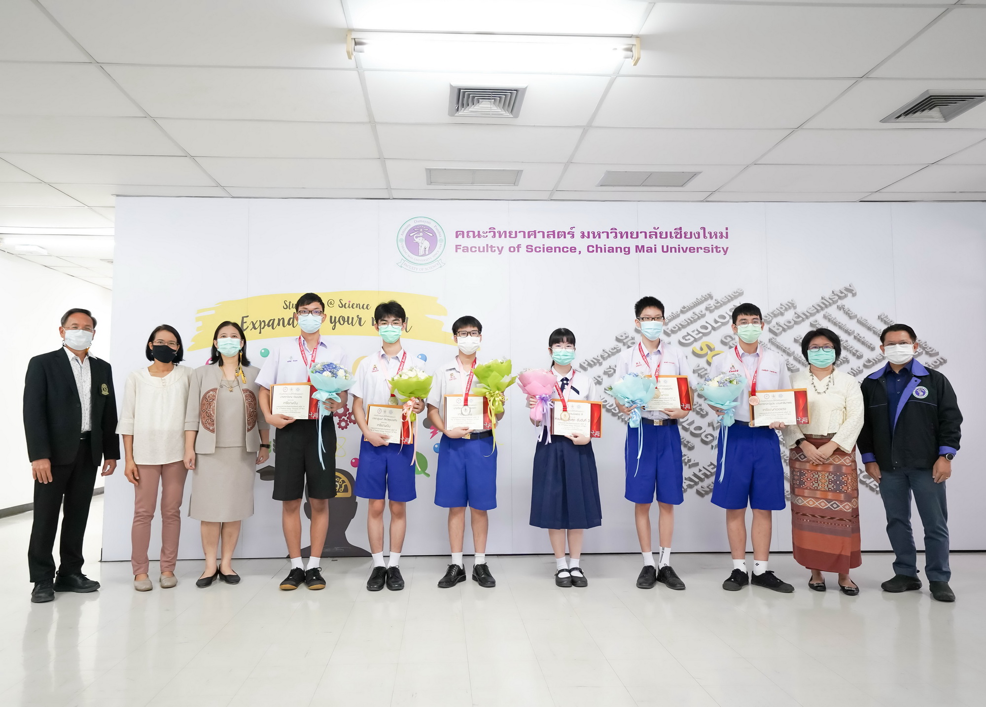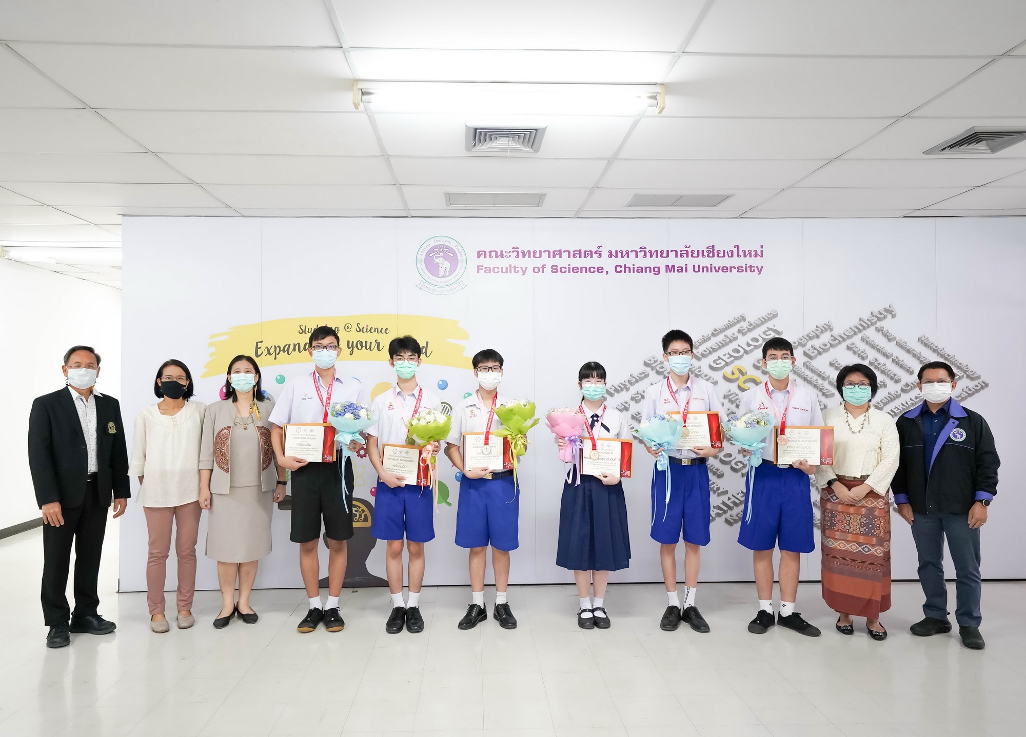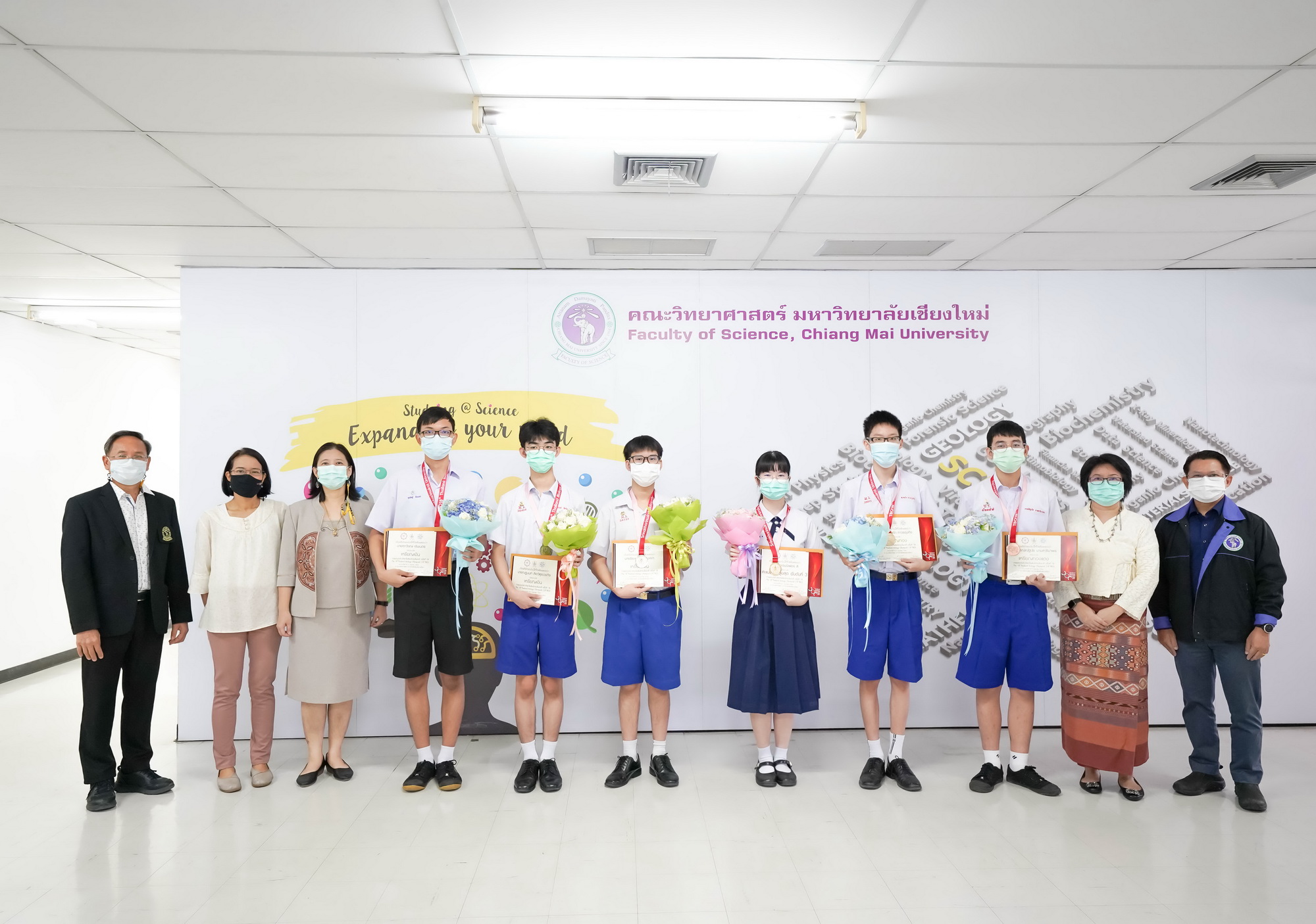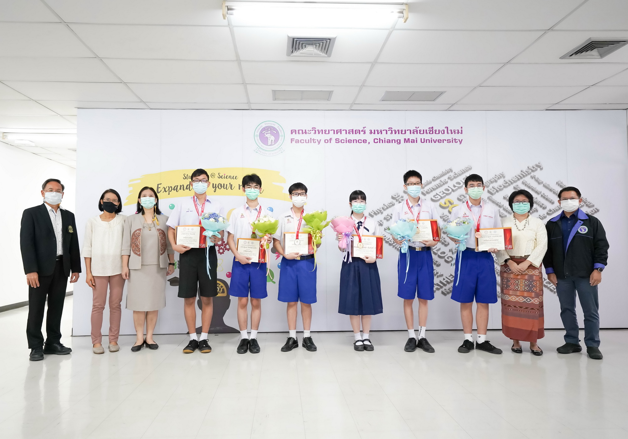 วันที่ 22 กรกฎาคม 2564 คณะวิทยาศาสตร์จัดพิธีมอบเกียรติบัตร เหรียญรางวัล และช่อดอกไม้ เพื่อแสดงความยินดีกับนักเรียนผู้แทนศูนย์ สอวน. มหาวิทยาลัยเชียงใหม่ ที่เข้าร่วมการแข่งขันชีววิทยาโอลิมปิกระดับชาติ ครั้งที่ 18 (18th Thailand Biology Olympiad: 18th TBO) ระหว่างวันที่ 8-11 มิถุนายน 2564 ซึ่งจัดโดยมหาวิทยาลัยศรีนครินทรวิโรฒ ในรูปแบบออนไลน์ โดยมีผู้ช่วยศาสตราจารย์ ดร.ภควรรณ พวงสมบัติ รองคณบดีฝ่ายวิชาการ คณะวิทยาศาสตร์ พร้อมด้วย รองศาสตราจารย์ ดร.หทัยชนก เนียมทรัพย์ รองคณบดีฝ่ายบริหาร ผู้ช่วยศาสตราจารย์ ดร.ชิตชล ผลารักษ์ หัวหน้าภาควิชาชีววิทยา ผู้ช่วยศาสตราจารย์ ดร.สิริพร โรจน์อารยานนท์ ประธานสาขาชีววิทยา ศูนย์ สอวน. มหาวิทยาลัยเชียงใหม่ และนายพร พรมมหาราช เลขานุการคณะวิทยาศาสตร์ ร่วมมอบเกียรติบัตร เหรียญรางวัล และช่อดอกไม้ ให้กับนักเรียนผู้แทนศูนย์ สอวน. มหาวิทยาลัยเชียงใหม่ จำนวน 6 คน ที่เข้าร่วมการแข่งขัน ซึ่งมีผู้เข้าแข่งขันทั้งสิ้น 95 คน จาก 13 ศูนย์ทั่วประเทศ และมีผลการแข่งขัน ดังนี้
