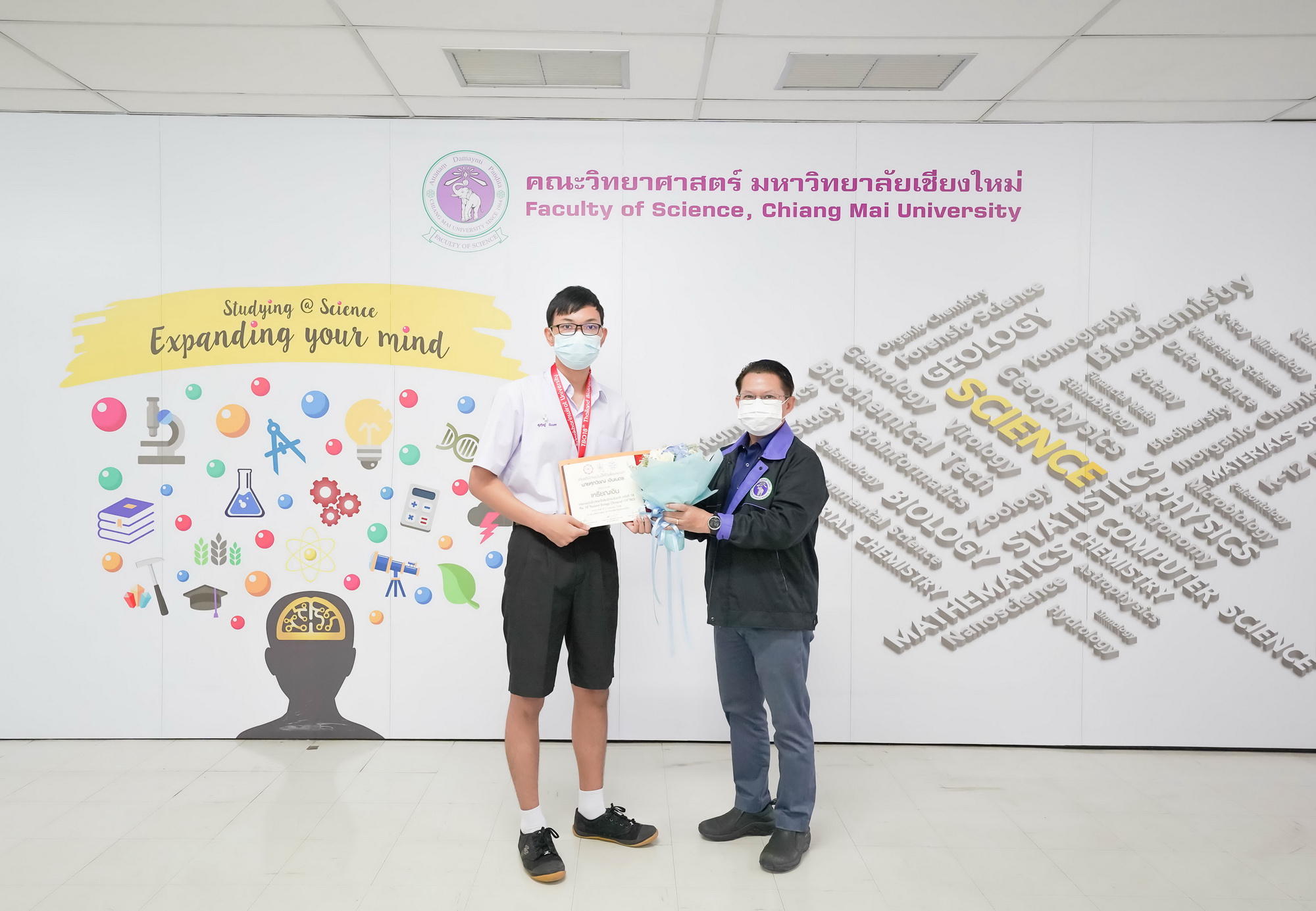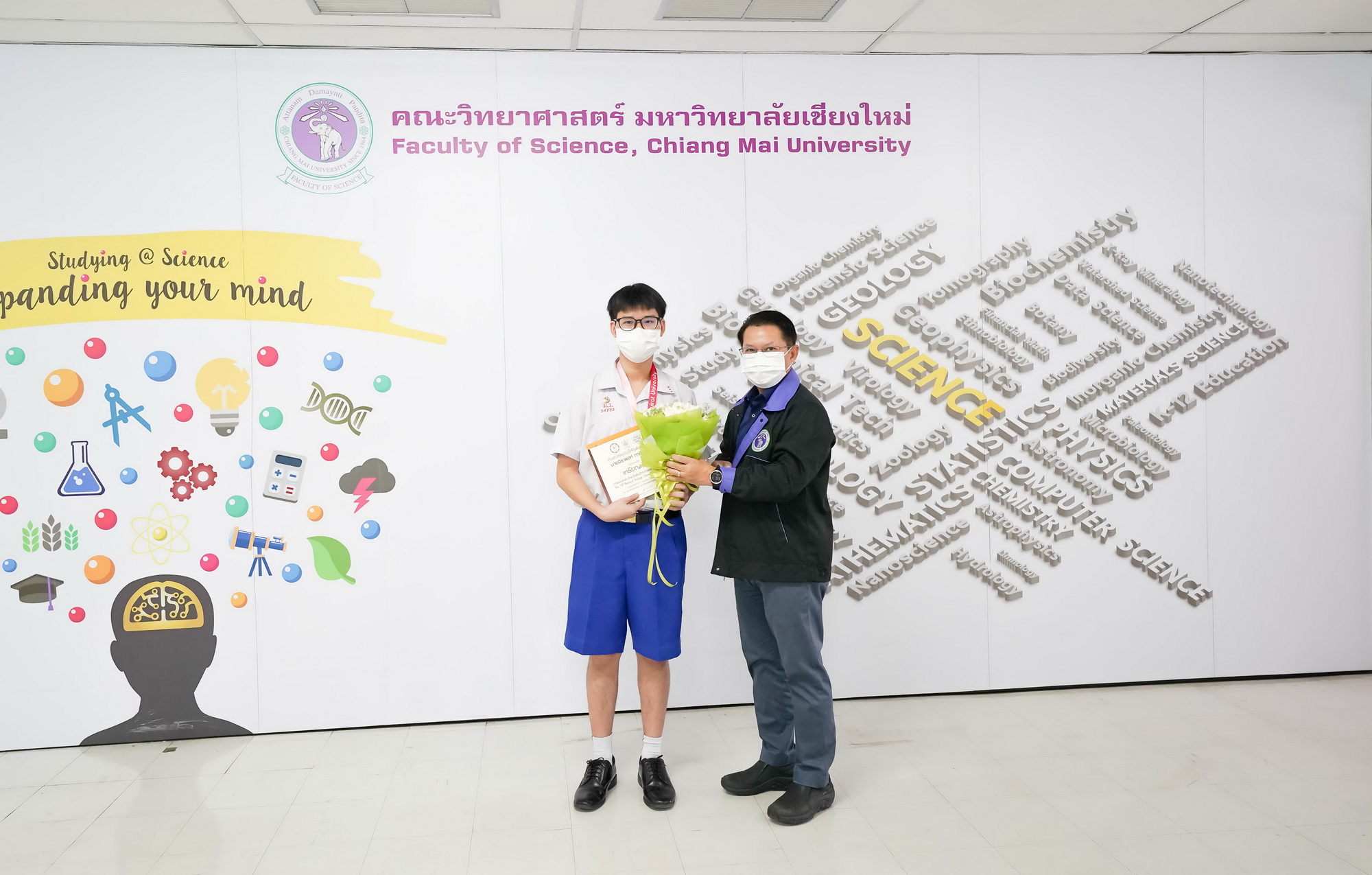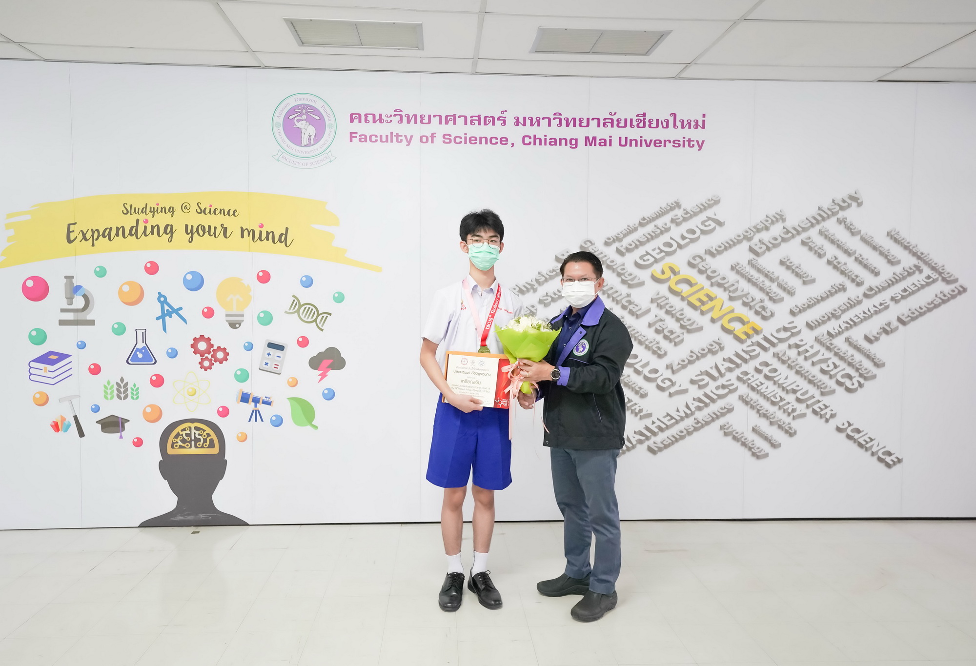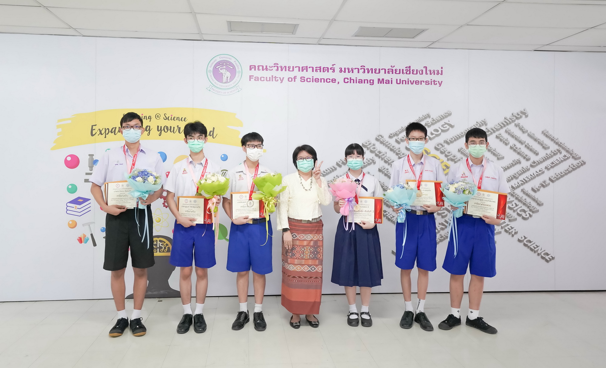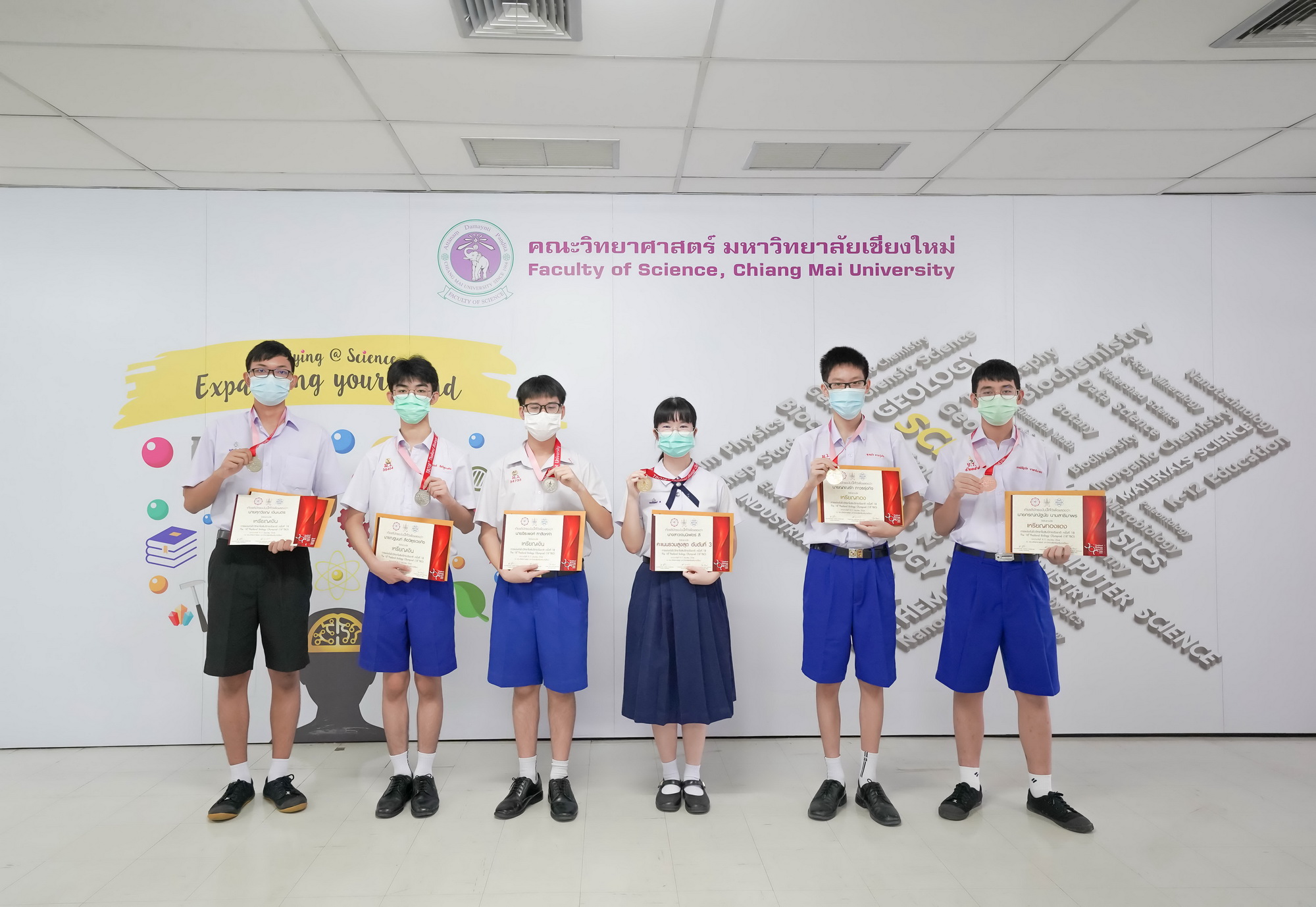 วันที่ 22 กรกฎาคม 2564 คณะวิทยาศาสตร์จัดพิธีมอบเกียรติบัตร เหรียญรางวัล และช่อดอกไม้ เพื่อแสดงความยินดีกับนักเรียนผู้แทนศูนย์ สอวน. มหาวิทยาลัยเชียงใหม่ ที่เข้าร่วมการแข่งขันชีววิทยาโอลิมปิกระดับชาติ ครั้งที่ 18 (18th Thailand Biology Olympiad: 18th TBO) ระหว่างวันที่ 8-11 มิถุนายน 2564 ซึ่งจัดโดยมหาวิทยาลัยศรีนครินทรวิโรฒ ในรูปแบบออนไลน์ โดยมีผู้ช่วยศาสตราจารย์ ดร.ภควรรณ พวงสมบัติ รองคณบดีฝ่ายวิชาการ คณะวิทยาศาสตร์ พร้อมด้วย รองศาสตราจารย์ ดร.หทัยชนก เนียมทรัพย์ รองคณบดีฝ่ายบริหาร ผู้ช่วยศาสตราจารย์ ดร.ชิตชล ผลารักษ์ หัวหน้าภาควิชาชีววิทยา ผู้ช่วยศาสตราจารย์ ดร.สิริพร โรจน์อารยานนท์ ประธานสาขาชีววิทยา ศูนย์ สอวน. มหาวิทยาลัยเชียงใหม่ และนายพร พรมมหาราช เลขานุการคณะวิทยาศาสตร์ ร่วมมอบเกียรติบัตร เหรียญรางวัล และช่อดอกไม้ ให้กับนักเรียนผู้แทนศูนย์ สอวน. มหาวิทยาลัยเชียงใหม่ จำนวน 6 คน ที่เข้าร่วมการแข่งขัน ซึ่งมีผู้เข้าแข่งขันทั้งสิ้น 95 คน จาก 13 ศูนย์ทั่วประเทศ และมีผลการแข่งขัน ดังนี้