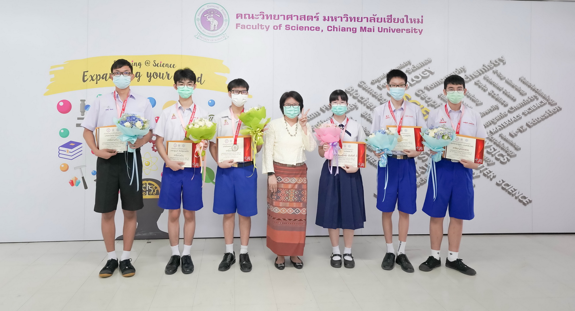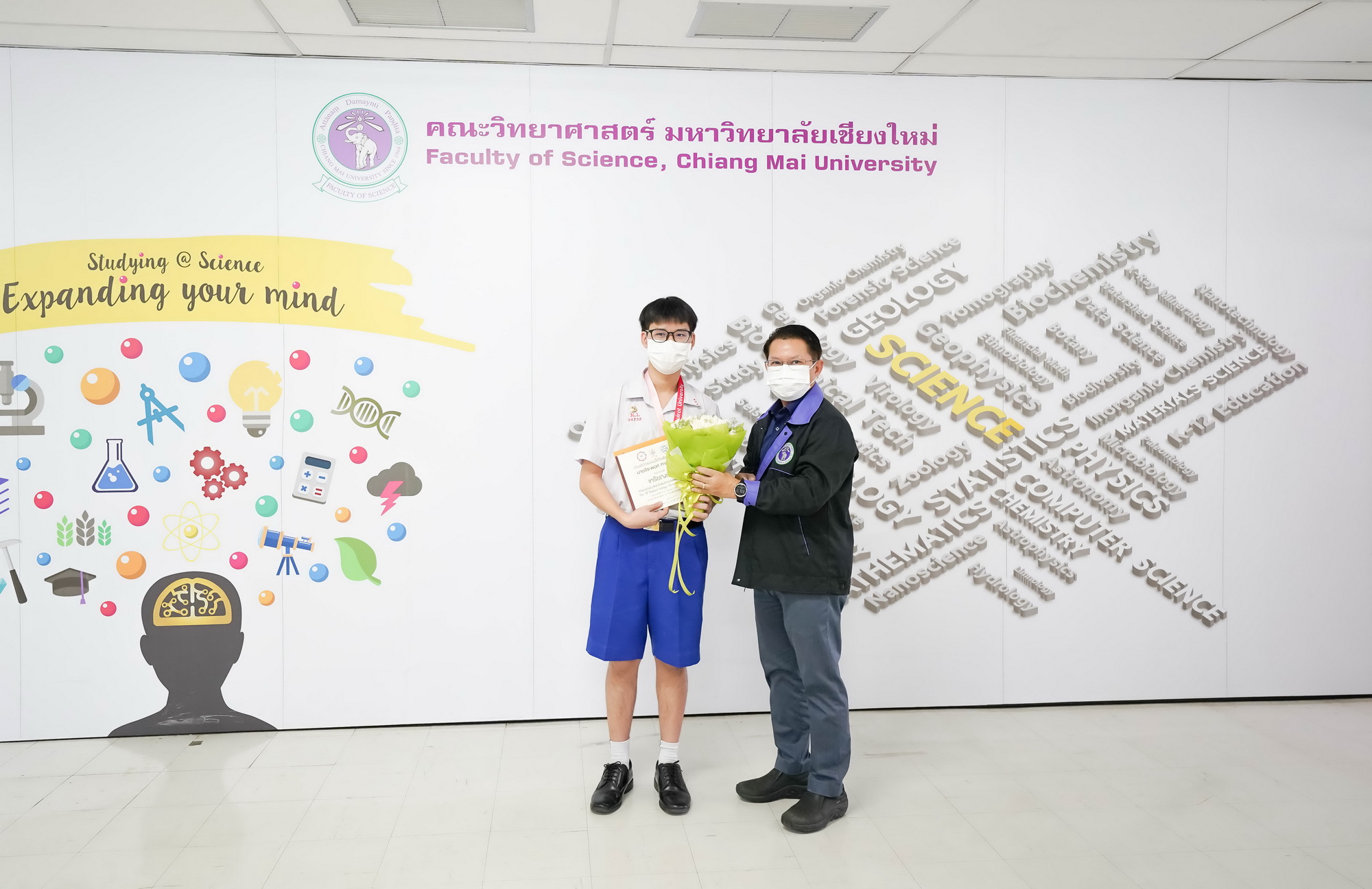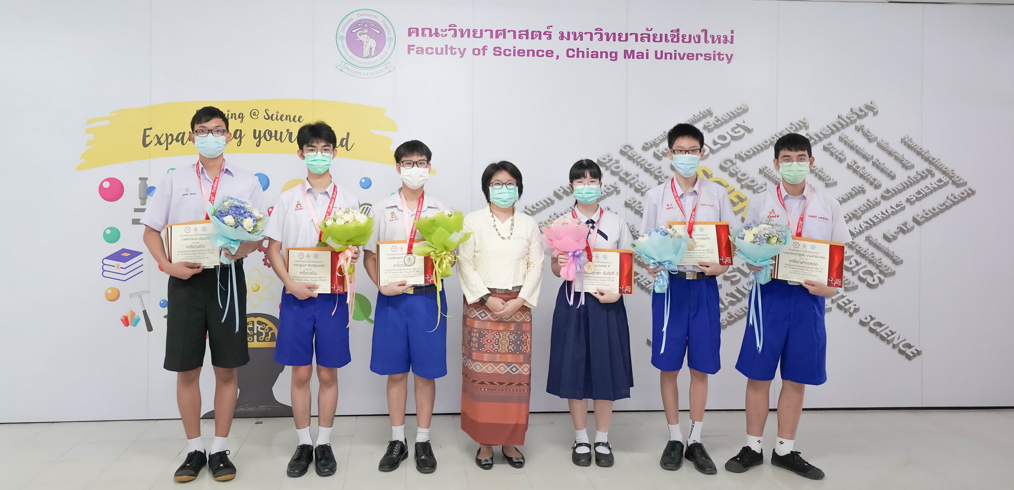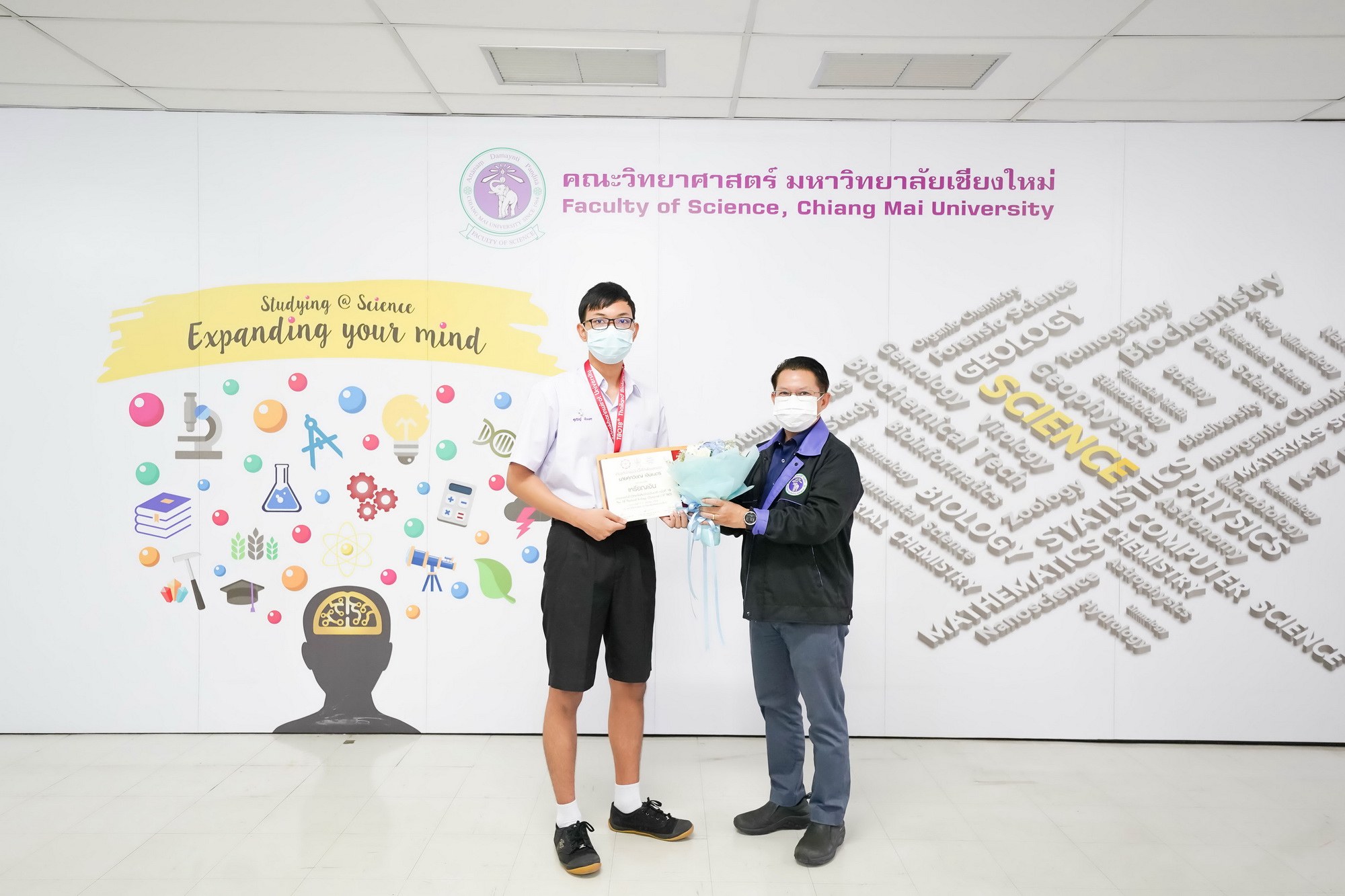 วันที่ 22 กรกฎาคม 2564 คณะวิทยาศาสตร์จัดพิธีมอบเกียรติบัตร เหรียญรางวัล และช่อดอกไม้ เพื่อแสดงความยินดีกับนักเรียนผู้แทนศูนย์ สอวน. มหาวิทยาลัยเชียงใหม่ ที่เข้าร่วมการแข่งขันชีววิทยาโอลิมปิกระดับชาติ ครั้งที่ 18 (18th Thailand Biology Olympiad: 18th TBO) ระหว่างวันที่ 8-11 มิถุนายน 2564 ซึ่งจัดโดยมหาวิทยาลัยศรีนครินทรวิโรฒ ในรูปแบบออนไลน์ โดยมีผู้ช่วยศาสตราจารย์ ดร.ภควรรณ พวงสมบัติ รองคณบดีฝ่ายวิชาการ คณะวิทยาศาสตร์ พร้อมด้วย รองศาสตราจารย์ ดร.หทัยชนก เนียมทรัพย์ รองคณบดีฝ่ายบริหาร ผู้ช่วยศาสตราจารย์ ดร.ชิตชล ผลารักษ์ หัวหน้าภาควิชาชีววิทยา ผู้ช่วยศาสตราจารย์ ดร.สิริพร โรจน์อารยานนท์ ประธานสาขาชีววิทยา ศูนย์ สอวน. มหาวิทยาลัยเชียงใหม่ และนายพร พรมมหาราช เลขานุการคณะวิทยาศาสตร์ ร่วมมอบเกียรติบัตร เหรียญรางวัล และช่อดอกไม้ ให้กับนักเรียนผู้แทนศูนย์ สอวน. มหาวิทยาลัยเชียงใหม่ จำนวน 6 คน ที่เข้าร่วมการแข่งขัน ซึ่งมีผู้เข้าแข่งขันทั้งสิ้น 95 คน จาก 13 ศูนย์ทั่วประเทศ และมีผลการแข่งขัน ดังนี้