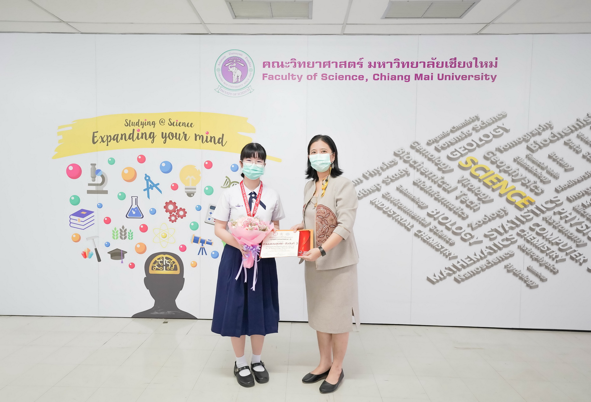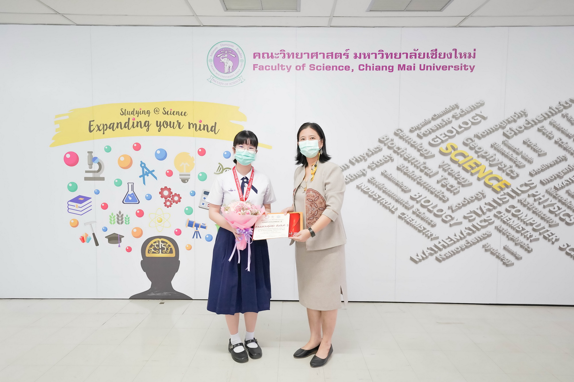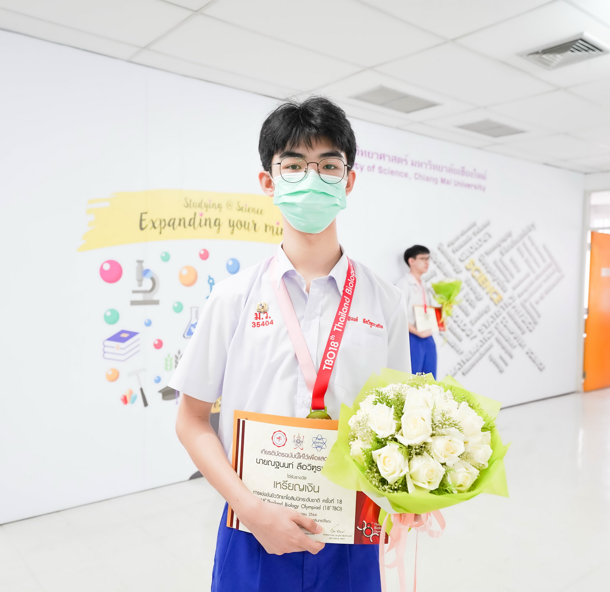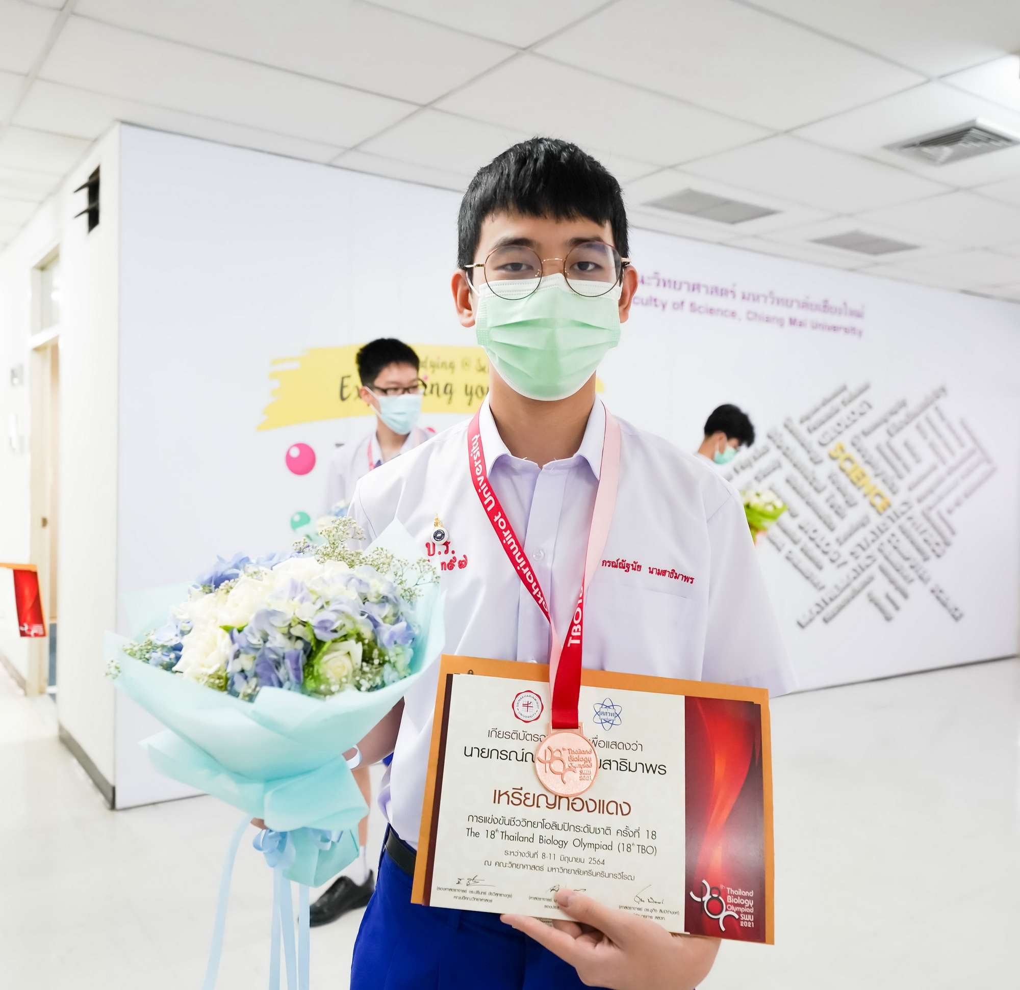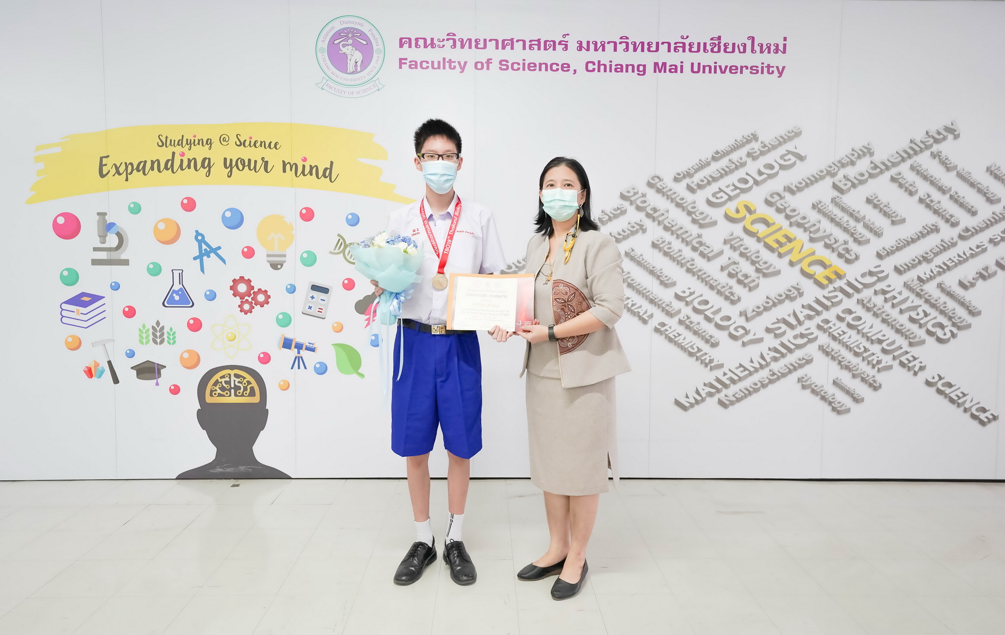 วันที่ 22 กรกฎาคม 2564 คณะวิทยาศาสตร์จัดพิธีมอบเกียรติบัตร เหรียญรางวัล และช่อดอกไม้ เพื่อแสดงความยินดีกับนักเรียนผู้แทนศูนย์ สอวน. มหาวิทยาลัยเชียงใหม่ ที่เข้าร่วมการแข่งขันชีววิทยาโอลิมปิกระดับชาติ ครั้งที่ 18 (18th Thailand Biology Olympiad: 18th TBO) ระหว่างวันที่ 8-11 มิถุนายน 2564 ซึ่งจัดโดยมหาวิทยาลัยศรีนครินทรวิโรฒ ในรูปแบบออนไลน์ โดยมีผู้ช่วยศาสตราจารย์ ดร.ภควรรณ พวงสมบัติ รองคณบดีฝ่ายวิชาการ คณะวิทยาศาสตร์ พร้อมด้วย รองศาสตราจารย์ ดร.หทัยชนก เนียมทรัพย์ รองคณบดีฝ่ายบริหาร ผู้ช่วยศาสตราจารย์ ดร.ชิตชล ผลารักษ์ หัวหน้าภาควิชาชีววิทยา ผู้ช่วยศาสตราจารย์ ดร.สิริพร โรจน์อารยานนท์ ประธานสาขาชีววิทยา ศูนย์ สอวน. มหาวิทยาลัยเชียงใหม่ และนายพร พรมมหาราช เลขานุการคณะวิทยาศาสตร์ ร่วมมอบเกียรติบัตร เหรียญรางวัล และช่อดอกไม้ ให้กับนักเรียนผู้แทนศูนย์ สอวน. มหาวิทยาลัยเชียงใหม่ จำนวน 6 คน ที่เข้าร่วมการแข่งขัน ซึ่งมีผู้เข้าแข่งขันทั้งสิ้น 95 คน จาก 13 ศูนย์ทั่วประเทศ และมีผลการแข่งขัน ดังนี้