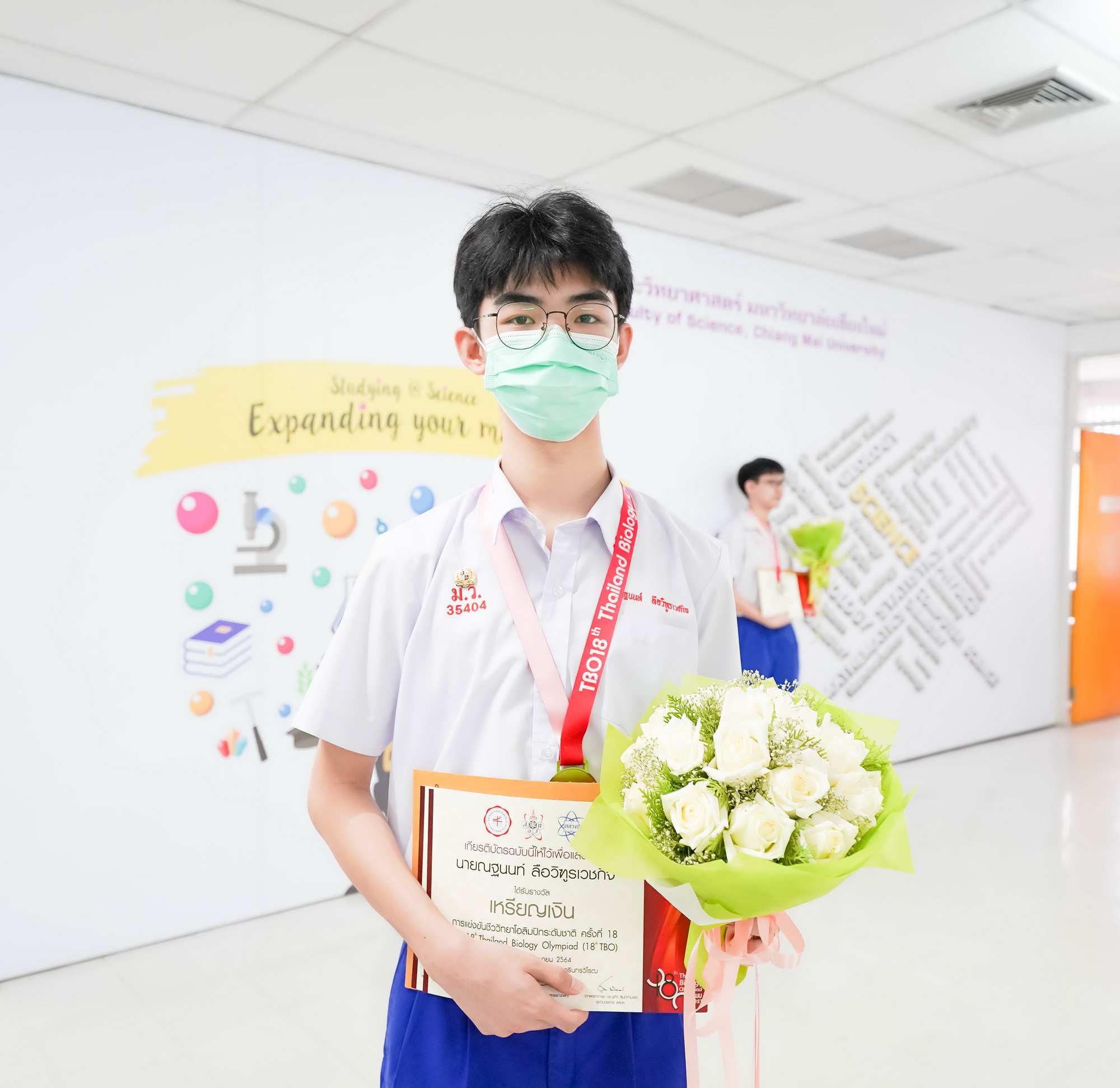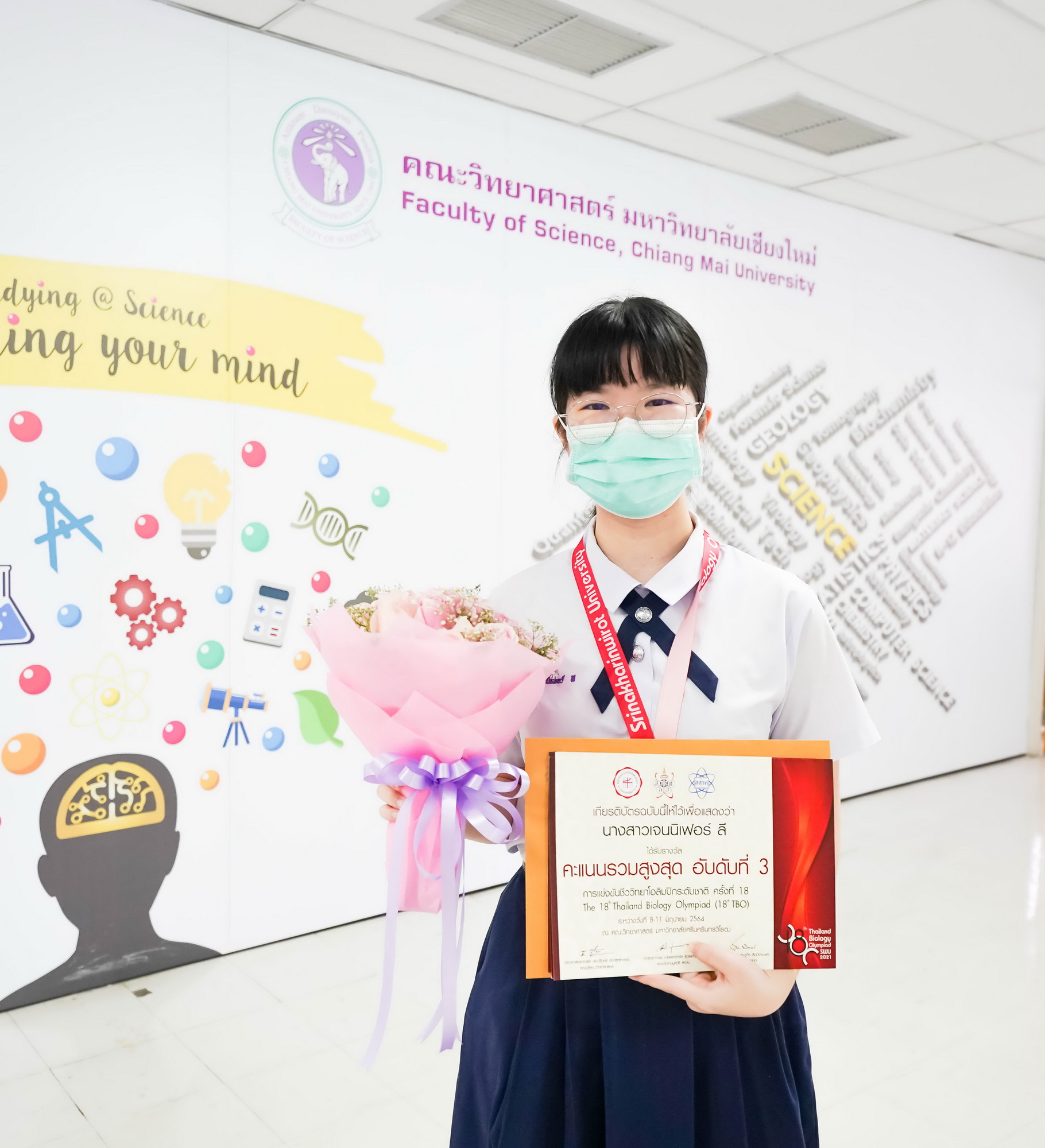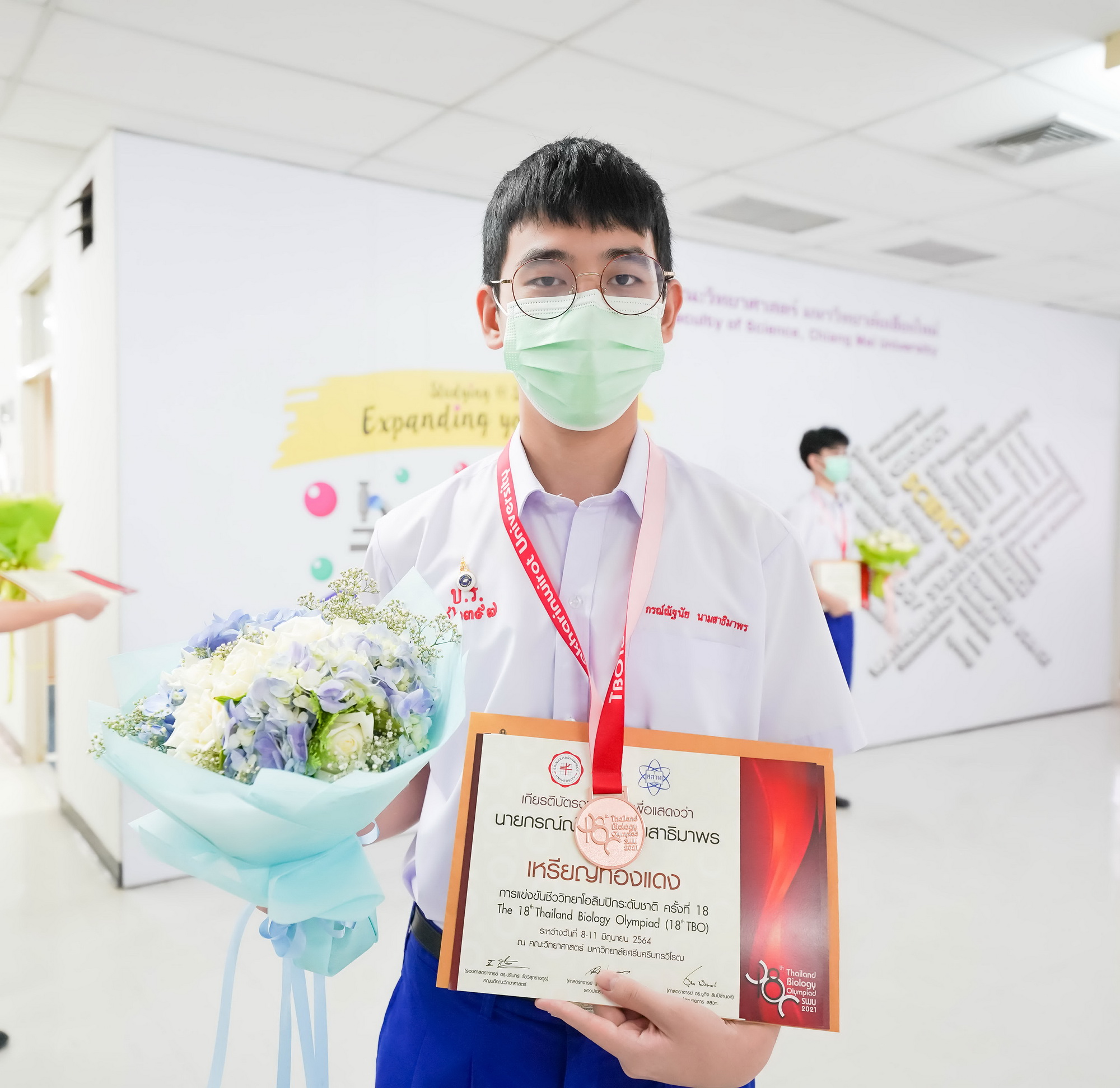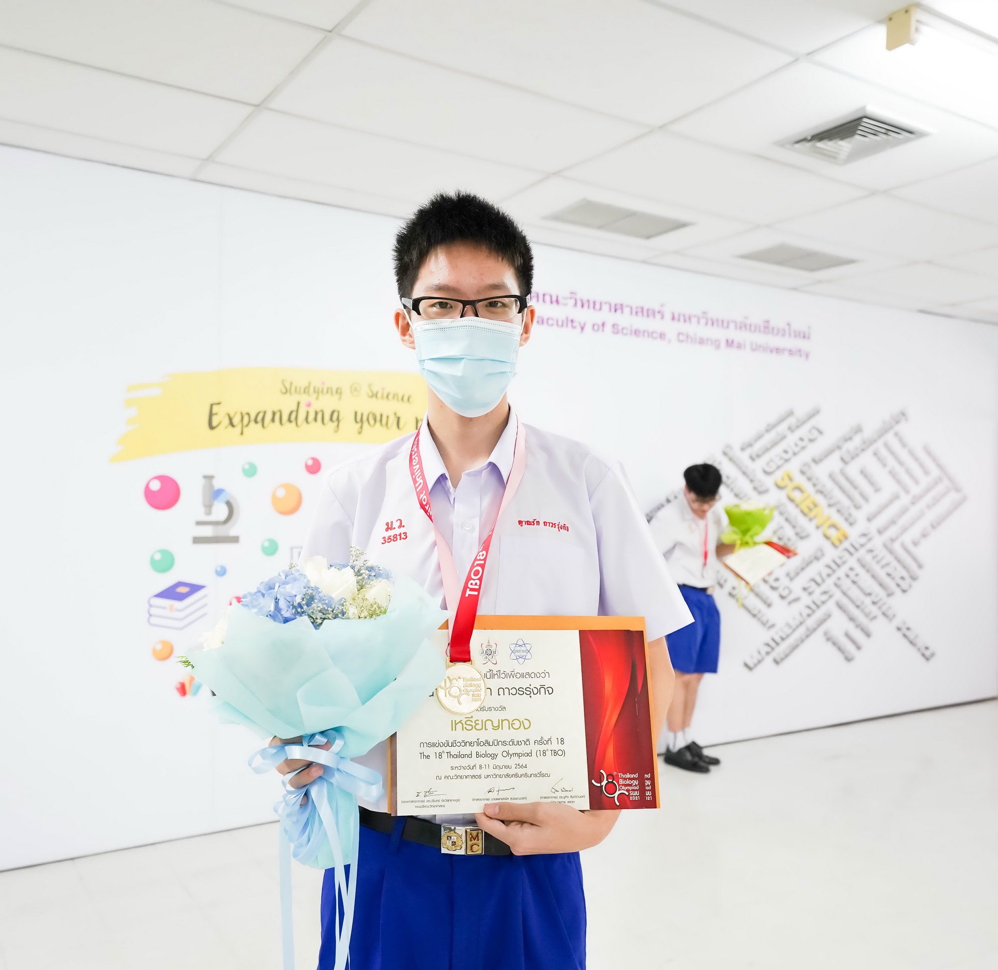 วันที่ 22 กรกฎาคม 2564 คณะวิทยาศาสตร์จัดพิธีมอบเกียรติบัตร เหรียญรางวัล และช่อดอกไม้ เพื่อแสดงความยินดีกับนักเรียนผู้แทนศูนย์ สอวน. มหาวิทยาลัยเชียงใหม่ ที่เข้าร่วมการแข่งขันชีววิทยาโอลิมปิกระดับชาติ ครั้งที่ 18 (18th Thailand Biology Olympiad: 18th TBO) ระหว่างวันที่ 8-11 มิถุนายน 2564 ซึ่งจัดโดยมหาวิทยาลัยศรีนครินทรวิโรฒ ในรูปแบบออนไลน์ โดยมีผู้ช่วยศาสตราจารย์ ดร.ภควรรณ พวงสมบัติ รองคณบดีฝ่ายวิชาการ คณะวิทยาศาสตร์ พร้อมด้วย รองศาสตราจารย์ ดร.หทัยชนก เนียมทรัพย์ รองคณบดีฝ่ายบริหาร ผู้ช่วยศาสตราจารย์ ดร.ชิตชล ผลารักษ์ หัวหน้าภาควิชาชีววิทยา ผู้ช่วยศาสตราจารย์ ดร.สิริพร โรจน์อารยานนท์ ประธานสาขาชีววิทยา ศูนย์ สอวน. มหาวิทยาลัยเชียงใหม่ และนายพร พรมมหาราช เลขานุการคณะวิทยาศาสตร์ ร่วมมอบเกียรติบัตร เหรียญรางวัล และช่อดอกไม้ ให้กับนักเรียนผู้แทนศูนย์ สอวน. มหาวิทยาลัยเชียงใหม่ จำนวน 6 คน ที่เข้าร่วมการแข่งขัน ซึ่งมีผู้เข้าแข่งขันทั้งสิ้น 95 คน จาก 13 ศูนย์ทั่วประเทศ และมีผลการแข่งขัน ดังนี้