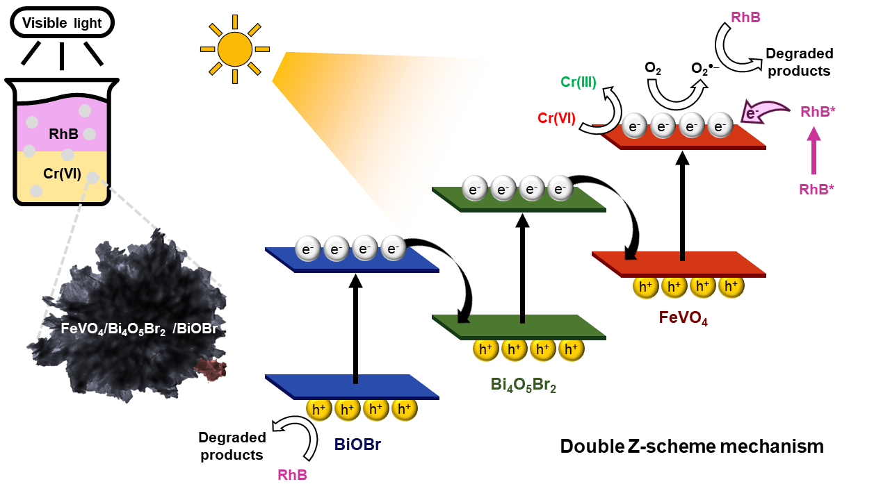 ผู้สนใจสามารถอ่านข้อมูลเพิ่มเติมได้ที่ Chachvalvutikul, A., Luangwanta, T., Kaowphong S. Double Z-scheme FeVO4/Bi4O5Br2/BiOBr ternary heterojunction photocatalyst for simultaneous photocatalytic removal of hexavalent chromium and rhodamine B Journal of Colloid and Interface Science, 2021, 603, 738–757