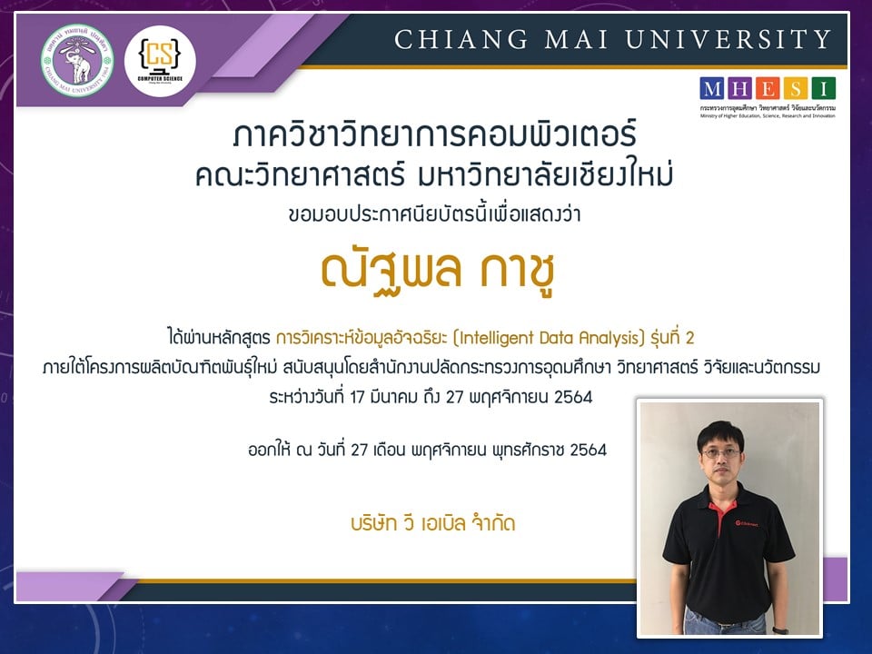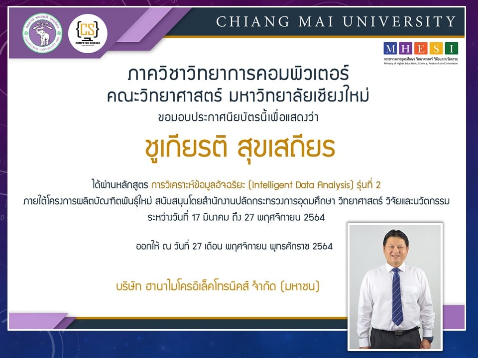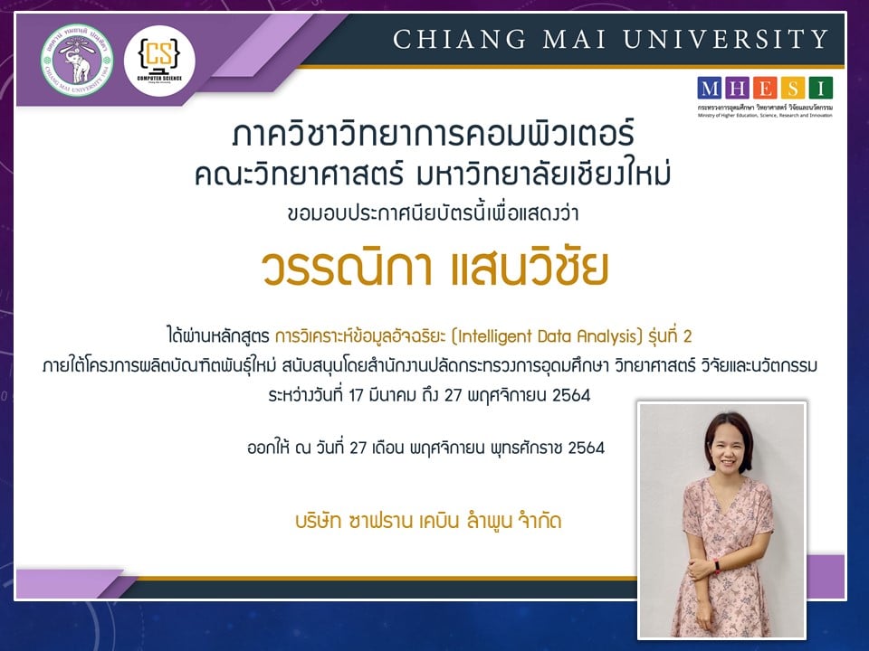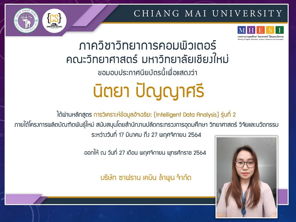 ภาควิชาวิทยาการคอมพิวเตอร์ คณะวิทยาศาสตร์ มหาวิทยาลัยเชียงใหม่ ได้เปิดสอนหลักสูตรการวิเคราะห์ข้อมูลอัจฉริยะ (Intelligent data analysis) ภายใต้โครงการผลิตบัณฑิตพันธุ์ใหม่ เพื่อสร้างกำลังคนที่มีสมรรถนะสูง สำหรับอุตสาหกรรม New Growth Engine ตามนโยบาย Thailand 4.0 และการปฏิรูปการอุดมศึกษาไทย ประเภทประกาศนียบัตร (Non-degree) กลุ่มอุตสาหกรรมดิจิทัล รุ่นที่ 2 ระหว่างวันที่ 17 มีนาคม - 27 พฤศจิกายน 2564