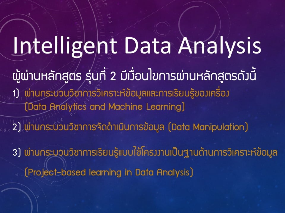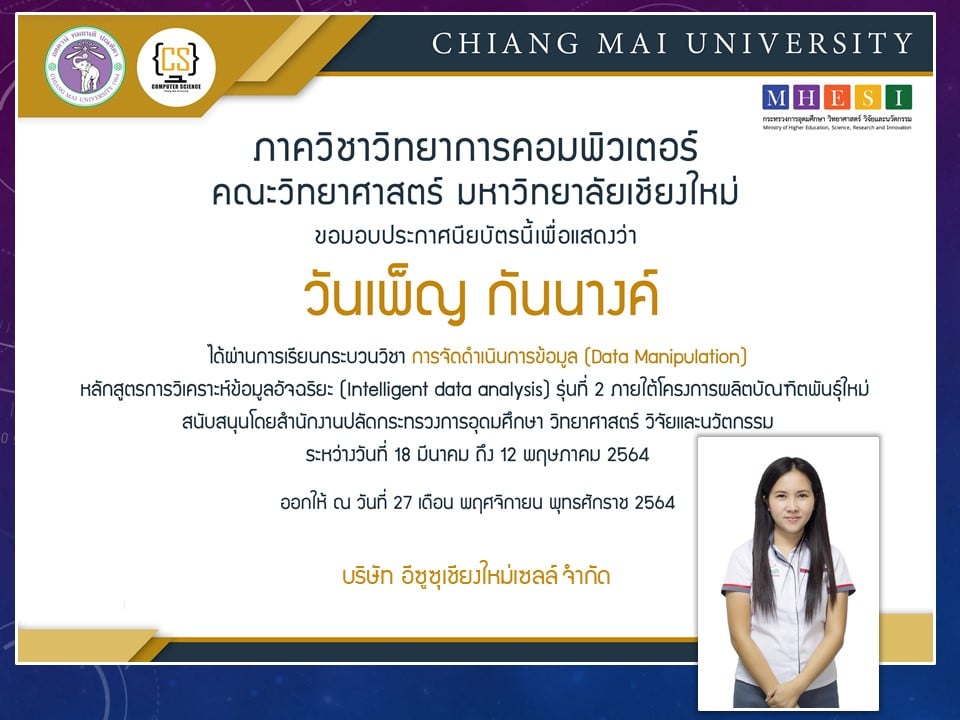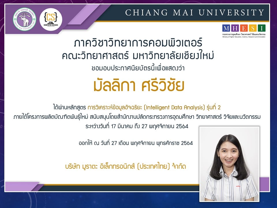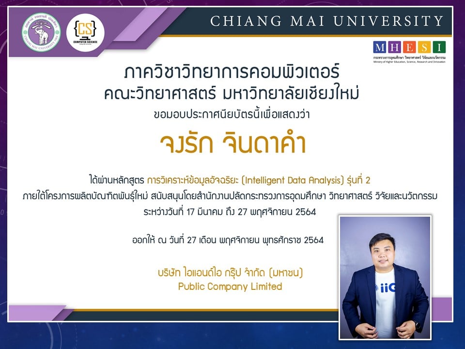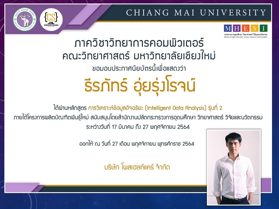 ภาควิชาวิทยาการคอมพิวเตอร์ คณะวิทยาศาสตร์ มหาวิทยาลัยเชียงใหม่ ได้เปิดสอนหลักสูตรการวิเคราะห์ข้อมูลอัจฉริยะ (Intelligent data analysis) ภายใต้โครงการผลิตบัณฑิตพันธุ์ใหม่ เพื่อสร้างกำลังคนที่มีสมรรถนะสูง สำหรับอุตสาหกรรม New Growth Engine ตามนโยบาย Thailand 4.0 และการปฏิรูปการอุดมศึกษาไทย ประเภทประกาศนียบัตร (Non-degree) กลุ่มอุตสาหกรรมดิจิทัล รุ่นที่ 2 ระหว่างวันที่ 17 มีนาคม - 27 พฤศจิกายน 2564