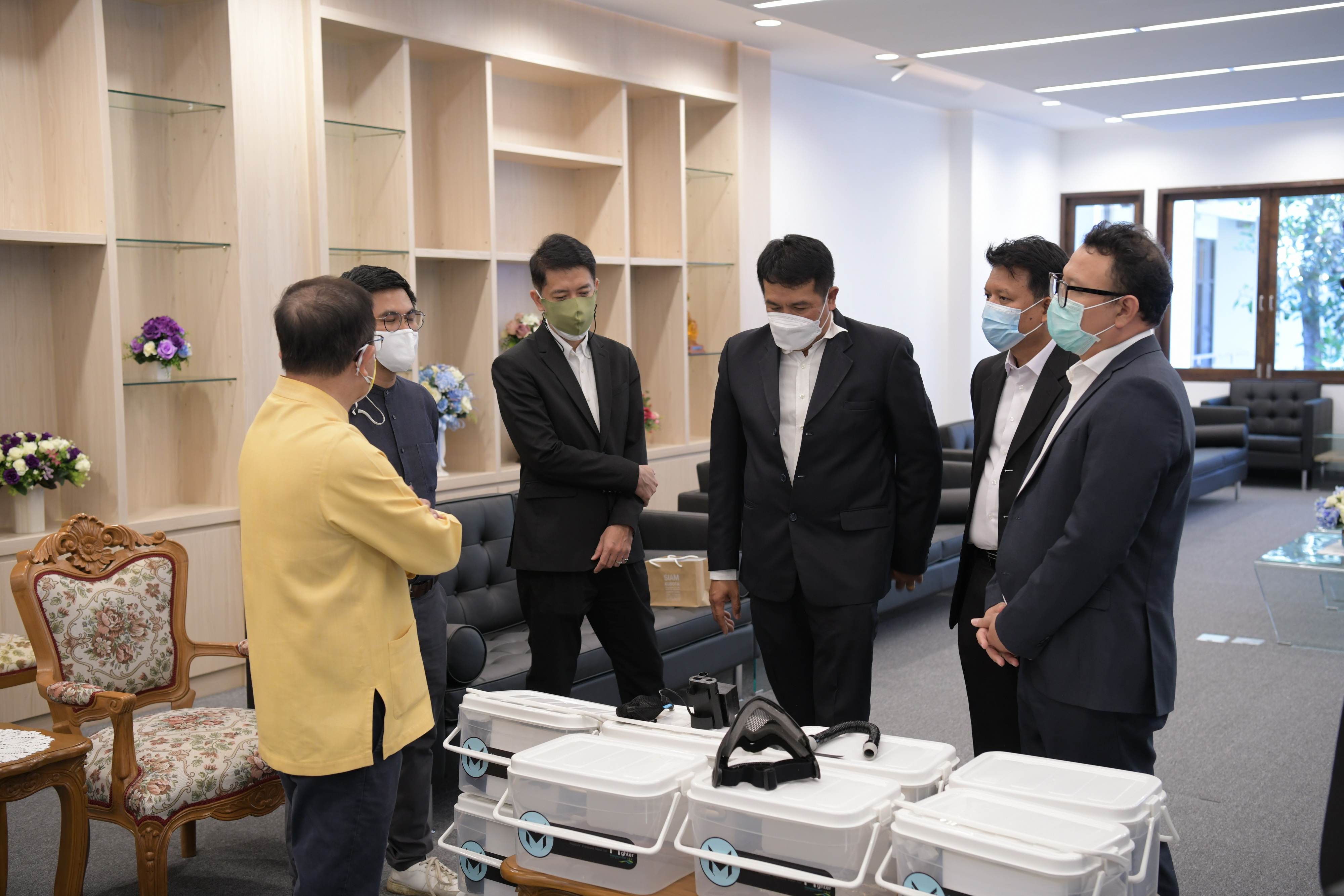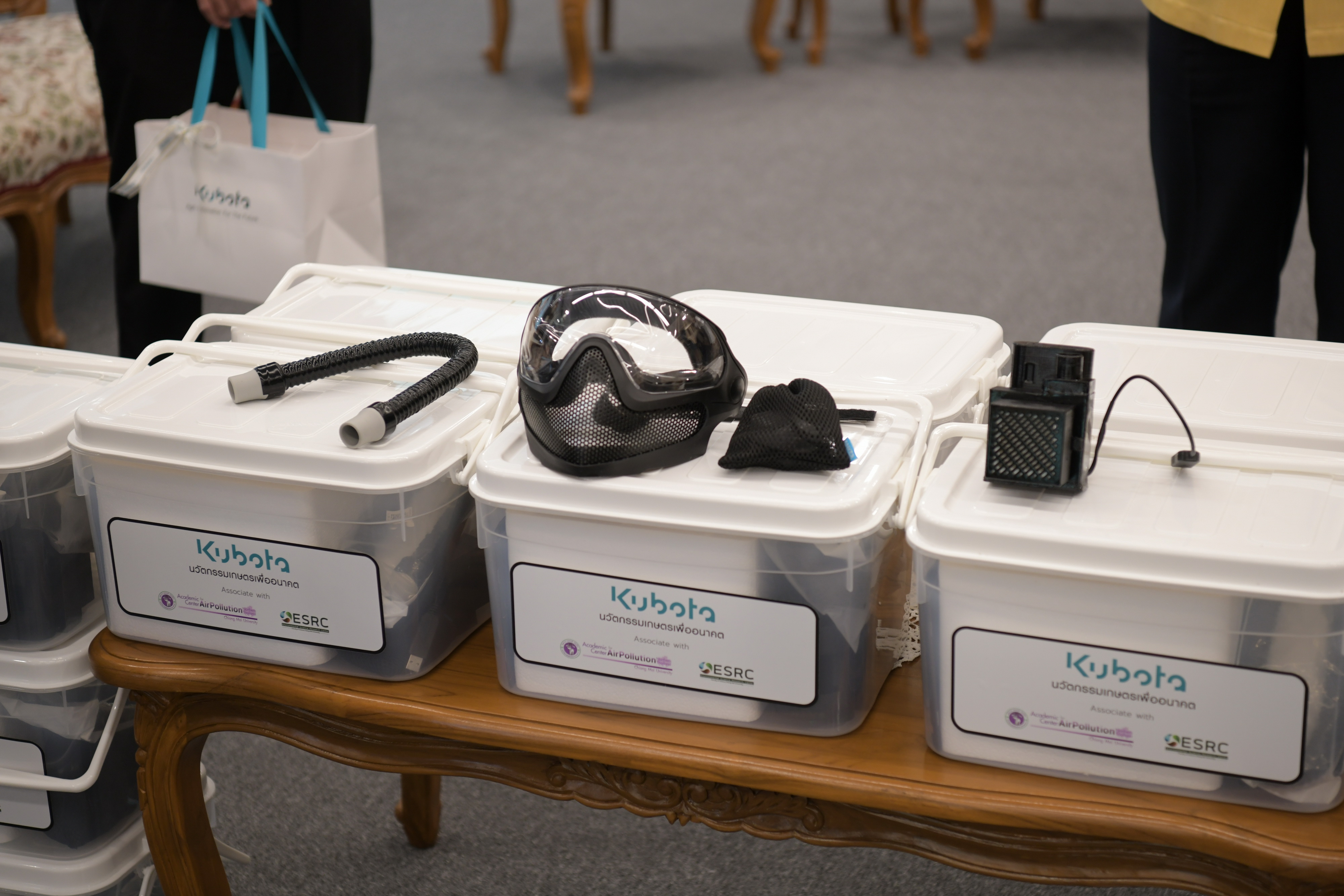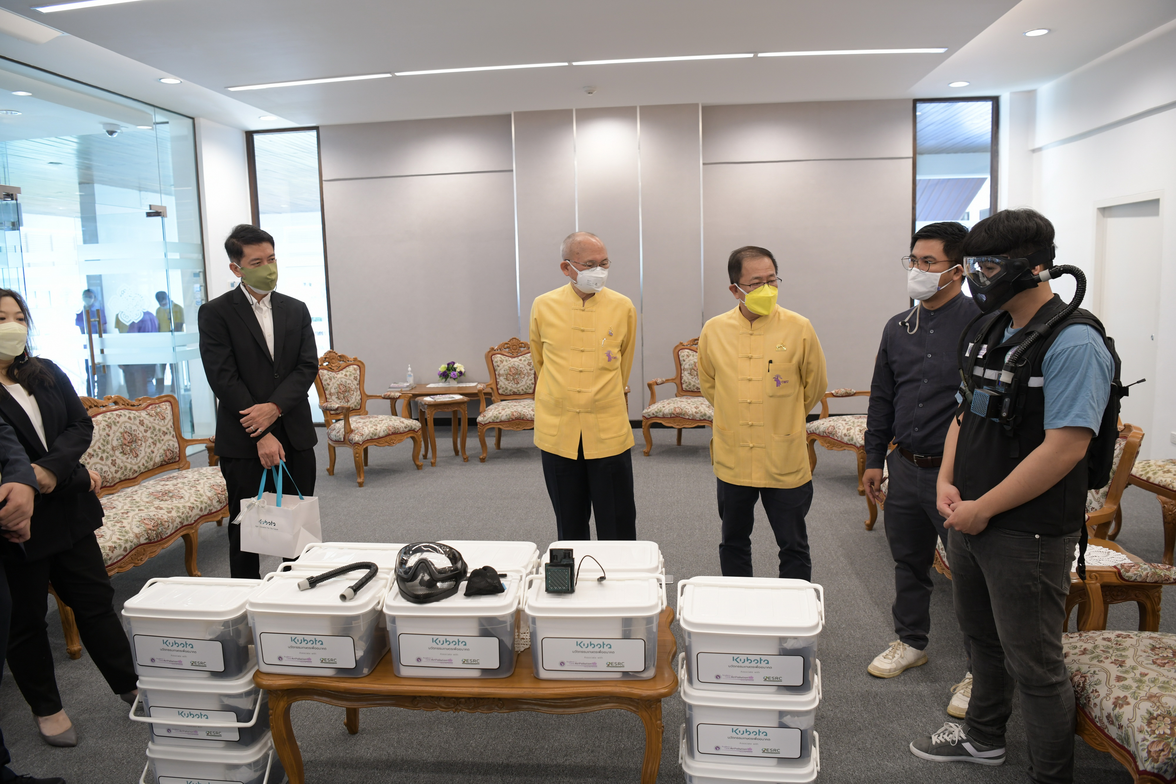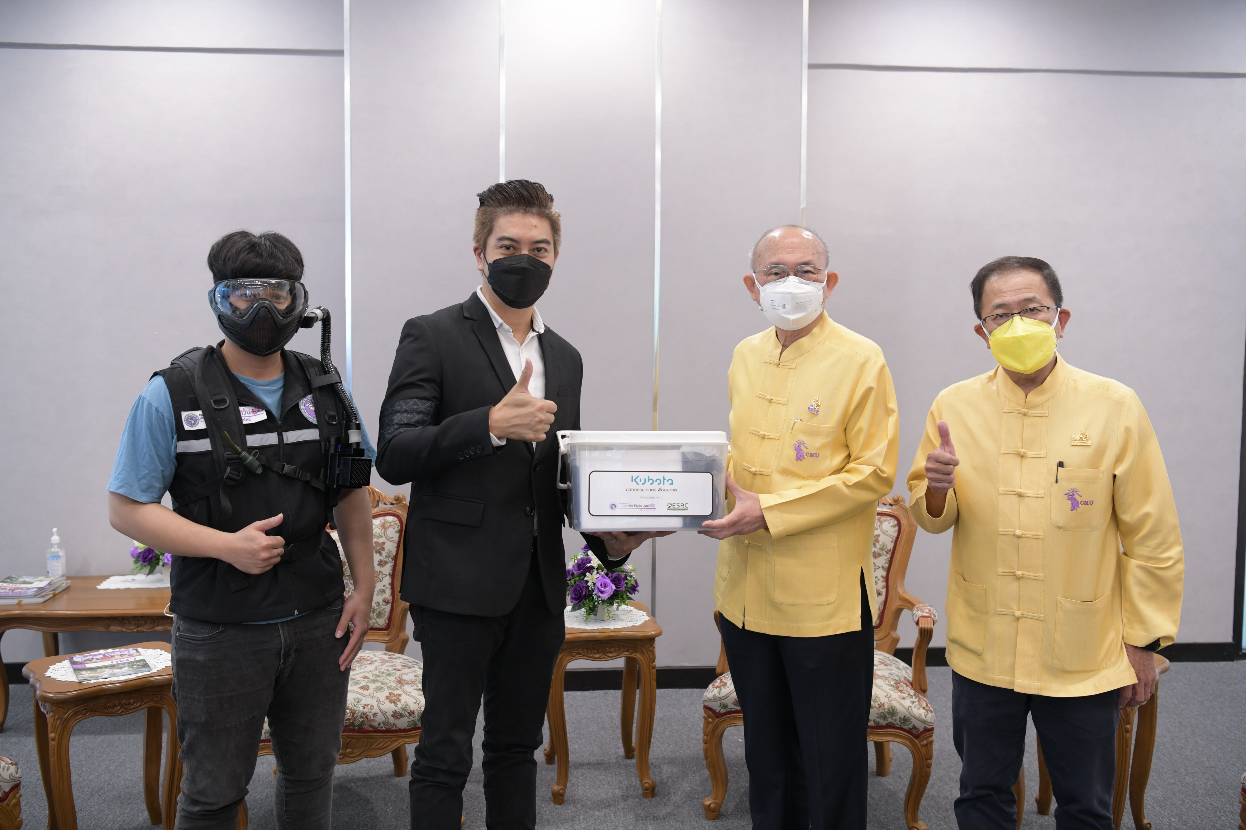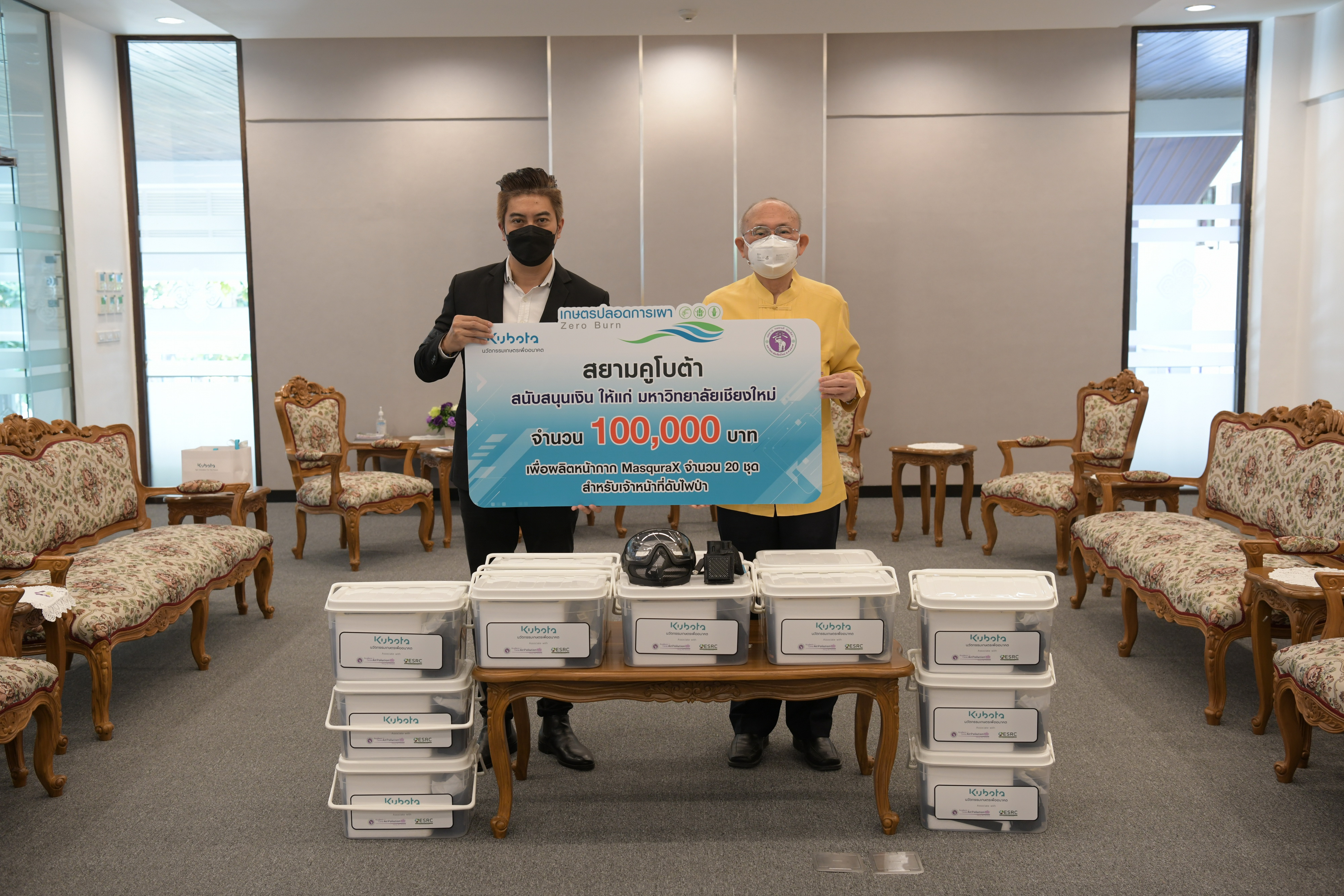 ศาสตราจารย์คลินิก นพ.นิเวศน์ นันทจิต อธิการบดีมหาวิทยาลัยเชียงใหม่ พร้อมด้วยคณะผู้บริหารมหาวิทยาลัยเชียงใหม่ ให้การต้อนรับ นายวีรพงศ์ วิรบุตร์ ผู้จัดการอาวุโส สำนักงานขายภาคเหนือ บริษัท สยามคูโบต้า คอร์ปอเรชั่น จำกัด และคณะ มอบเงินจำนวน 100,000 บาท (หนึ่งแสนบาทถ้วน) ให้กับมูลนิธิพัฒนามหาวิทยาลัยเชียงใหม่ เพื่อสนับสนุนการผลิตนวัตกรรมหน้ากากความดันบวก (MasquraX) จำนวน 20 ชุด สำหรับเจ้าหน้าที่ดับไฟป่า โดยมี ผู้ช่วยศาสตราจารย์ ดร.ว่าน วิริยา ผู้ช่วยหัวหน้าศูนย์วิจัยวิทยาศาสตร์สิ่งแวดล้อม คณะวิทยาศาสตร์ มหาวิทยาลัยเชียงใหม่ ร่วมรับมอบฯ ณ ห้องหม่อมหลวงปิ่น มาลากุล สำนักงานมหาวิทยาลัย มหาวิทยาลัยเชียงใหม่ เมื่อวันอังคารที่ 30 พฤศจิกายน พ.ศ. 2564 โดย MasquraX เป็นนวัตกรรมหน้ากากความดันบวกที่คณะวิศวกรรมศาสตร์ ร่วมกับศูนย์วิจัยวิทยาศาสตร์สิ่งแวดล้อม คณะวิทยาศาสตร์ และหน่วยงานที่เกี่ยวข้อง ได้ร่วมกันพัฒนาต้นแบบ เพื่อต่อยอดใช้งานจริงในการป้องกันฝุ่น PM 2.5 และสารคัดหลั่งอย่างมีประสิทธิภาพ