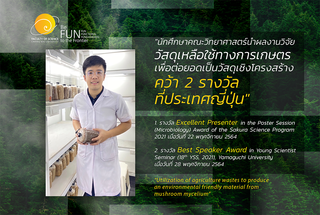 นายวรวุฒิ อ้ายดวง นักศึกษาระดับปริญญาเอก ภาควิชาชีววิทยา คณะวิทยาศาสตร์ คว้า 2 รางวัลด้านวิทยาศาสตร์ ที่ประเทศญี่ปุ่น ได้แก่ รางวัล Excellent Presenter in the Poster Session (Microbiology) Award of the Sakura Science Program 2021 เมื่อวันที่ 22 พฤศจิกายน 2564 และรางวัล Best Speaker Award in Young Scientist Seminar (18th YSS, 2021), Yamaguchi University เมื่อวันที่ 28 พฤศจิกายน 2564 จากผลงานวิจัยในหัวข้อ “Utilization of agriculture wastes to produce an environmental friendly material from mushroom mycelium”