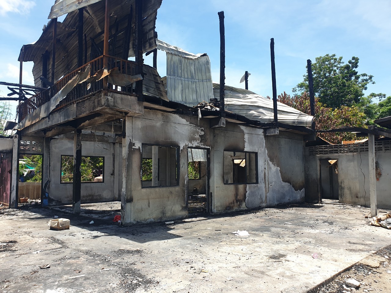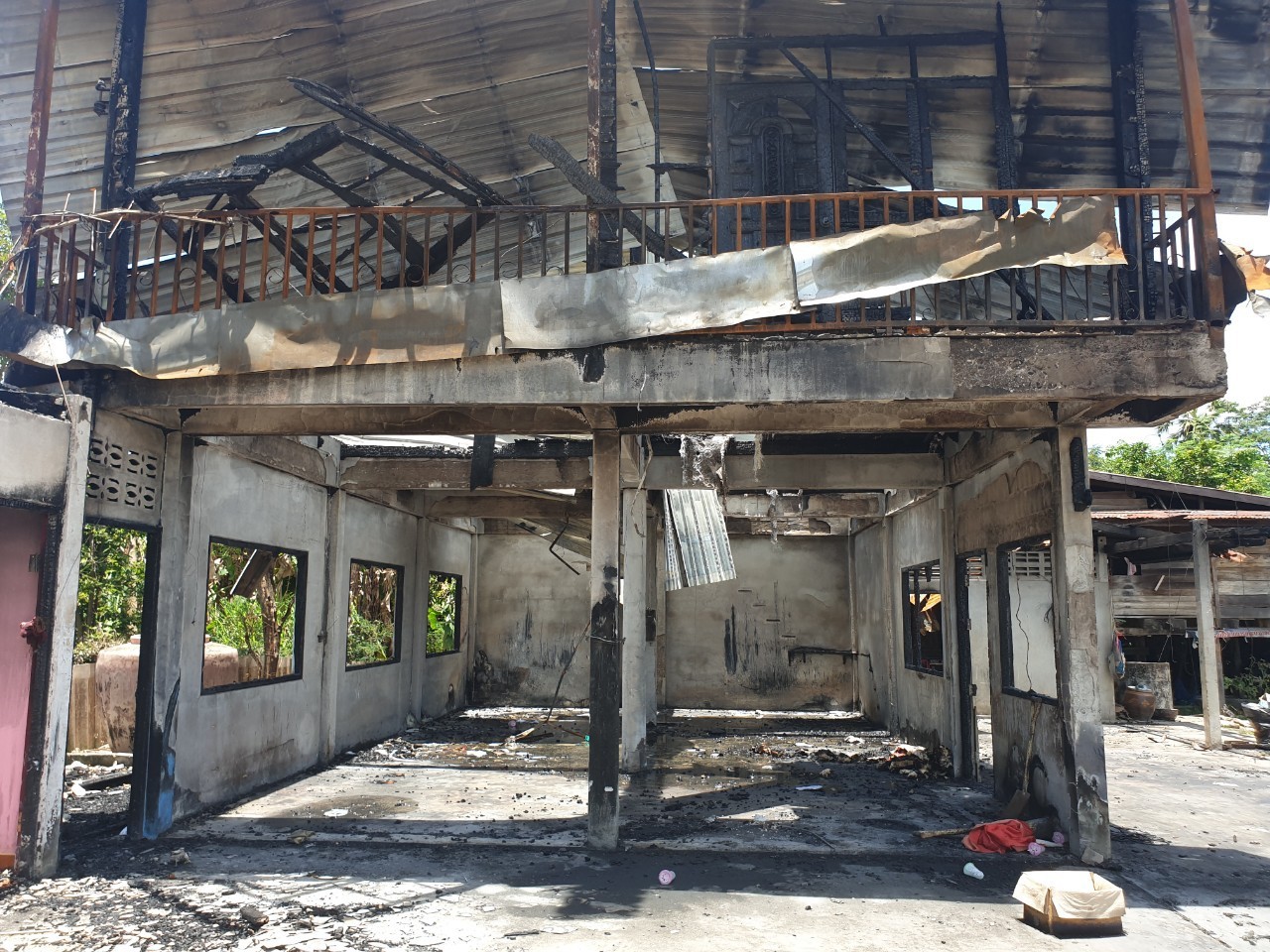 โดยเพลิงได้เผาไหม้บ้านซึ่งเปิดเป็นร้านค้า อู่ซ่อมรถ ร้านจำหน่ายแก๊สหุงต้ม และเครื่องมือการเกษตร จนได้รับความเสียหายเกือบทั้งหลัง เหลือเพียงโครงสร้างบางส่วน อีกทั้งทรัพย์สินภายในบ้าน และรถของลูกค้าที่เข้ามาซ่อมบางส่วนก็ได้รับความเสียหายด้วย