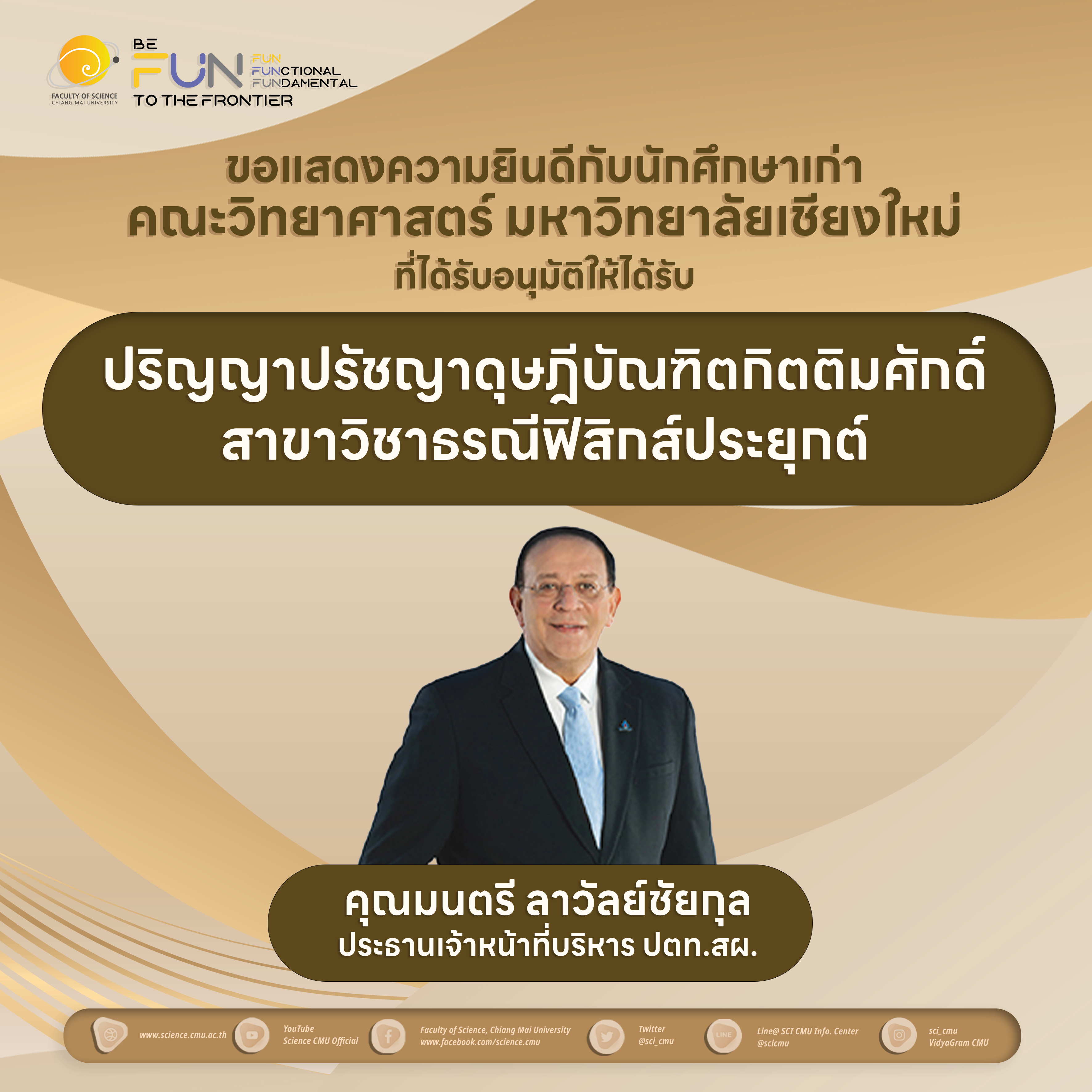 คณะวิทยาศาสตร์ขอแสดงความยินดีกับนักศึกษาเก่าคณะวิทยาศาสตร์ ที่ได้รับอนุมัติให้ได้รับปริญญาปรัชญาดุษฎีบัณฑิตกิตติมศักดิ์ สาขาวิชาธรณีฟิสิกส์ประยุกต์ และอดีตอาจารย์ประจำคณะวิทยาศาสตร์ ที่ได้รับการพิจารณาแต่งตั้งเป็น ศาสตราจารย์เกียรติคุณ สาขาวิชาคณิตศาสตร์