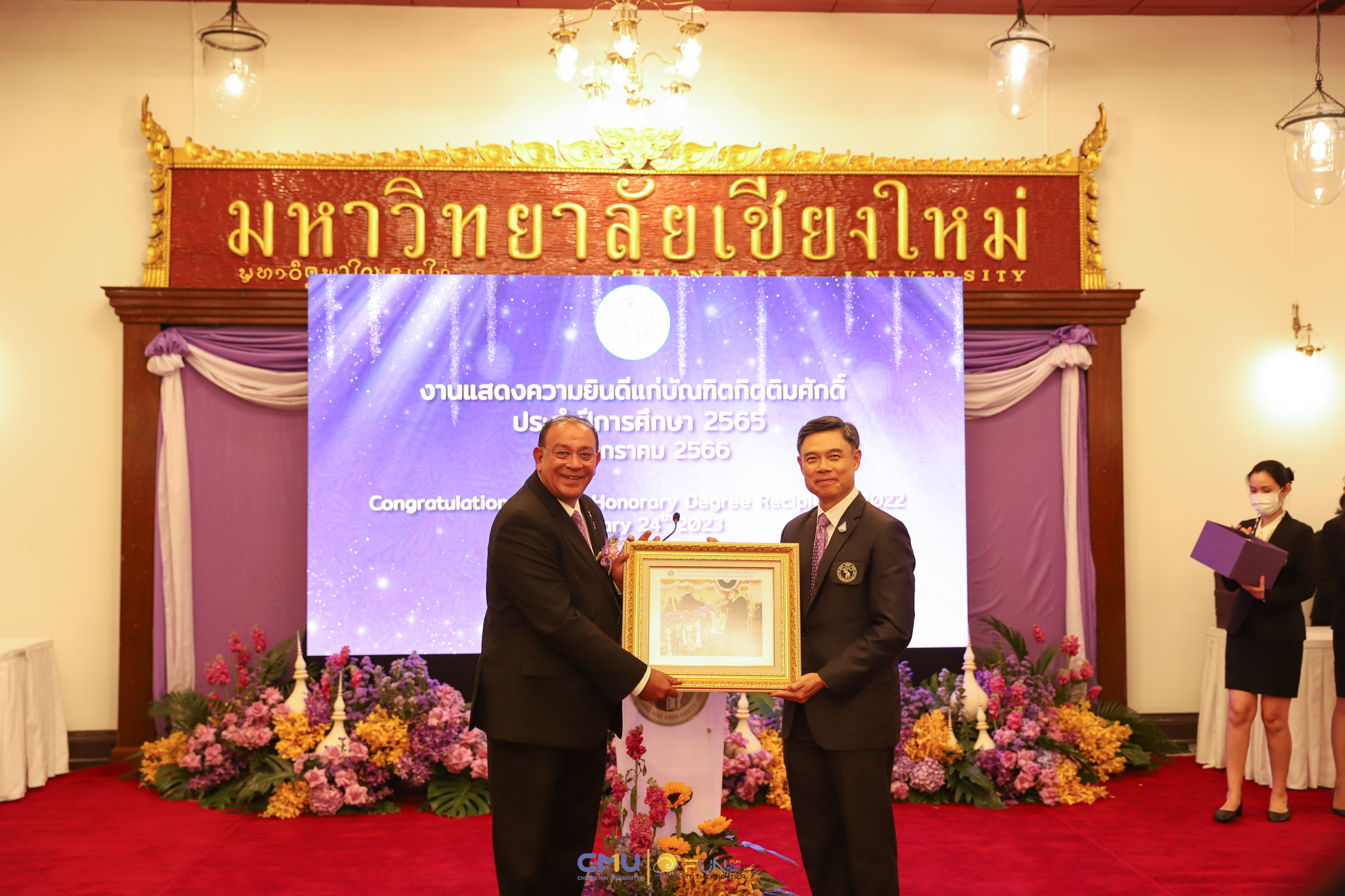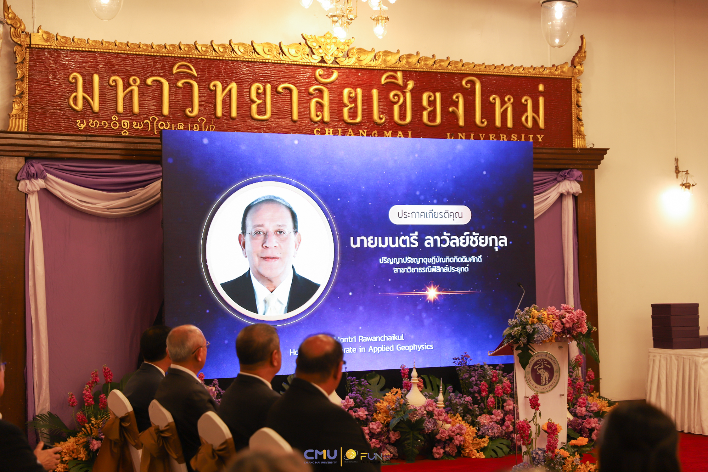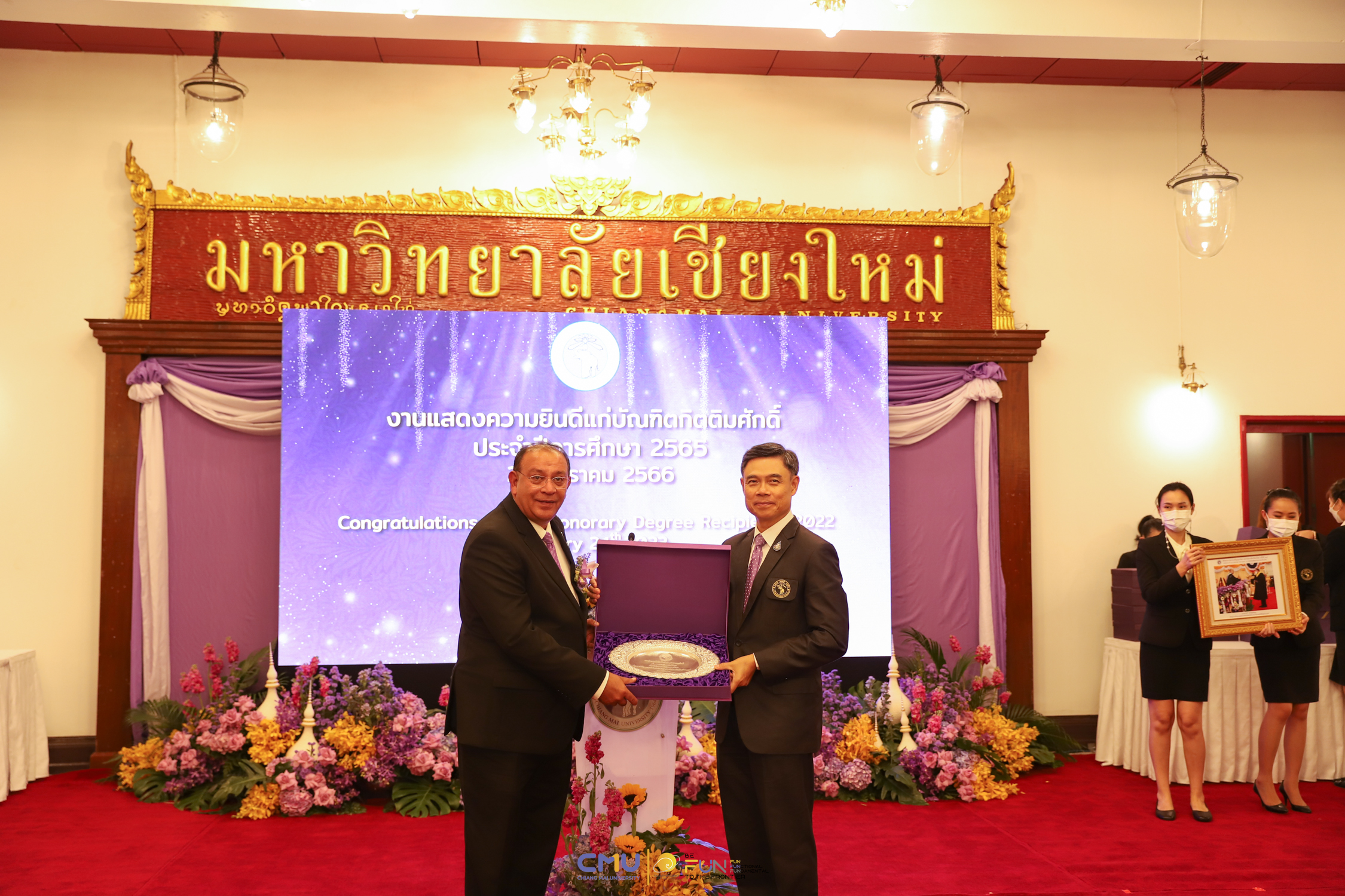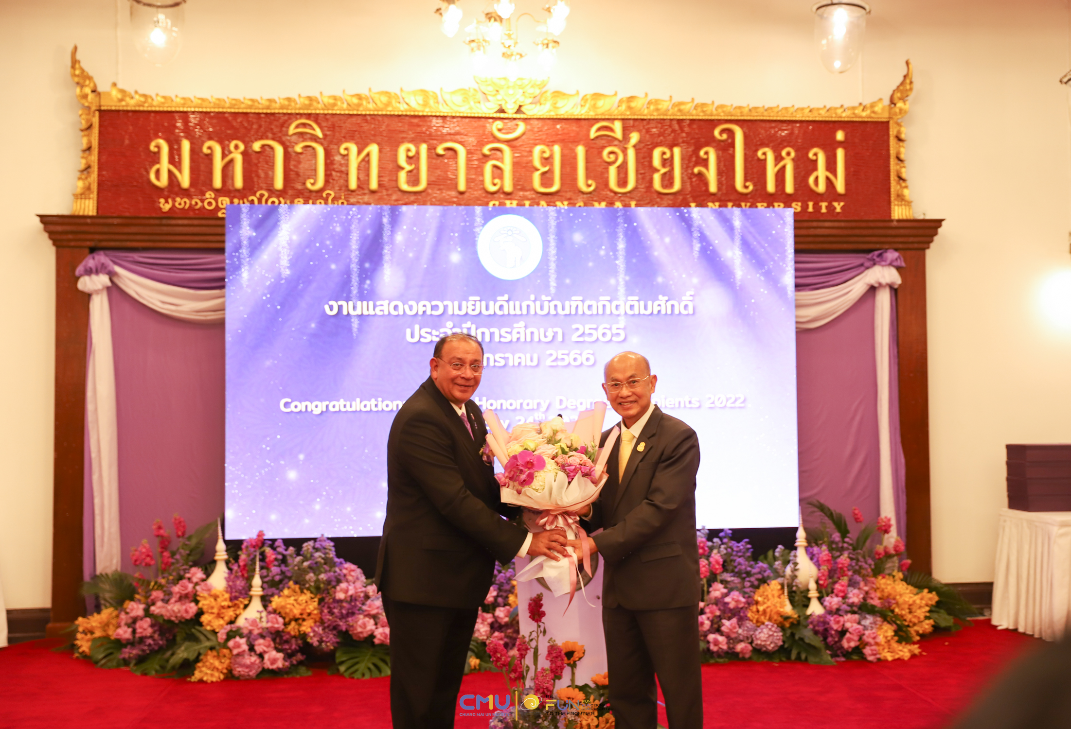 ศาสตราจารย์ (เชี่ยวชาญพิเศษ) ดร.ธรณินทร์ ไชยเรืองศรี คณบดีคณะวิทยาศาสตร์ ร่วมเป็นเกียรติและแสดงความยินดีกับผู้ที่ได้รับปริญญาปรัชญาดุษฎีบัณฑิตกิตติมศักดิ์ ในงานแสดงความยินดีผู้ที่ได้รับพระราชทานปริญญากิตติมศักดิ์ ในงานพิธีพระราชทานปริญญาบัตร ครั้งที่ 57 ประจำปีการศึกษา 2564-2565 ซึ่งจัดโดยมหาวิทยาลัยเชียงใหม่ โดยมีศาสตราจารย์เกียรติคุณ นายแพทย์เกษม วัฒนชัย นายกสภามหาวิทยาลัยเชียงใหม่ กล่าวแสดงความยินดี มอบเกียรติบัตร และมอบดอกไม้ ศาสตราจารย์ ดร.นพ.พงษ์รักษ์ ศรีบัณฑิตมงคล อธิการบดีมหาวิทยาลัยเชียงใหม่ กล่าวต้อนรับและมอบของที่ระลึก ณ ศาลาธรรม มหาวิทยาลัยเชียงใหม่ เมื่อวันอังคารที่ 24 มกราคม 2566 ทั้งนี้ ในส่วนของคณะวิทยาศาสตร์มีนักศึกษาเก่าที่ได้รับปริญญาปรัชญาดุษฎีบัณฑิตกิตติมศักดิ์ จำนวน 1 ท่าน ได้แก่ คุณมนตรี ลาวัลย์ชัยกุล ปริญญาปรัชญาดุษฎีบัณฑิตกิตติมศักดิ์ สาขาวิชาธรณีฟิสิกส์ประยุกต์