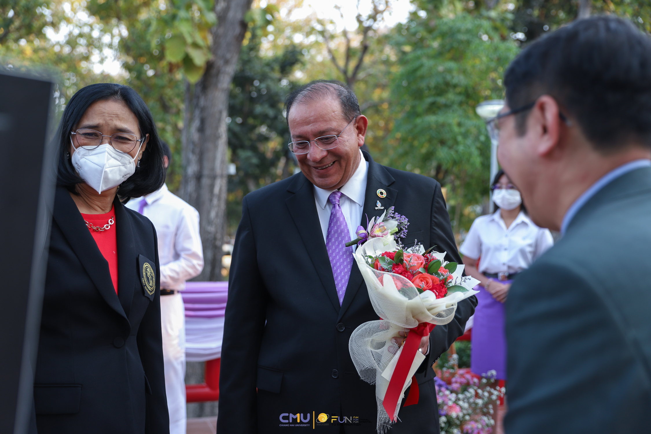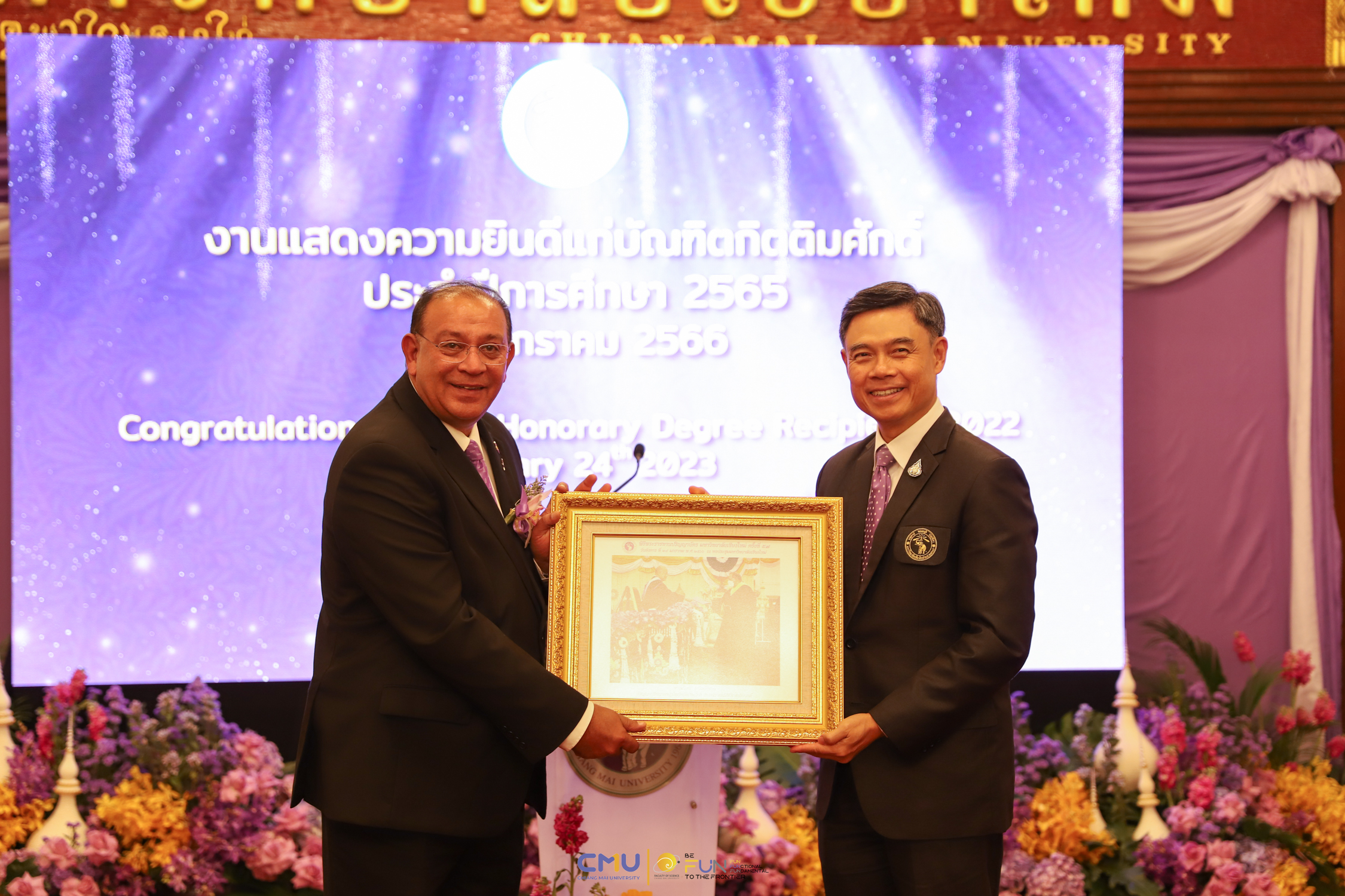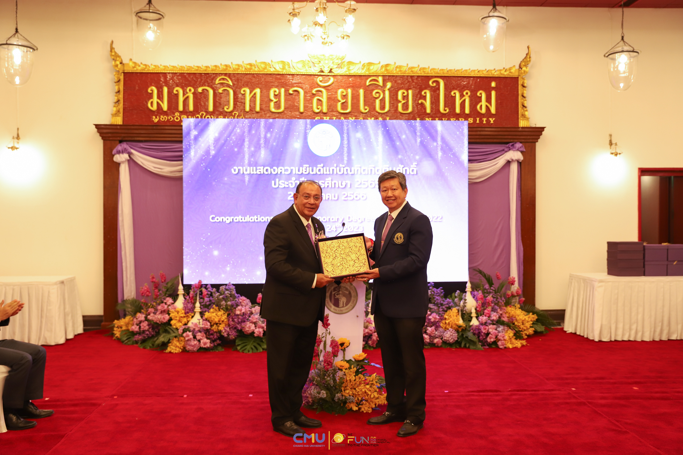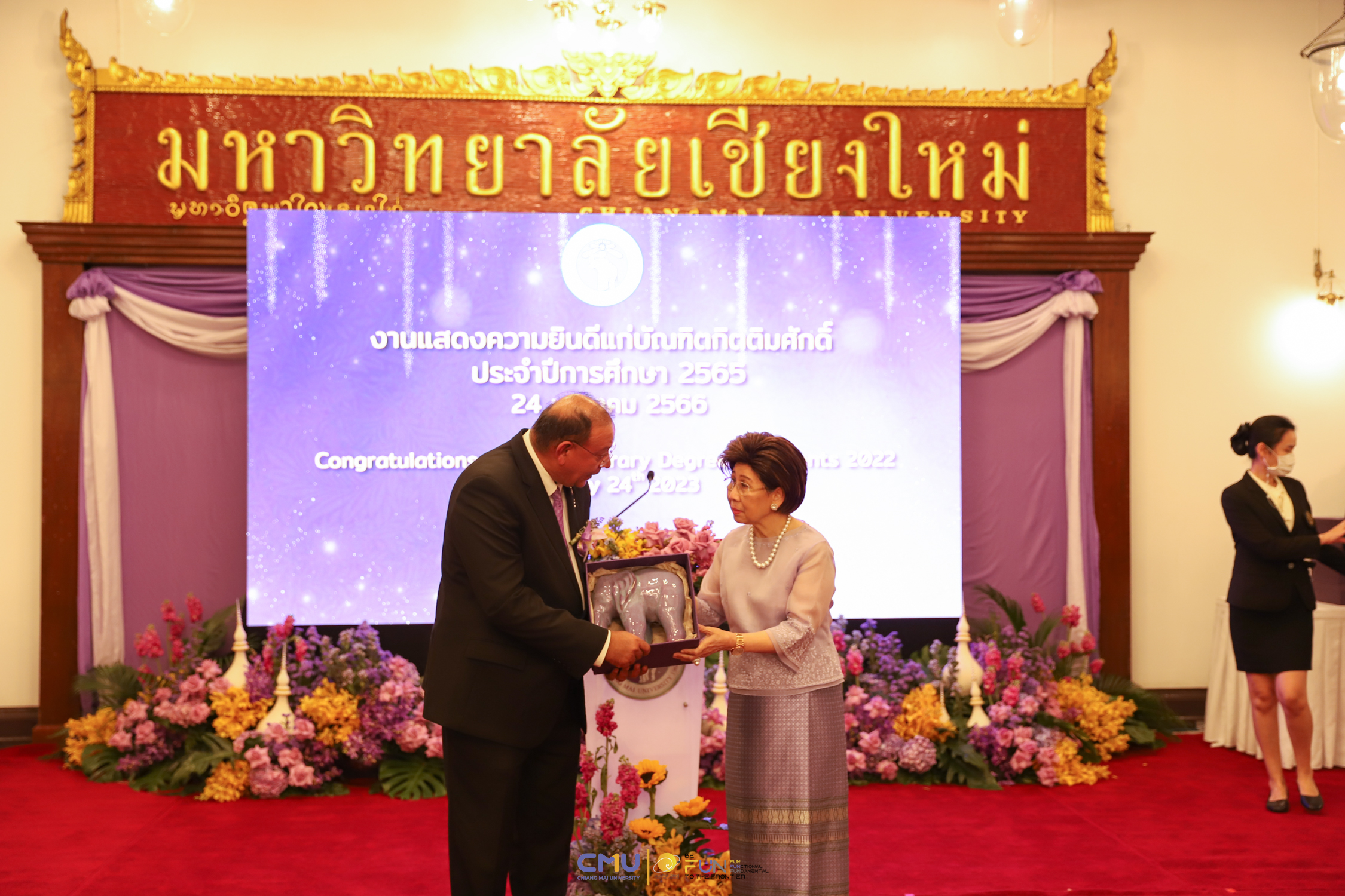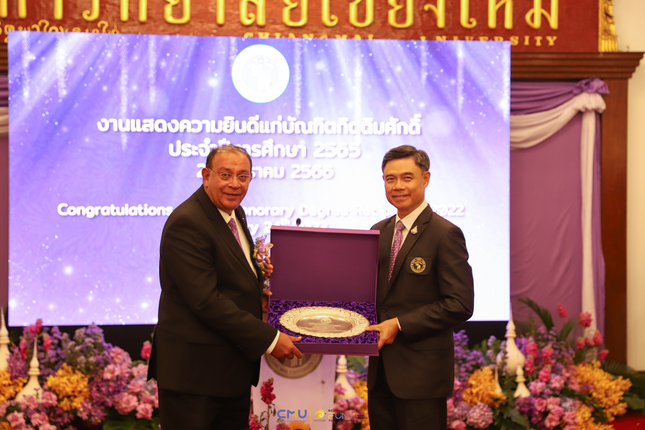 ศาสตราจารย์ (เชี่ยวชาญพิเศษ) ดร.ธรณินทร์ ไชยเรืองศรี คณบดีคณะวิทยาศาสตร์ ร่วมเป็นเกียรติและแสดงความยินดีกับผู้ที่ได้รับปริญญาปรัชญาดุษฎีบัณฑิตกิตติมศักดิ์ ในงานแสดงความยินดีผู้ที่ได้รับพระราชทานปริญญากิตติมศักดิ์ ในงานพิธีพระราชทานปริญญาบัตร ครั้งที่ 57 ประจำปีการศึกษา 2564-2565 ซึ่งจัดโดยมหาวิทยาลัยเชียงใหม่ โดยมีศาสตราจารย์เกียรติคุณ นายแพทย์เกษม วัฒนชัย นายกสภามหาวิทยาลัยเชียงใหม่ กล่าวแสดงความยินดี มอบเกียรติบัตร และมอบดอกไม้ ศาสตราจารย์ ดร.นพ.พงษ์รักษ์ ศรีบัณฑิตมงคล อธิการบดีมหาวิทยาลัยเชียงใหม่ กล่าวต้อนรับและมอบของที่ระลึก ณ ศาลาธรรม มหาวิทยาลัยเชียงใหม่ เมื่อวันอังคารที่ 24 มกราคม 2566 ทั้งนี้ ในส่วนของคณะวิทยาศาสตร์มีนักศึกษาเก่าที่ได้รับปริญญาปรัชญาดุษฎีบัณฑิตกิตติมศักดิ์ จำนวน 1 ท่าน ได้แก่ คุณมนตรี ลาวัลย์ชัยกุล ปริญญาปรัชญาดุษฎีบัณฑิตกิตติมศักดิ์ สาขาวิชาธรณีฟิสิกส์ประยุกต์