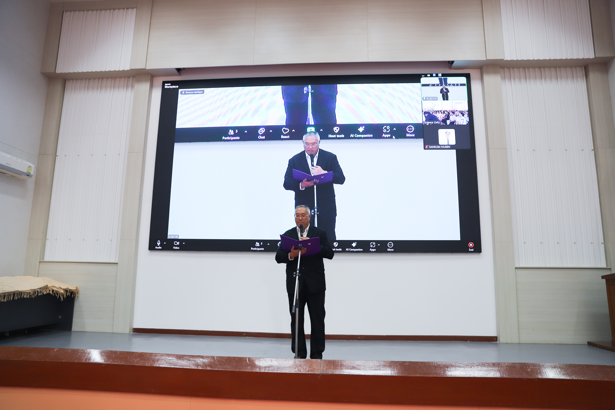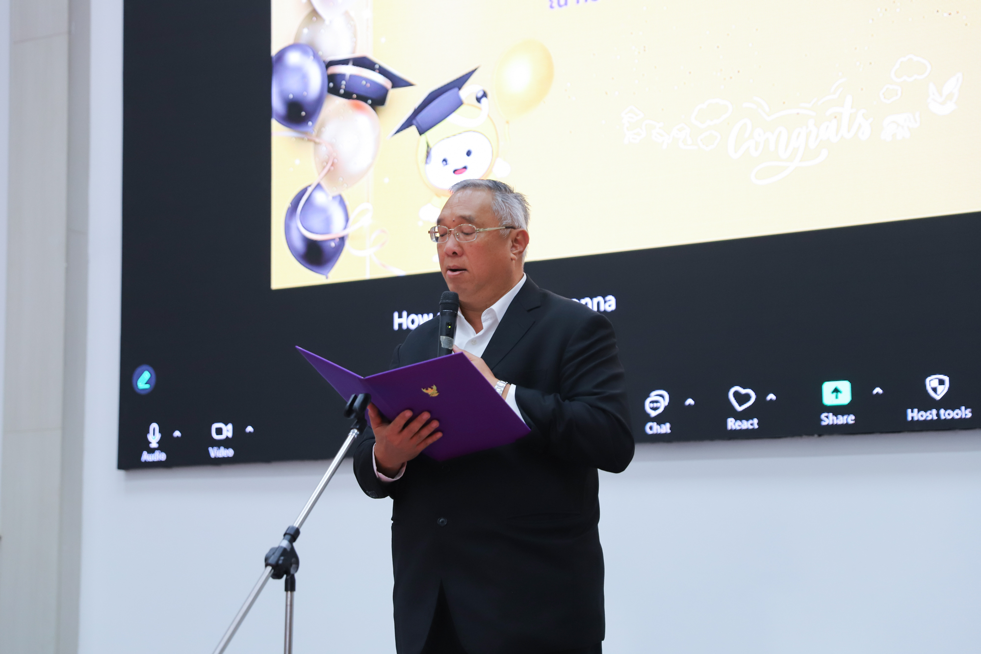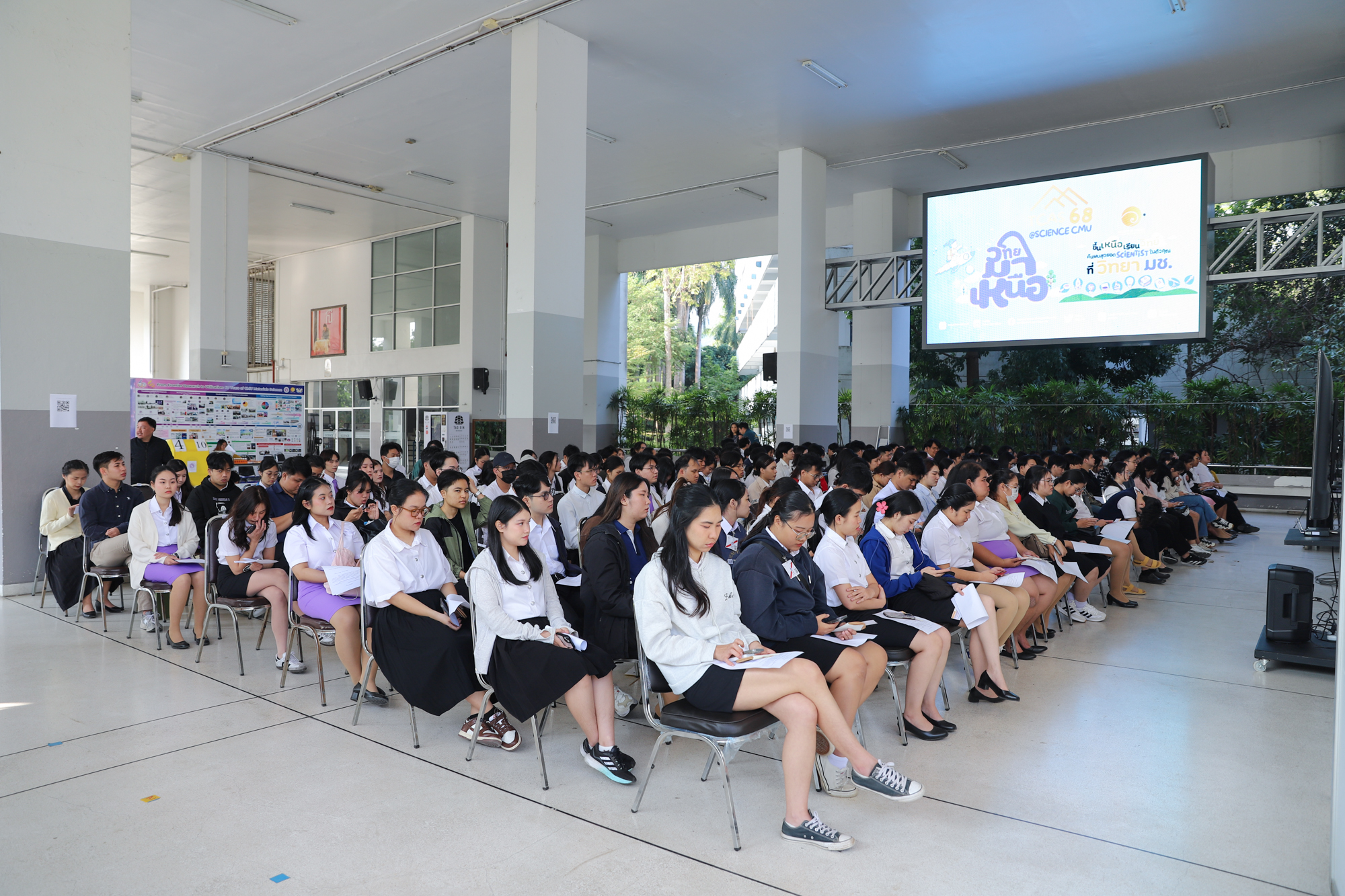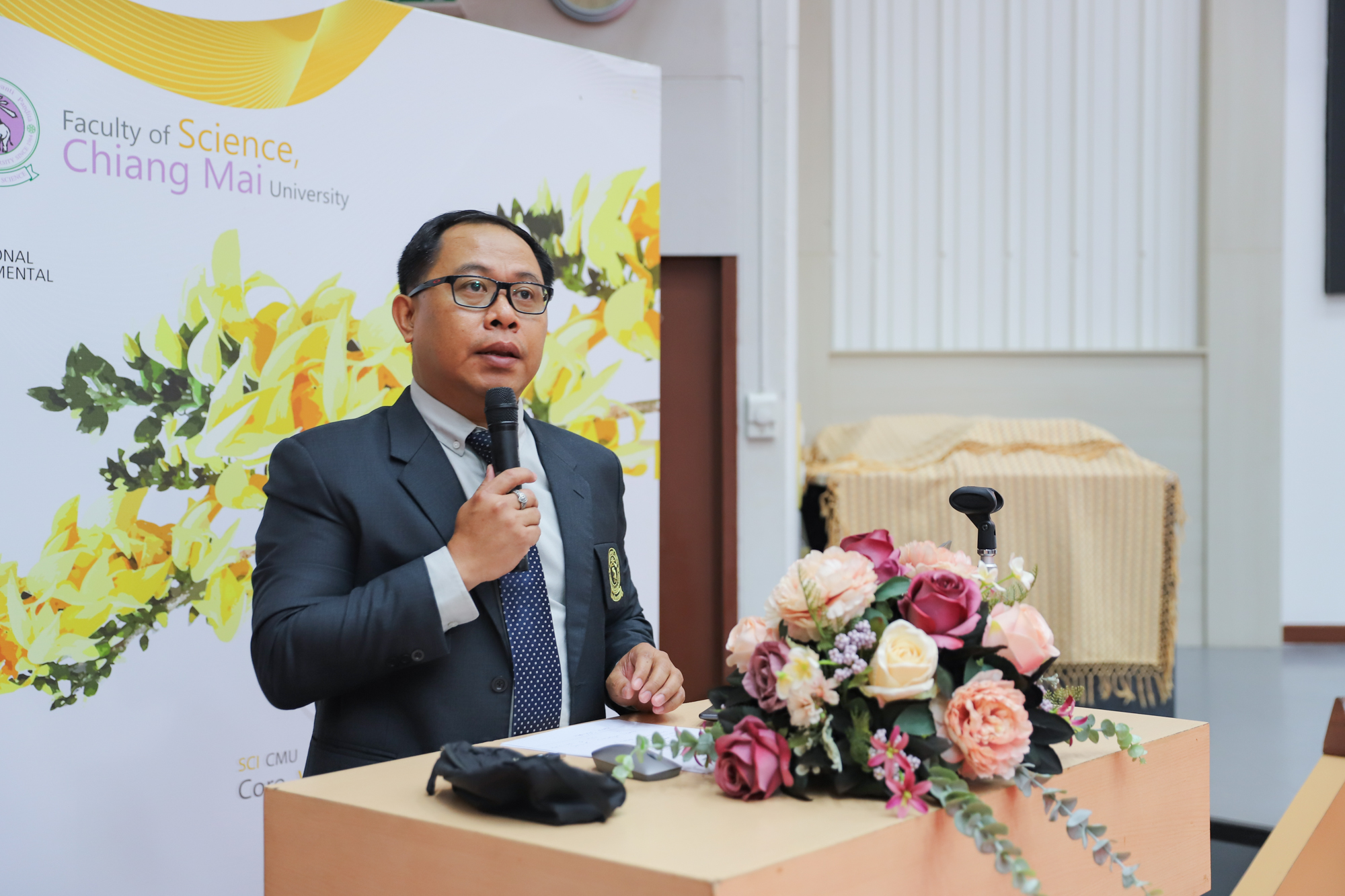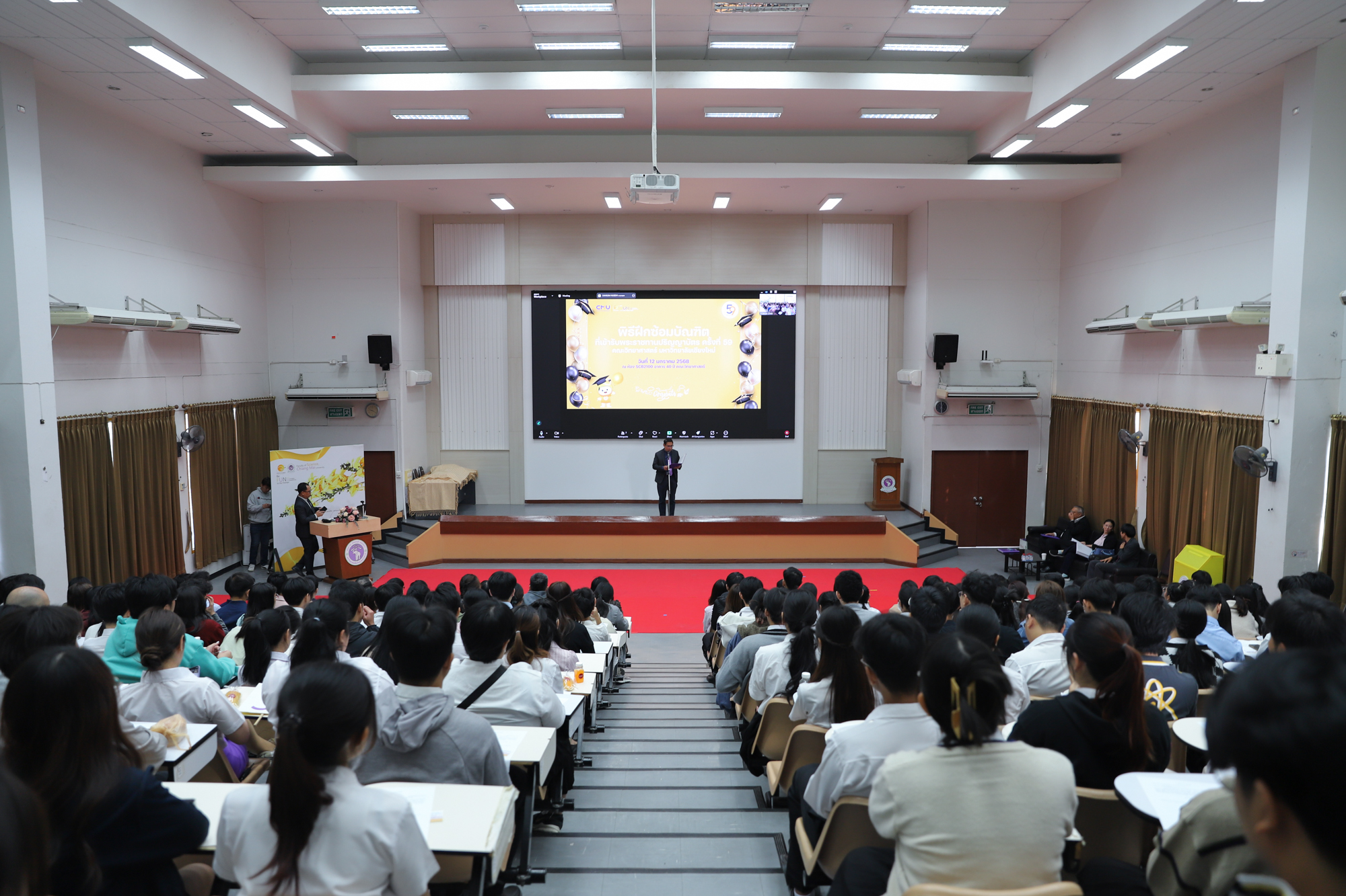 ศาสตราจารย์ (เชี่ยวชาญพิเศษ) ดร.ธรณินทร์ ไชยเรืองศรี คณบดีคณะวิทยาศาสตร์ และคุณพร้อมพร อิศรางกูร ณ อยุธยา นายกสมาคมนักศึกษาเก่าคณะวิทยาศาสตร์ กล่าวต้อนรับ และแสดงความยินดีกับบัณฑิตใหม่ของคณะวิทยาศาสตร์ ที่จะเข้ารับพระราชทานปริญญาบัตร ครั้งที่ 59 ของมหาวิทยาลัยเชียงใหม่ ในวันที่ 15-16 มกราคม 2568 ในการฝึกซ้อมเข้ารับพระราชทานปริญญาบัตรของบัณฑิตคณะวิทยาศาสตร์ เมื่อวันที่ 12 มกราคม 2568 ณ ห้องบรรยาย SCB2100 อาคาร 40 ปี คณะวิทยาศาสตร์