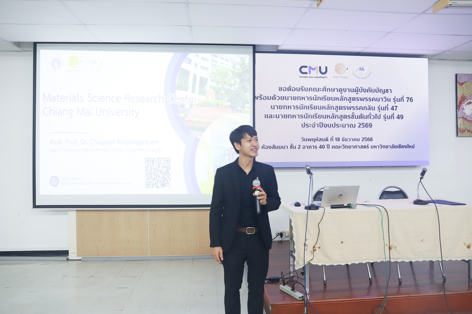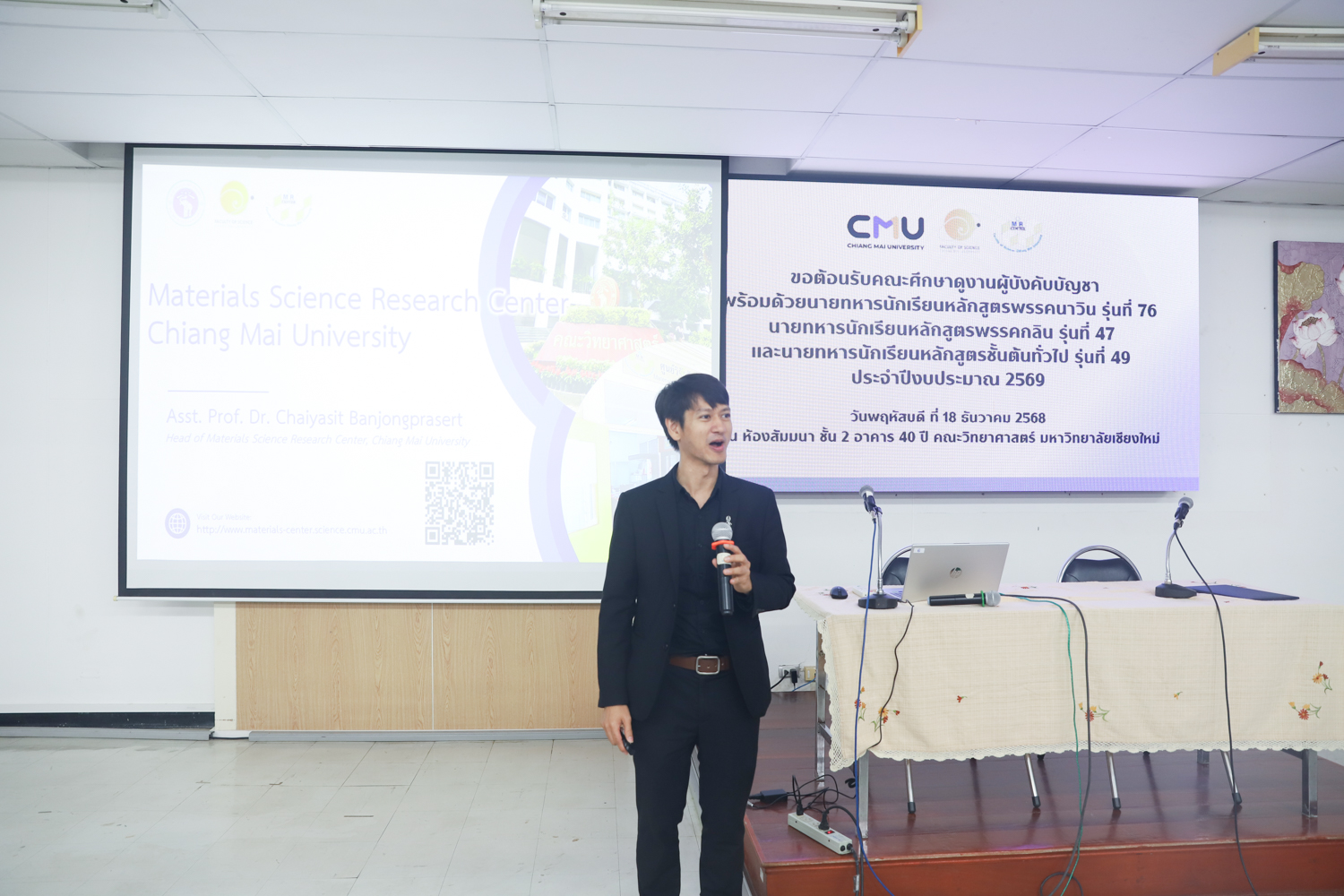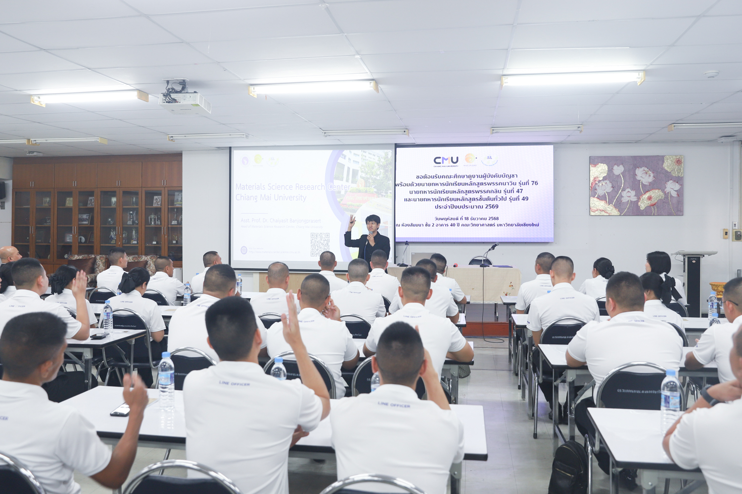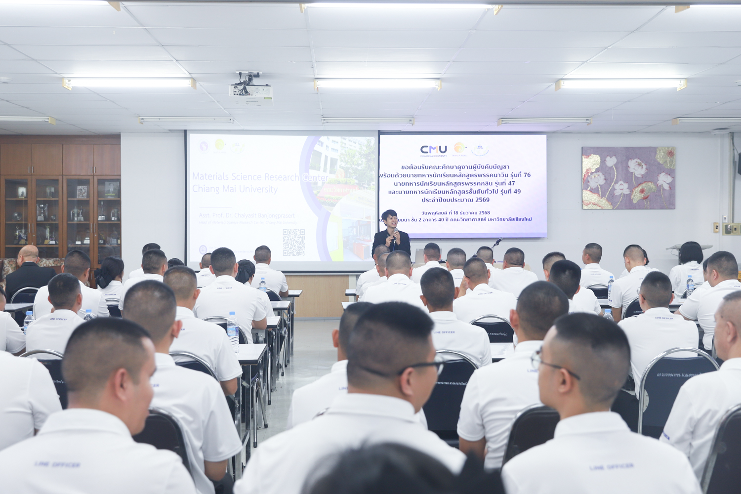 ผู้ช่วยศาสตราจารย์ ดร.ชัยสิทธิ์ บรรจงประเสริฐ หัวหน้าศูนย์วิจัยวัสดุศาสตร์ คณะวิทยาศาสตร์ มหาวิทยาลัยเชียงใหม่ กล่าวต้อนรับ พร้อมกับบรรยายแนะนำภาพรวมศูนย์วิจัยวัสดุศาสตร์ คณะวิทยาศาสตร์ ให้แก่คณะผู้บังคับบัญชาพร้อมด้วยนายทหารนักเรียน หลักสูตรพรรคนาวิน รุ่นที่ 76 นายทหารนักเรียนหลักสูตรพรรคกลิน รุ่นที่ 47 และนายทหารนักเรียน หลักสูตรชั้นต้นทั่วไป รุ่นที่ 49 ประจำปีงบประมาณ 2569 ในโอกาสเข้าศึกษาดูงานด้านวัสดุศาสตร์ และเยี่ยมชมห้องปฏิบัติการของคณะวิทยาศาสตร์ ในวันพฤหัสบดีที่ 18 ธันวาคม 2568 ณ ห้องสัมมนา ชั้น 2 อาคาร 40 ปี คณะวิทยาศาสตร์ และหน่วยงานที่เกี่ยวข้อง