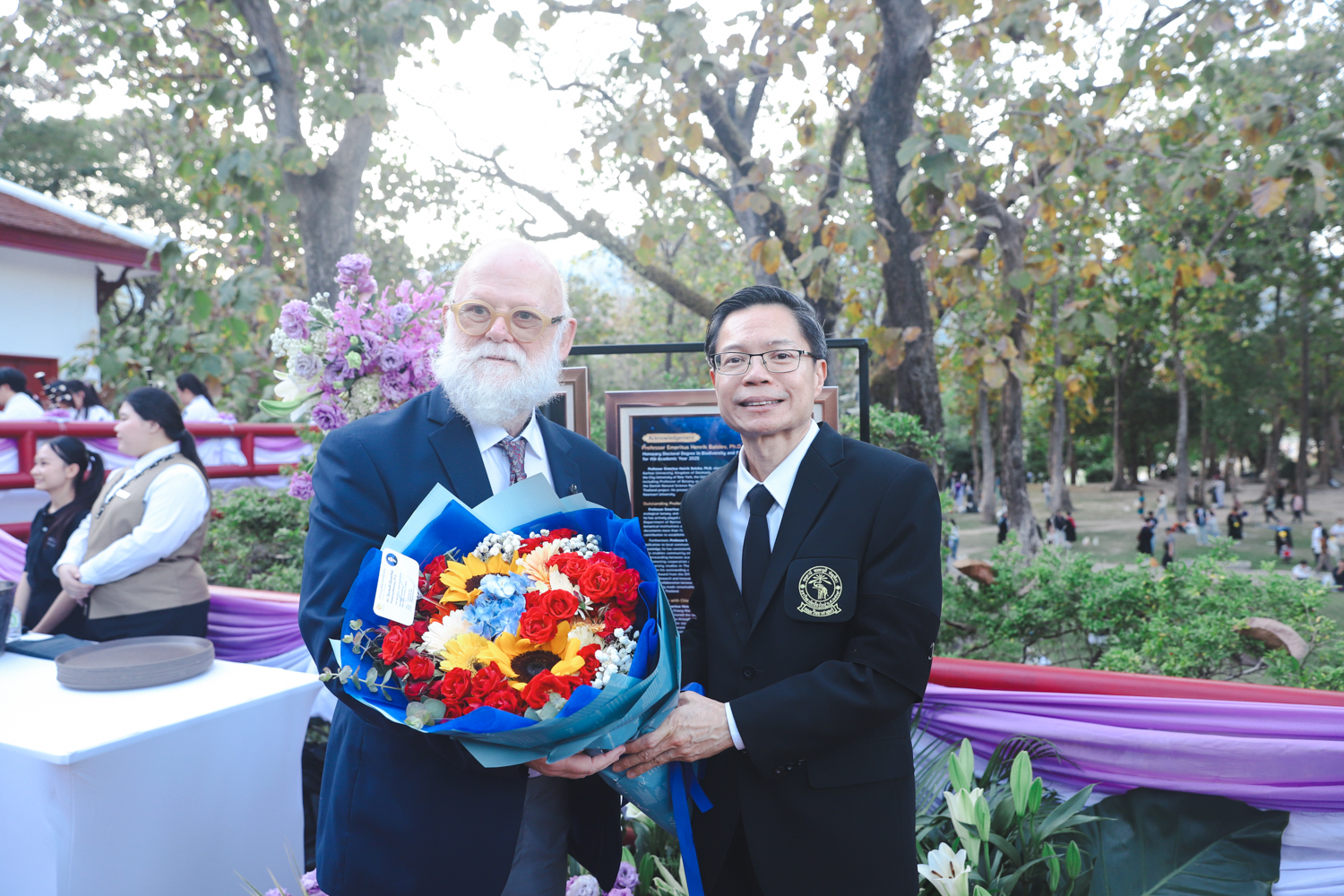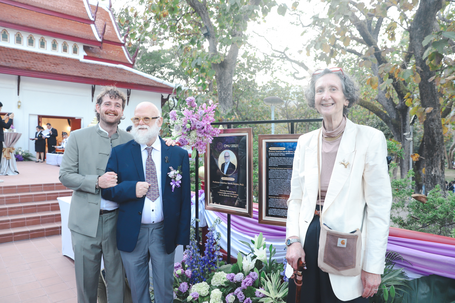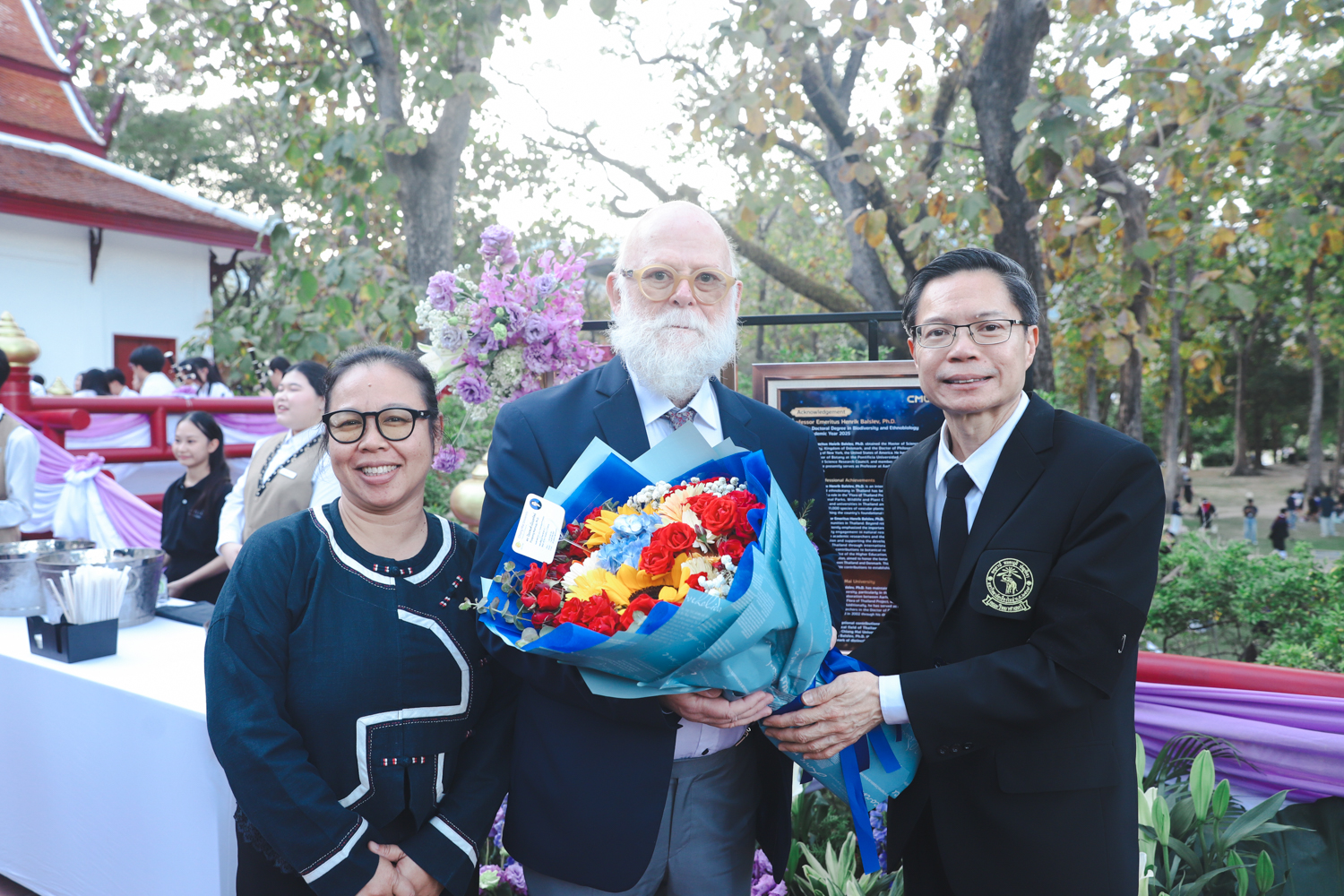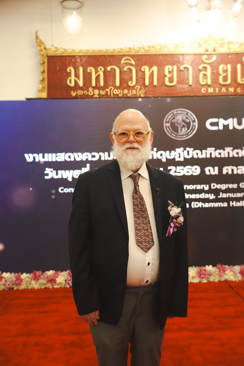 ในโอกาสนี้ ได้รับเกียรติจาก ศาสตราจารย์พิเศษ ดร.สุรเกียรติ์ เสถียรไทย นายกสภามหาวิทยาลัยเชียงใหม่ กล่าวแสดงความยินดี มอบเกียรติบัตร และมอบดอกไม้ ศาสตราจารย์ ดร.นพ.พงษ์รักษ์ ศรีบัณฑิตมงคล อธิการบดีมหาวิทยาลัยเชียงใหม่ มอบภาพถ่ายฯ พร้อมด้วย นายสุมิตร เพชราภิรัชต์ นายกสมาคมนักศึกษาเก่ามหาวิทยาลัยเชียงใหม่ คุณนารีรัตน์ จันทรมังกร ประธานกรรมการส่งเสริมมหาวิทยาลัยเชียงใหม่ มอบของที่ระลึกแก่ผู้ที่ได้รับพระราชทานปริญญากิตติมศักดิ์