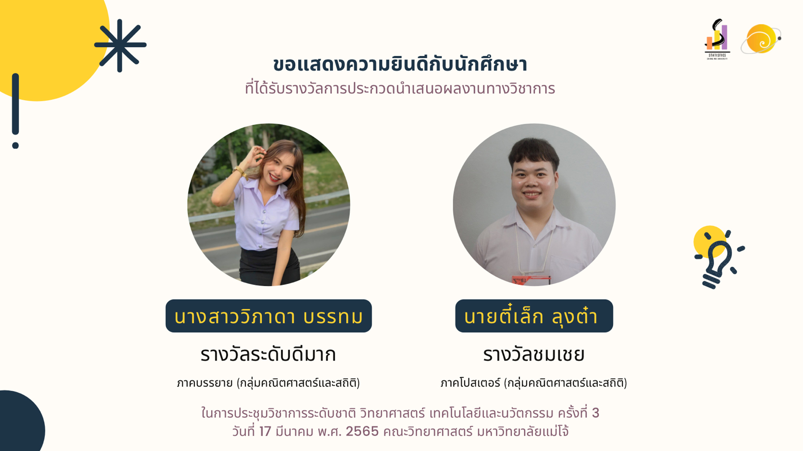 นักศึกษาสถิติได้รับรางวัลการนำเสนอผลงานทางวิชาการ ในการประชุมวิชาการระดับชาติ วิทยาศาสตร์ เทคโนโลยีและนวัตกรรม ครั้งที่ 3 ณ ม.แม่โจ้
