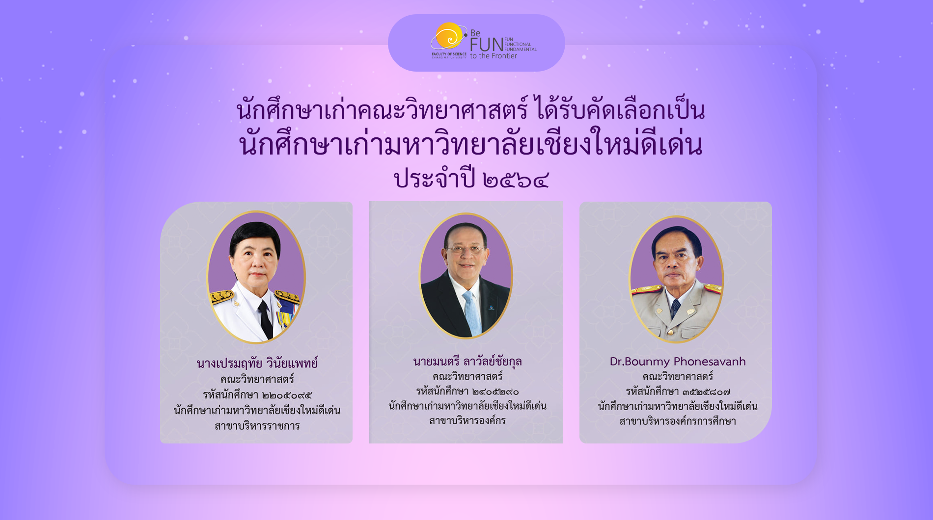 นักศึกษาเก่าคณะวิทยาศาสตร์ ได้รับคัดเลือกเป็นนักศึกษาเก่ามหาวิทยาลัยเชียงใหม่ดีเด่น ประจำปี ๒๕๖๔