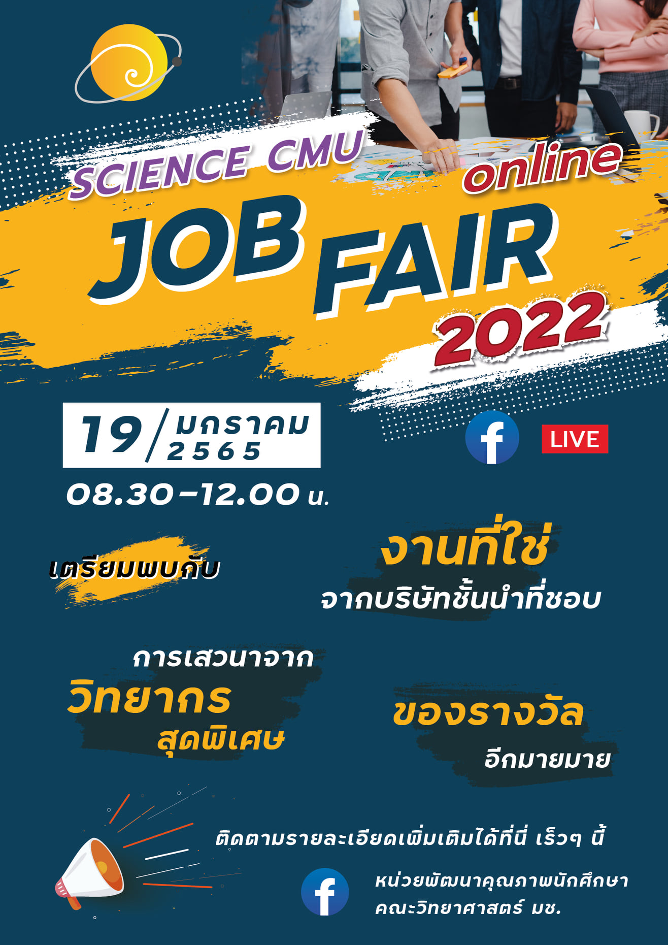 19 มกราคม 2565 ขอเชิญนักศึกษาชั้นปีที่ 4 ศิษย์เก่า และสถานประกอบการ เข้าร่วมกิจกรรม Science CMU Job Fair Online 2022