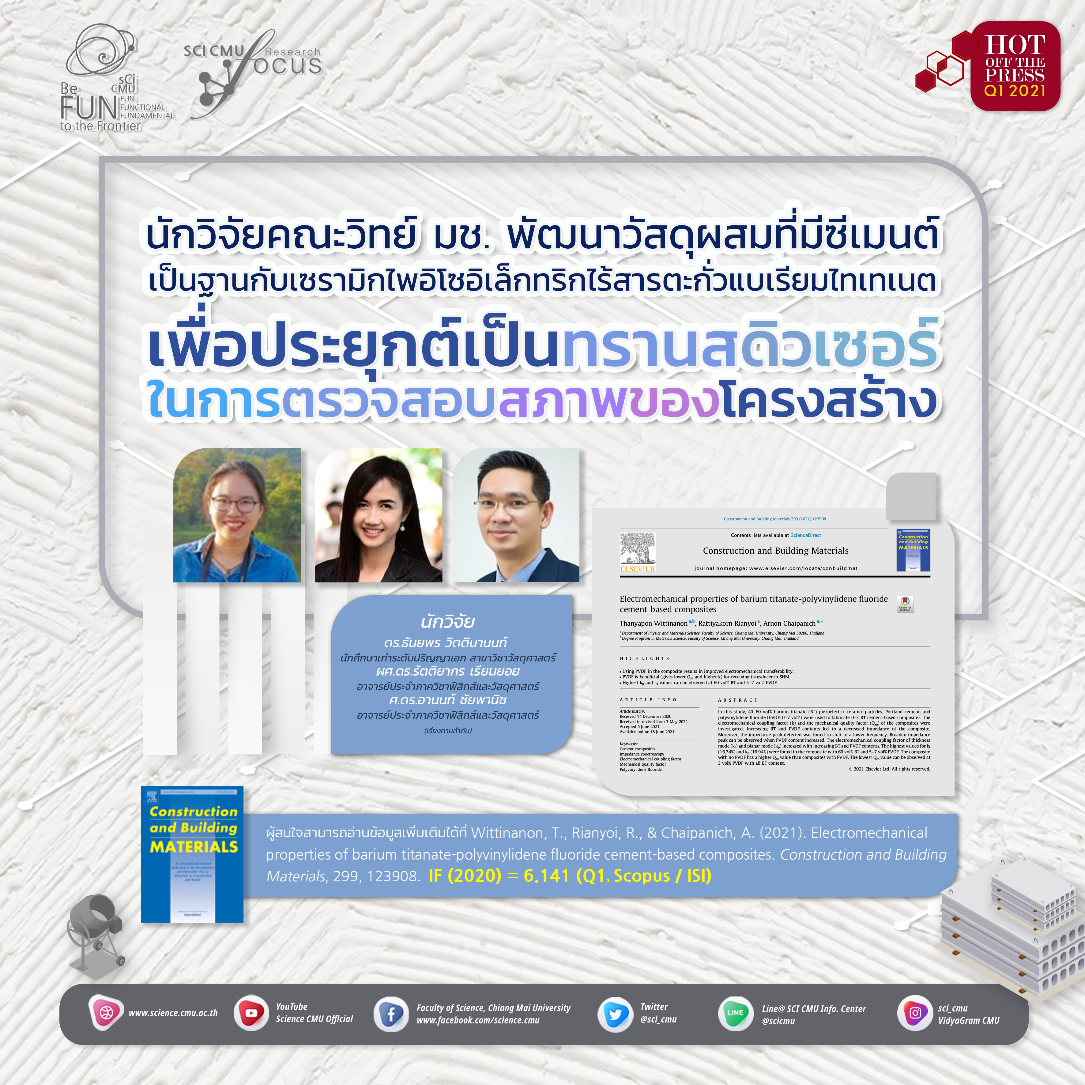 นักวิจัยคณะวิทย์ มช. พัฒนาวัสดุผสมที่มีซีเมนต์เป็นฐานกับเซรามิกไพอิโซอิเล็กทริกไร้สารตะกั่วแบเรียมไทเทเนต เพื่อประยุกต์เป็นทรานสดิวเซอร์ในการตรวจสอบสภาพของโครงสร้าง