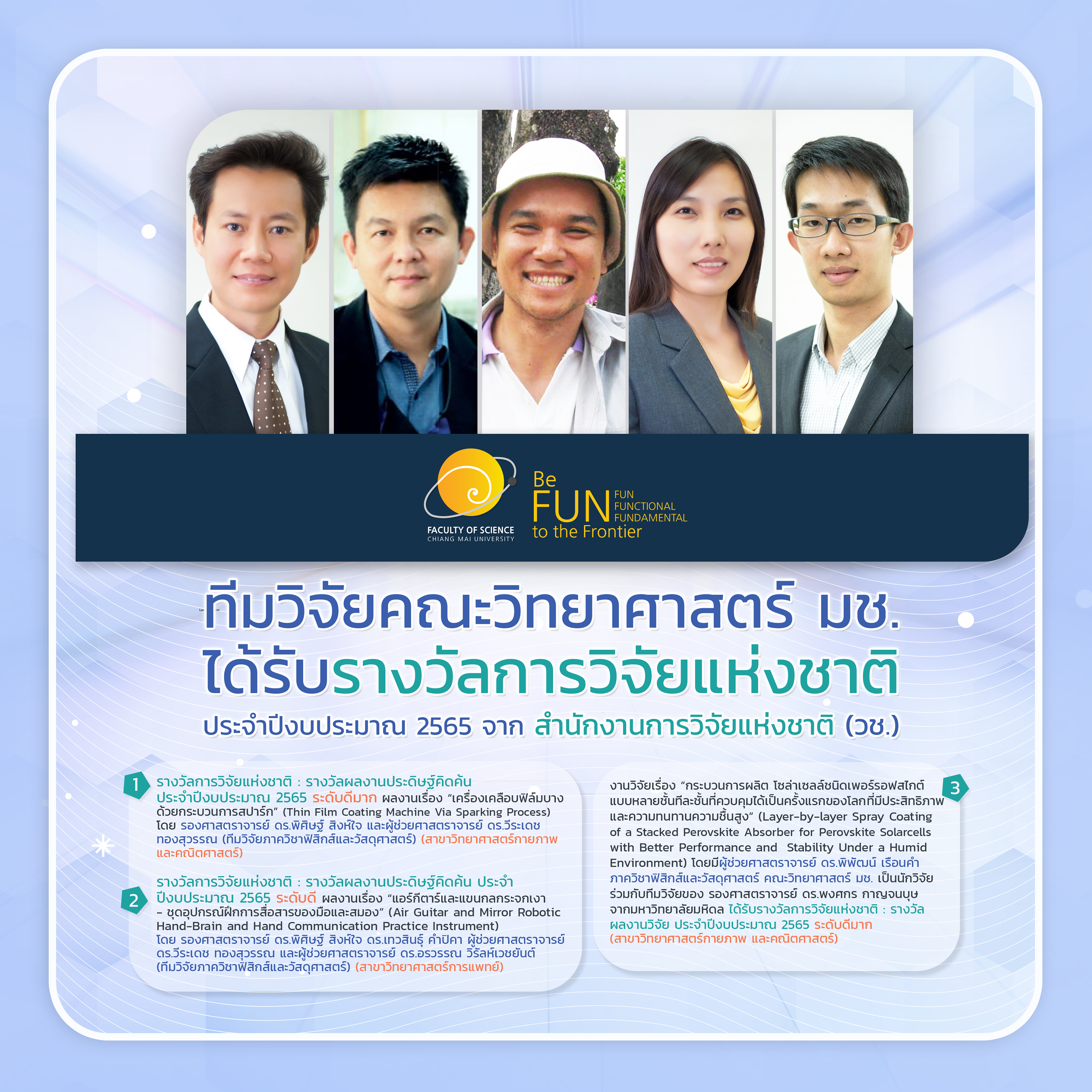 ทีมวิจัยคณะวิทยาศาสตร์ มช. คว้ารางวัลการวิจัยแห่งชาติ ประจำปีงบประมาณ 2565 จากสำนักงานการวิจัยแห่งชาติ (วช.)
