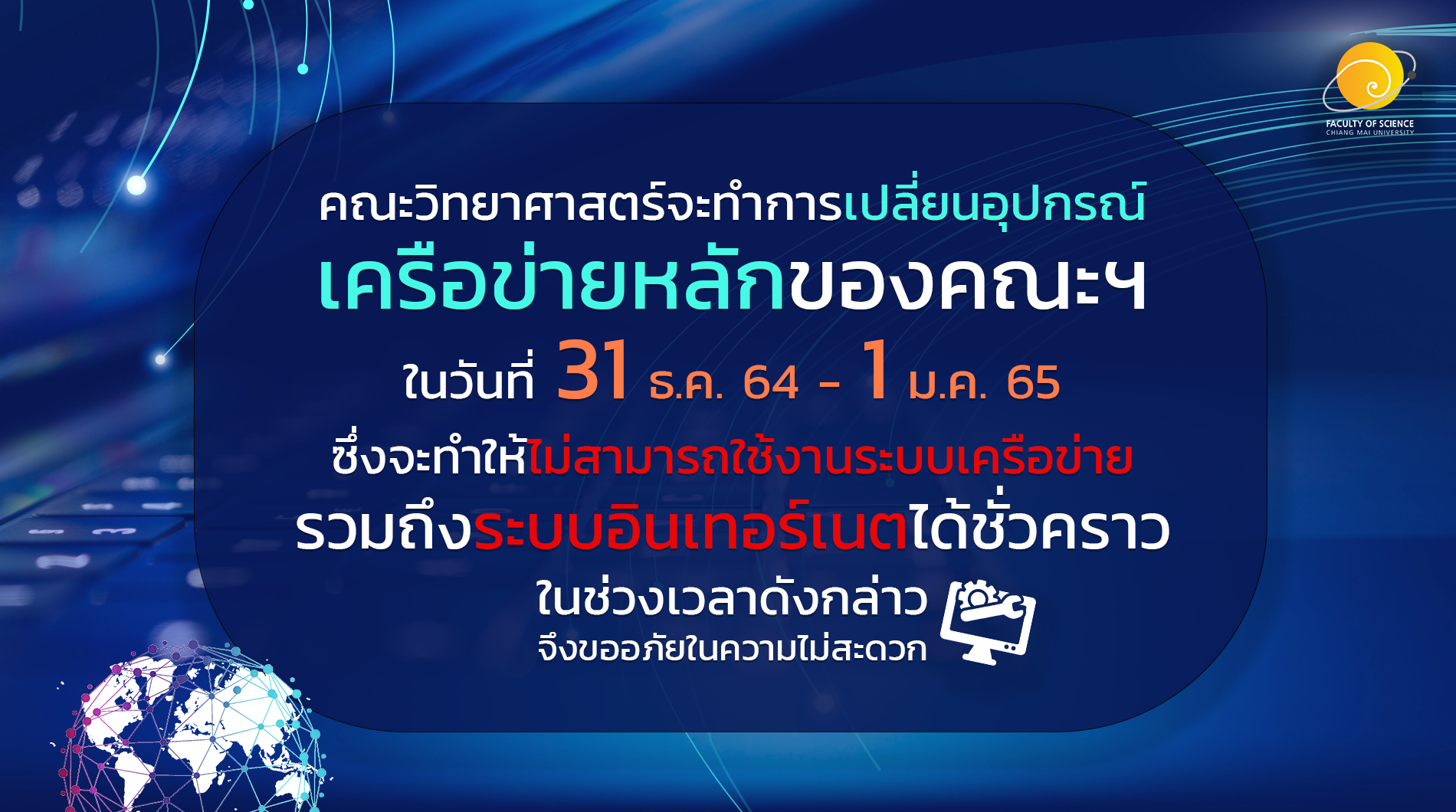 คณะวิทยาศาสตร์จะทำการเปลี่ยนอุปกรณ์เครือข่ายหลักของคณะฯ ในวันที่ 31 ธ.ค. 64 - 1 ม.ค. 65