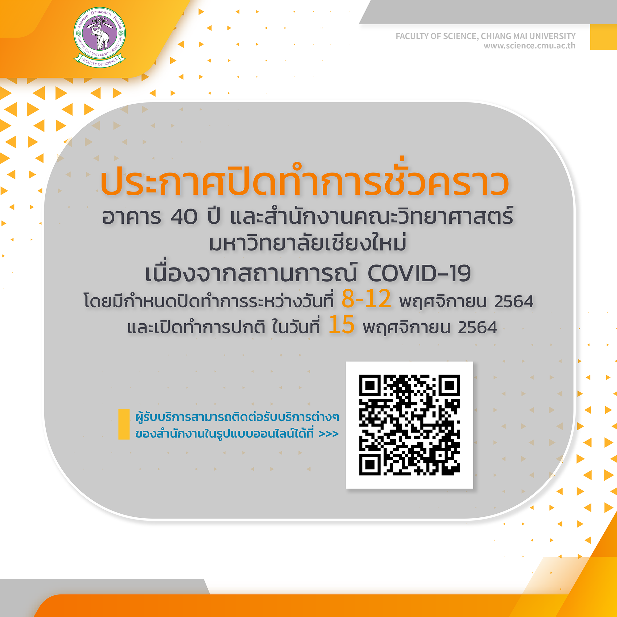 ประกาศปิดทำการชั่วคราว อาคาร 40 ปี และสำนักงานคณะวิทยาศาสตร์ ระหว่างวันที่ 8-12 พฤศจิกายน 2564