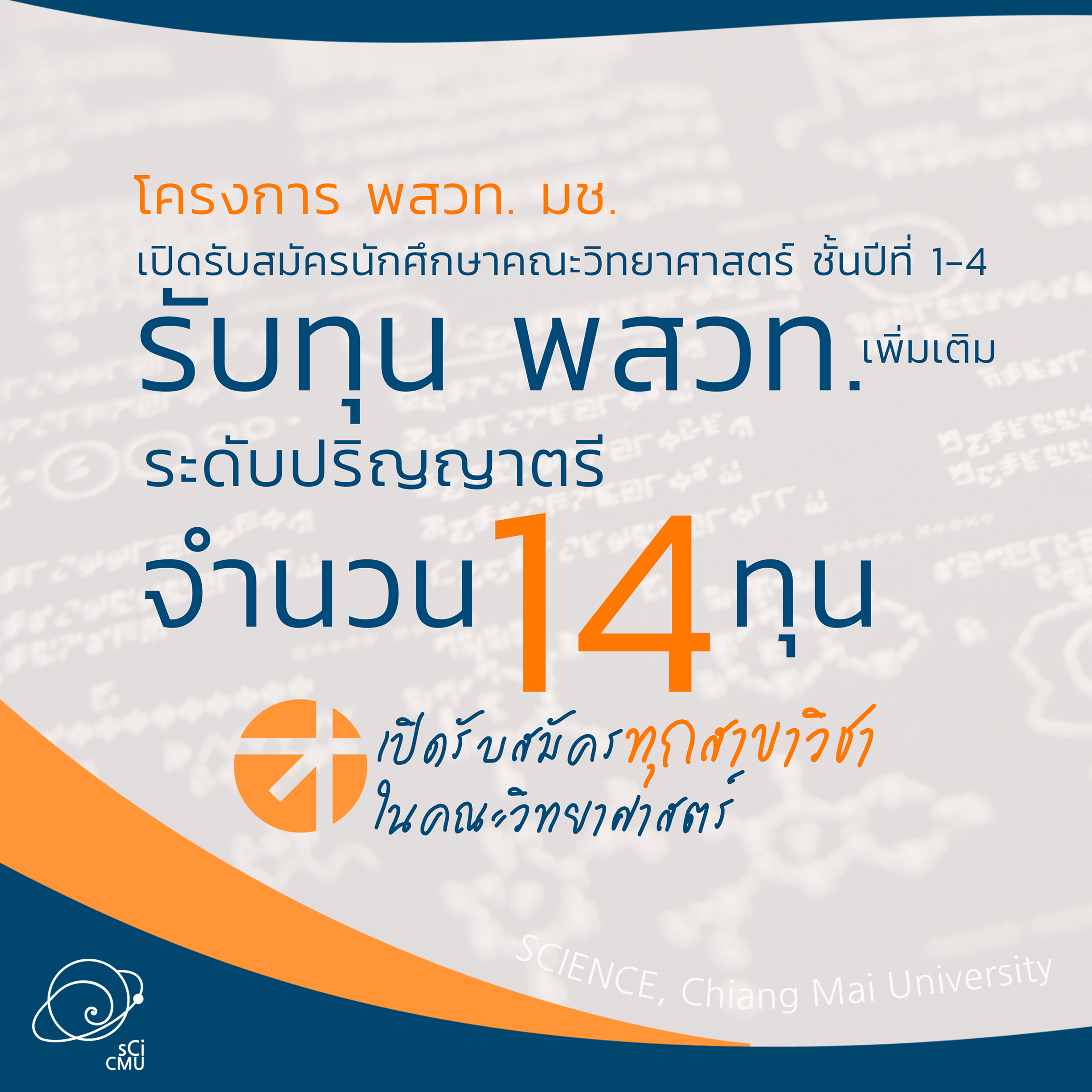 โครงการ พสวท. มช. เปิดรับสมัครนักศึกษาคณะวิทยาศาสตร์ ชั้นปีที่ 1-4 รับทุน พสวท. (เพิ่มเติม) ระดับปริญญาตรี จำนวน 14 ทุน