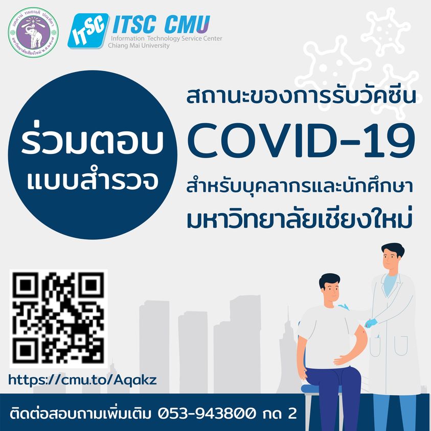 ขอความร่วมมือบุคลากรและนักศึกษา มช. ทั้งที่อยู่ในจังหวัดเชียงใหม่ และเดินทางกลับมาจากต่างจังหวัด ตอบแบบสำรวจสถานะของการรับวัคซีน COVID-19