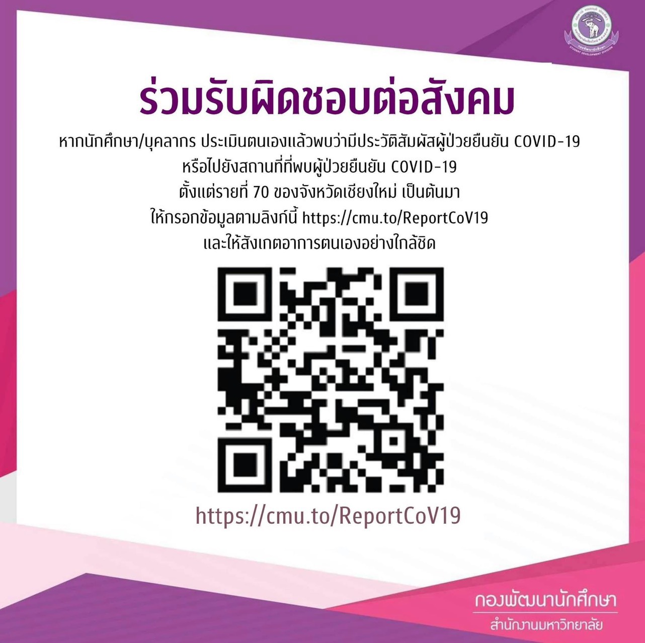 ขอความร่วมมือนักศึกษาและบุคลากรที่มีประวัติสัมผัสผู้ป่วย COVID-19 หรือไปยังสถานที่ที่พบผู้ป่วยยืนยัน COVID-19 (ตั้งแต่รายที่ 70 เป็นต้นมา) กรอกข้อมูล