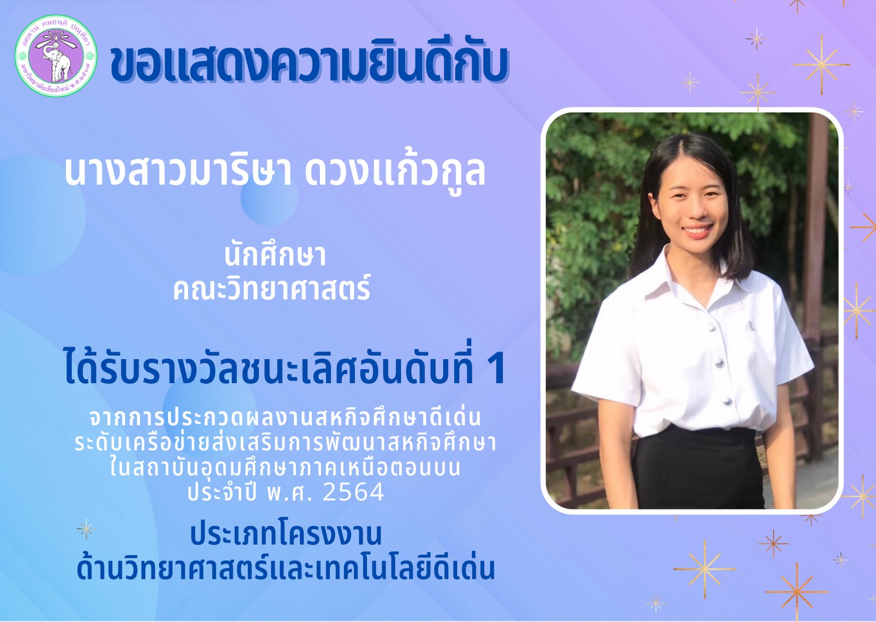 นักศึกษาคณะวิทยาศาสตร์ได้รับรางวัลชนะเลิศอันดับที่ 1 การประกวดผลงานสหกิจศึกษาฯ ภาคเหนือตอนบนฯ