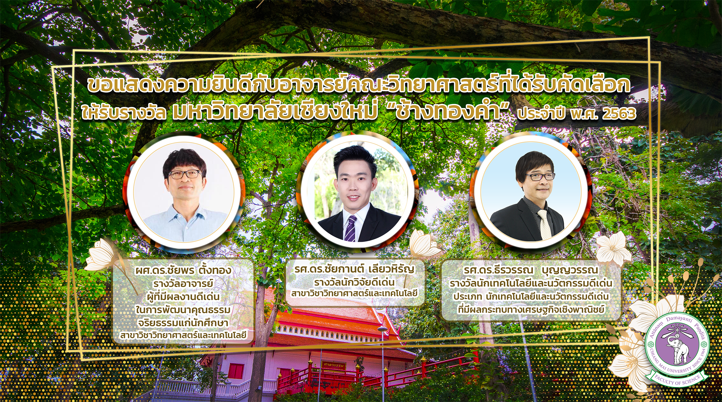 คณะวิทยาศาสตร์ขอแสดงความยินดีกับอาจารย์คณะวิทยาศาสตร์ที่ได้รับคัดเลือกให้รับรางวัล มหาวิทยาลัยเชียงใหม่ ช้างทองคำ ประจำปี พ.ศ. 2563