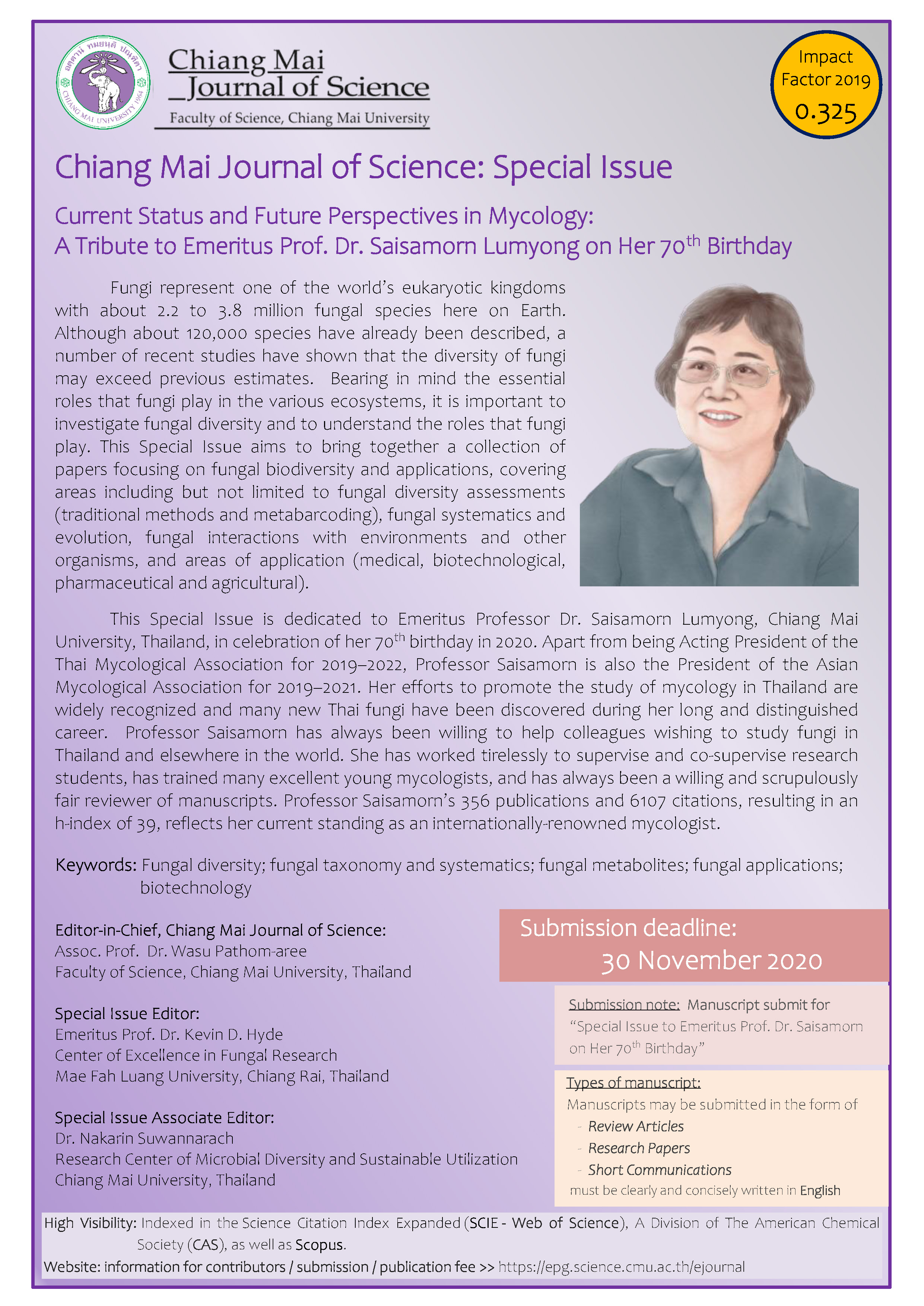 Chiang Mai Journal of Science: Special Issue Current Status and Future Perspectives in Mycology: A Tribute to Emeritus Prof. Dr. Saisamorn Lumyong on Her 70th Birthday