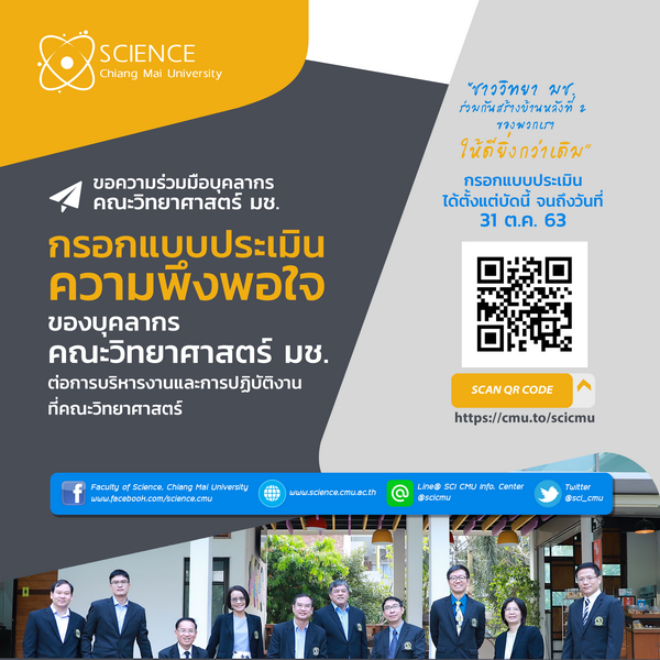 ขอความร่วมมือบุคลากรคณะวิทยาศาสตร์ มช. กรอกแบบประเมินความพึงพอใจของบุคลากรคณะวิทยาศาสตร์ ต่อการบริหารงานและการปฏิบัติงานที่คณะวิทยาศาสตร์