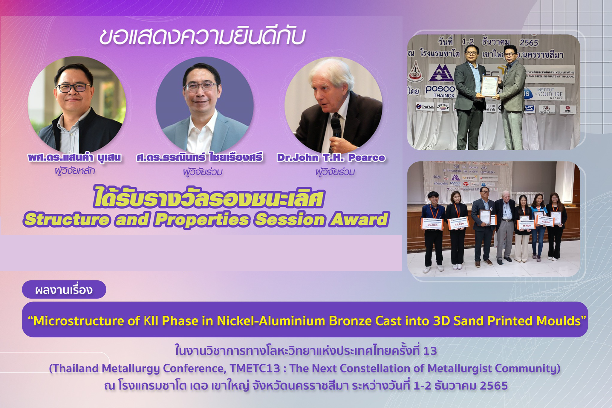 นักวิจัยคณะวิทยาศาสตร์ได้รับรางวัลรองชนะเลิศ Structure and Properties Session Award ในงานการประชุมวิชาการทางโลหะวิทยาแห่งประเทศไทยครั้งที่ 13