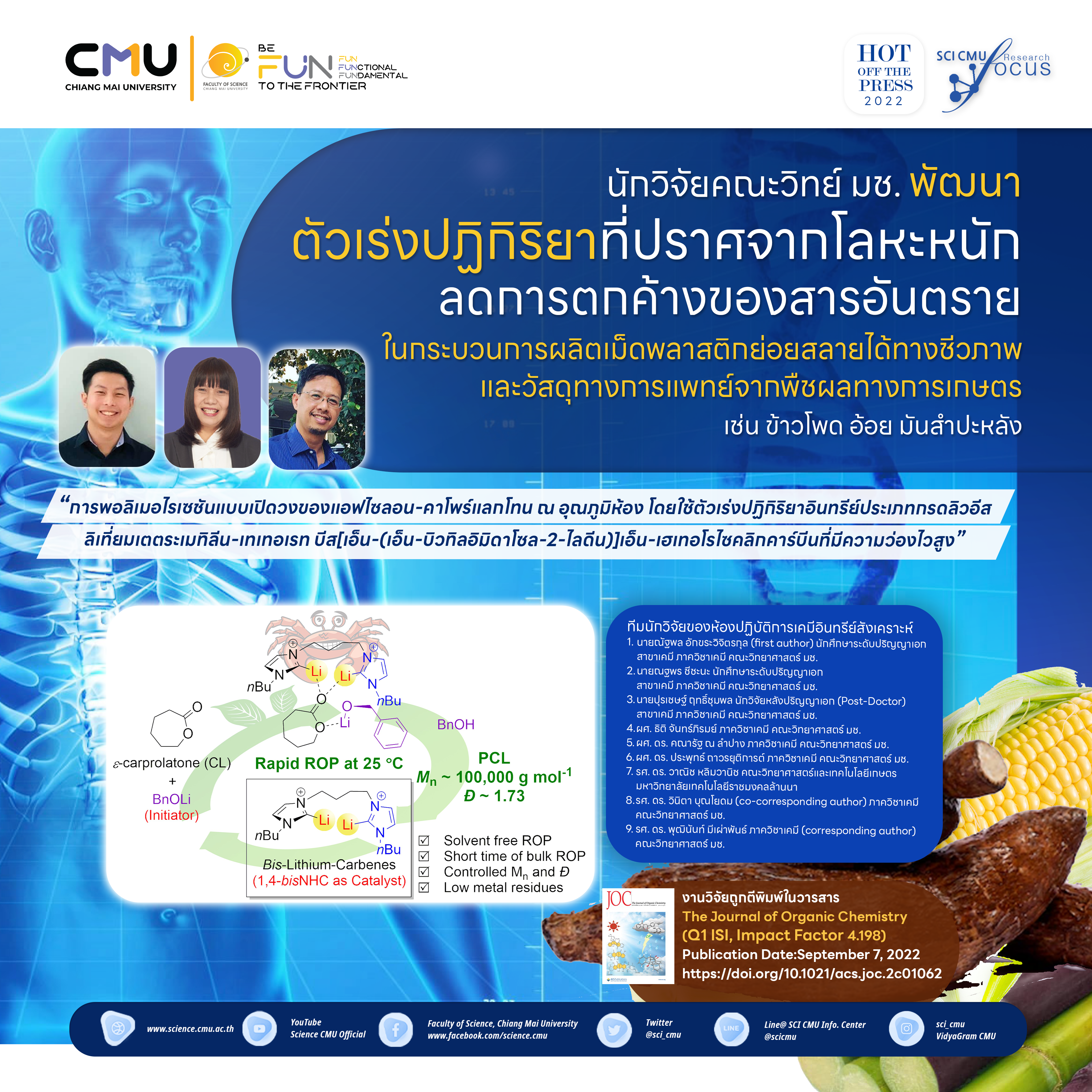 นักวิจัยคณะวิทย์ มช. พัฒนาตัวเร่งปฏิกิริยาที่ปราศจากโลหะหนัก ลดการตกค้างของสารอันตรายในกระบวนการผลิตเม็ดพลาสติกย่อยสลายได้ทางชีวภาพและวัสดุทางการแพทย์จากพืชผลทางการเกษตร