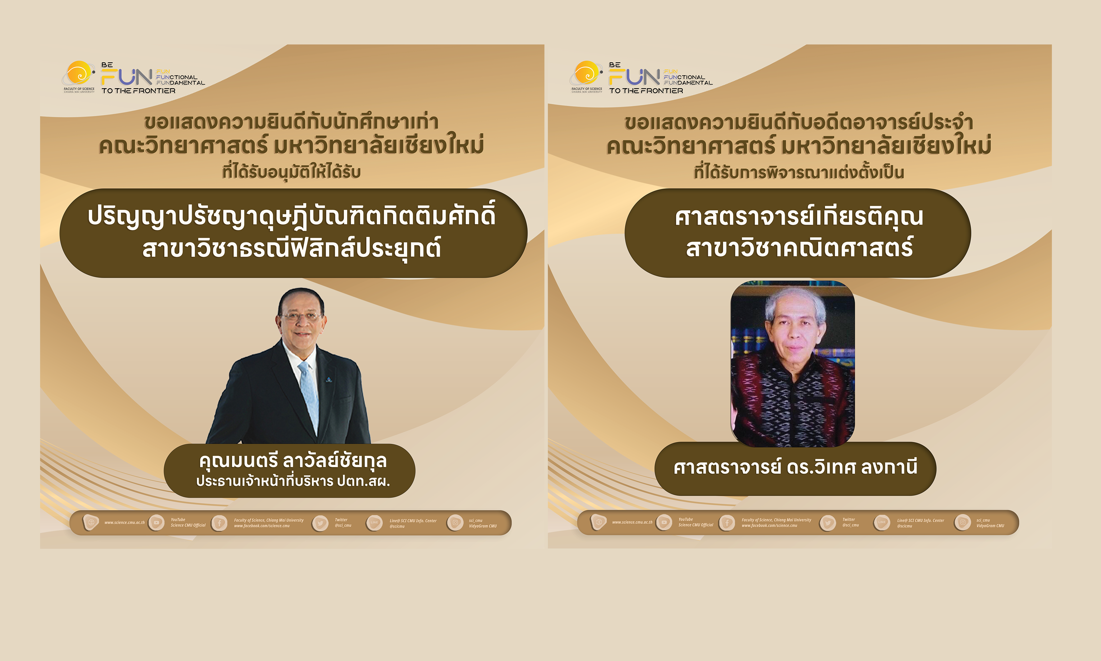 คณะวิทยาศาสตร์ขอแสดงความยินดีกับนักศึกษาเก่าที่ได้รับอนุมัติให้ได้รับปริญญาปรัชญาดุษฎีบัณฑิตกิตติมศักดิ์ และอดีตอาจารย์ที่ได้รับการพิจารณาแต่งตั้งเป็นศาสตราจารย์เกียรติคุณ