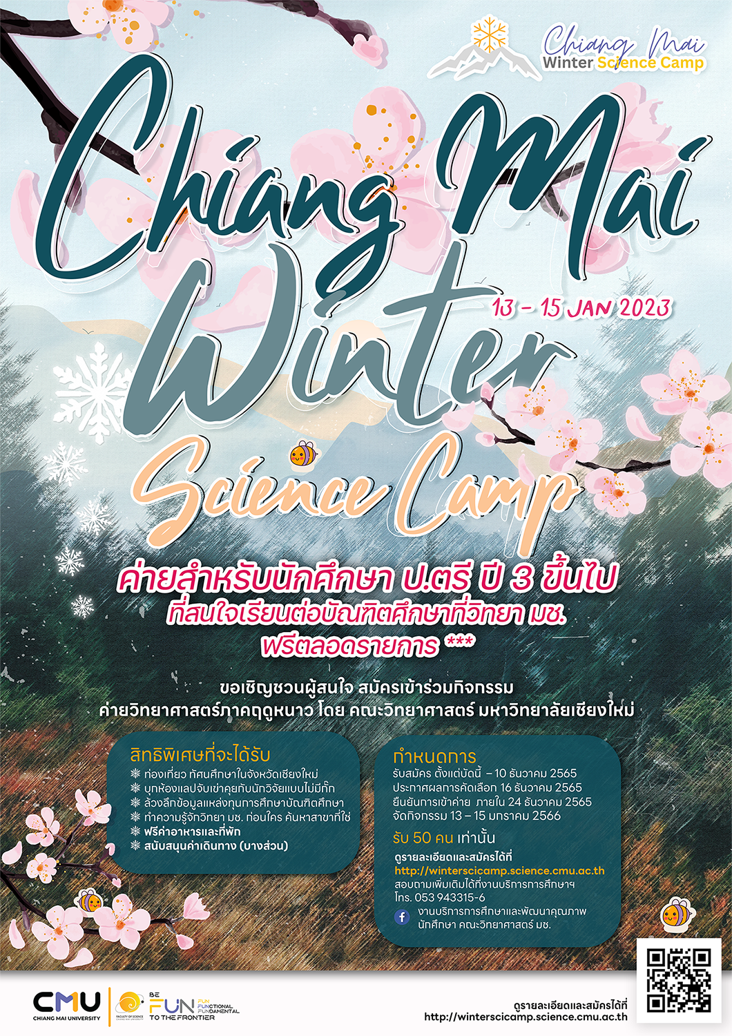 มกราคมนี้ วิทยา มช. ขอเชิญชวนเข้าค่าย Chiang Mai Winter Science Camp ค่ายสำหรับ นศ.ป.ตรี ปี 3 ขึ้นไป และผู้สนใจเรียนต่อบัณฑิตศึกษาที่วิทยา มช. (เข้าค่ายฟรี)