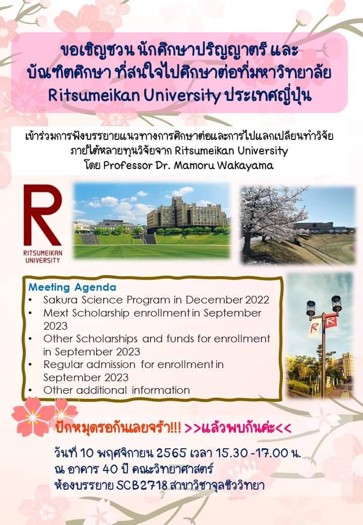 อยากเรียนต่อญี่ปุ่น โอกาสมาถึงแล้ว 10 พ.ย. นี้ ขอเชิญชวนนักศึกษาเข้าฟังการบรรยายแนะแนวการเรียนต่อและทำวิจัย ภายใต้ทุนจาก Ritsumeikan University